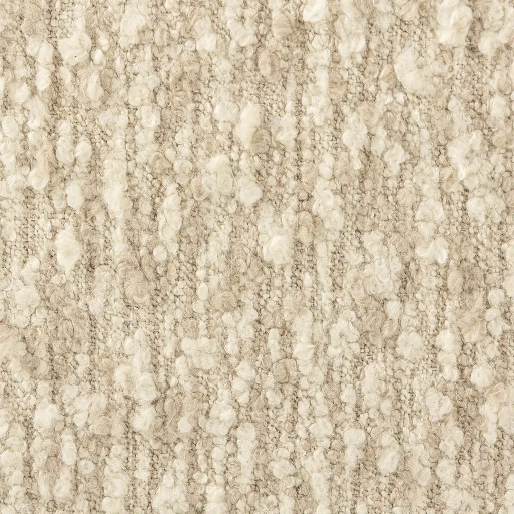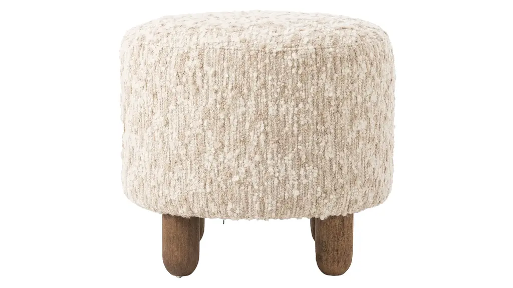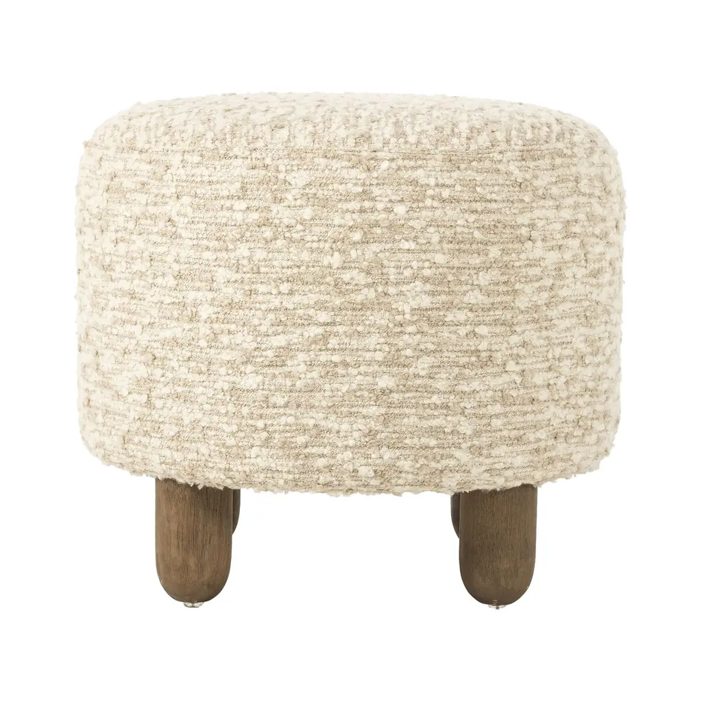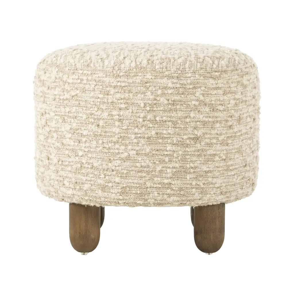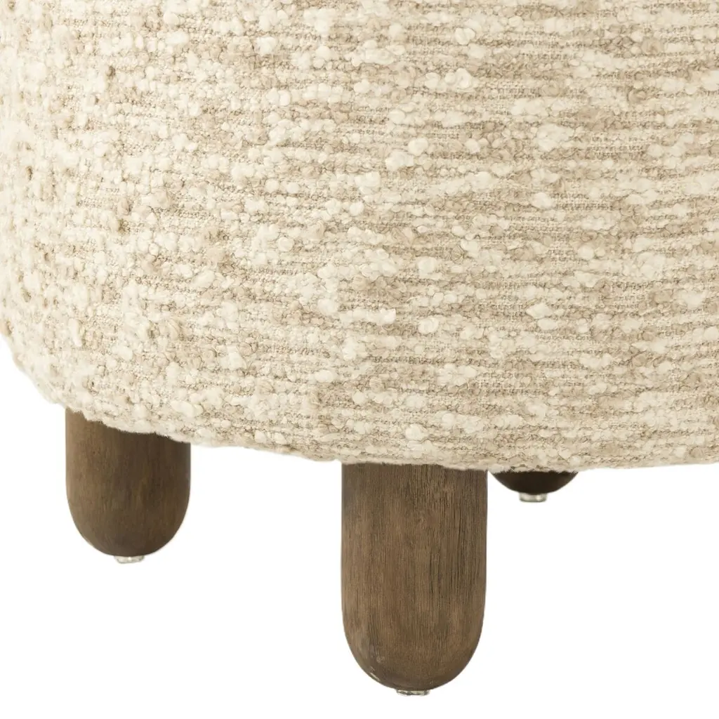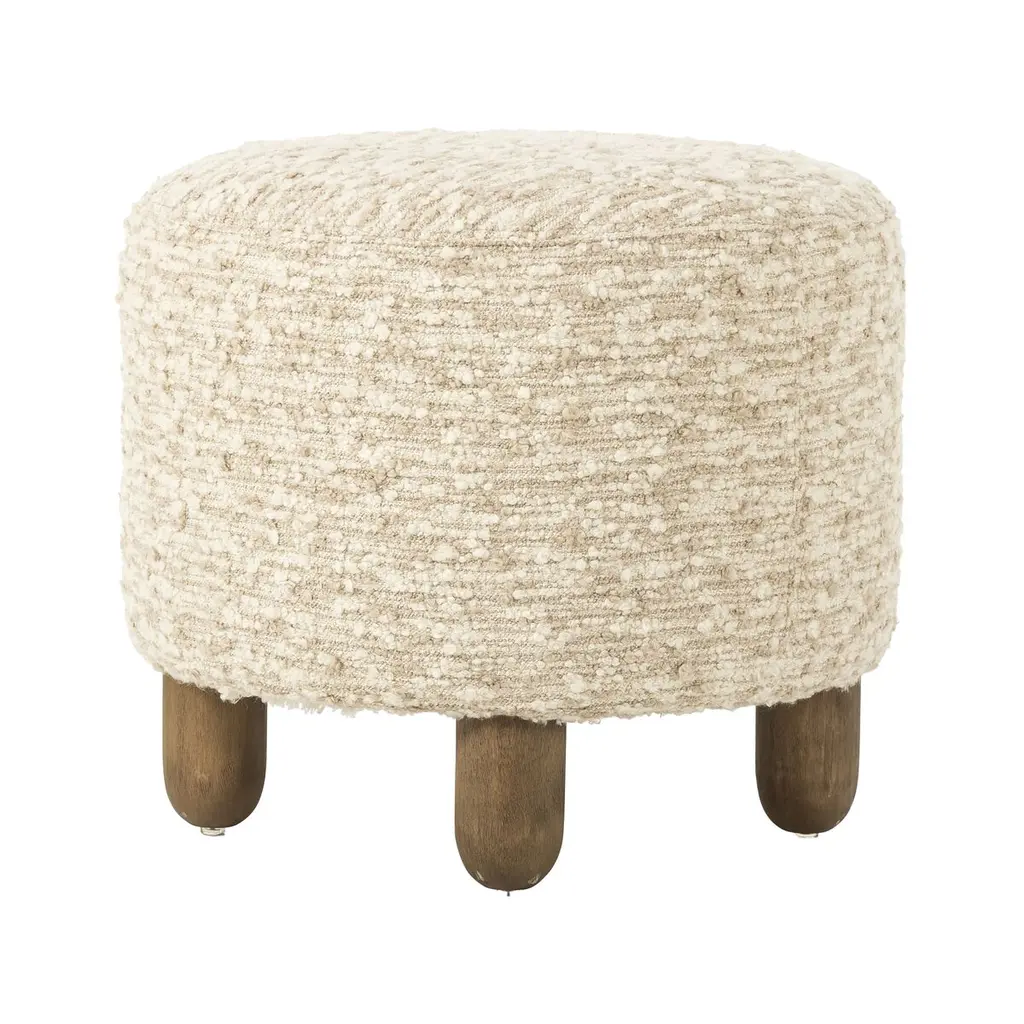 Place this round ottoman just about anywhere for a subtle retro vibe. Upholstered in an exaggerated boucle fabric with extra depth and texture throughout. Parawood legs are wirebrushed for a warm, vintage feel.