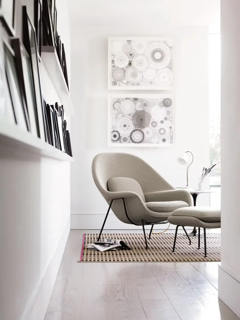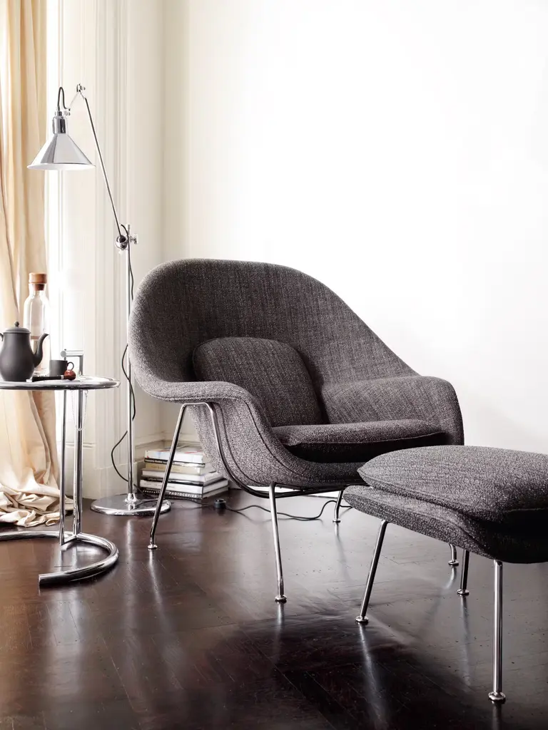 When Florence Knoll challenged Eero Saarinen to create a chair that she could curl up in, she found the right candidate for the task. The Womb Chair and Womb Ottoman (1946) have enveloping forms that continue to be one of the most iconic and recognized representations of midcentury organic modernism. When paired with the lounge, the ottoman perfectly facilitates a relaxed sitting posture. Manufactured by Knoll according to the original specifications of the designer.