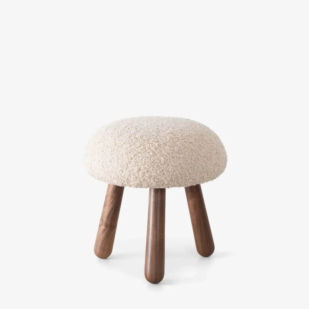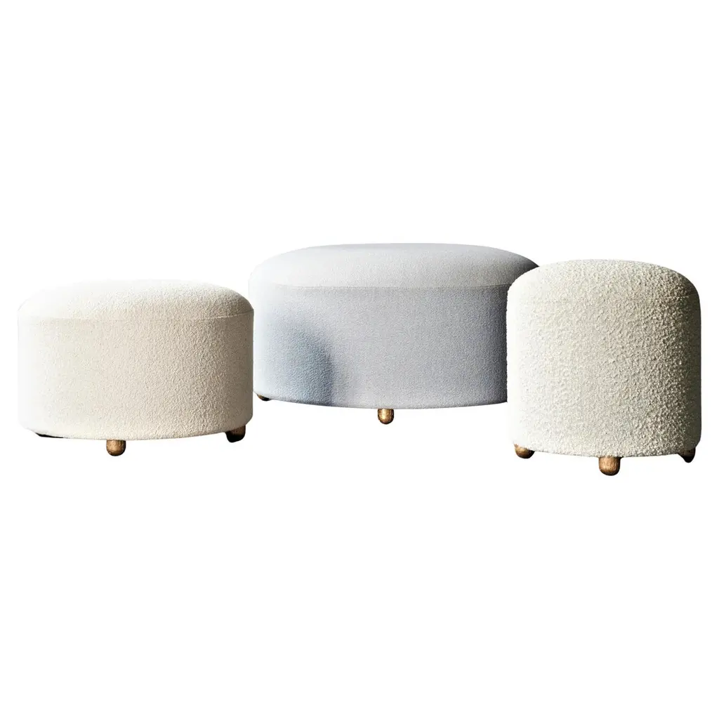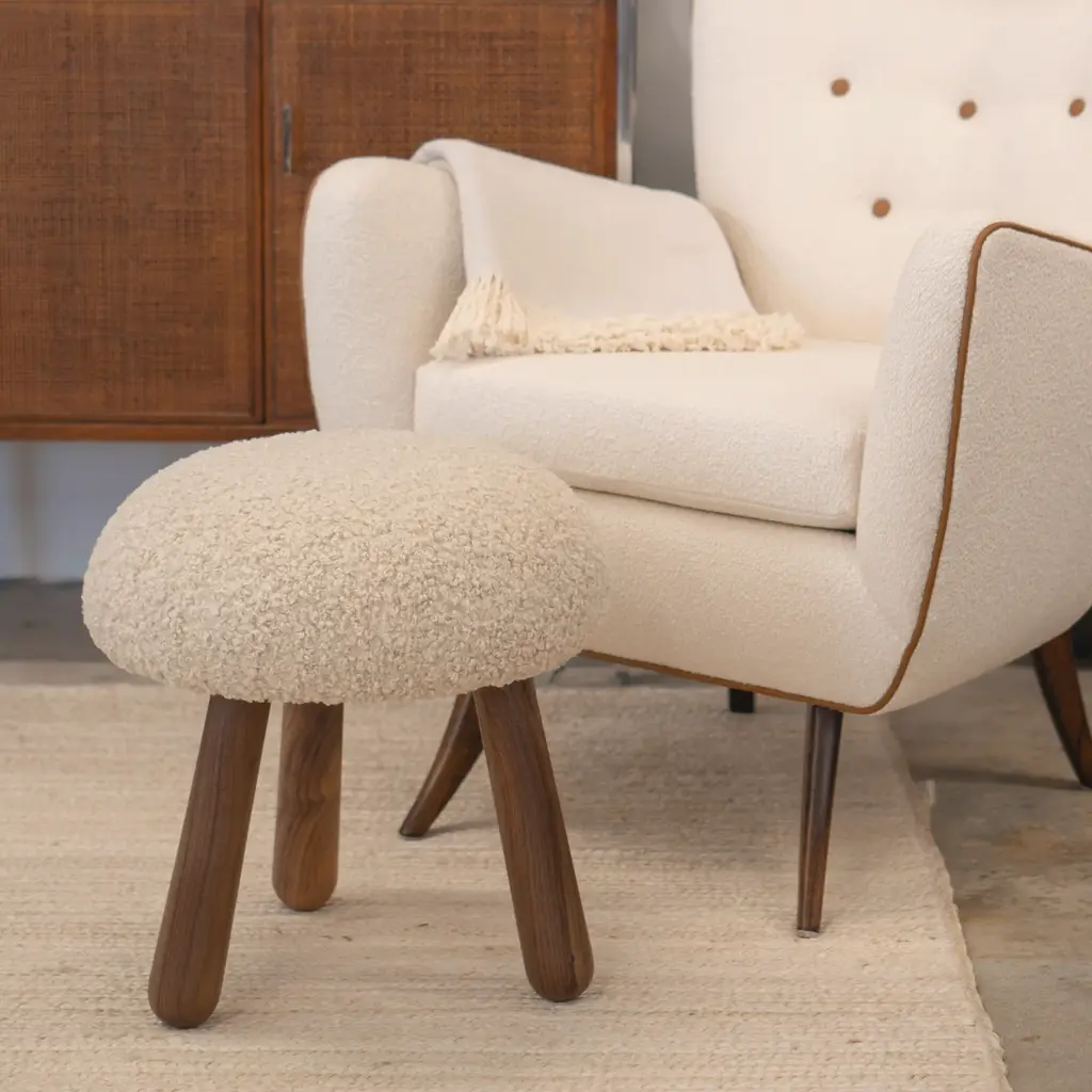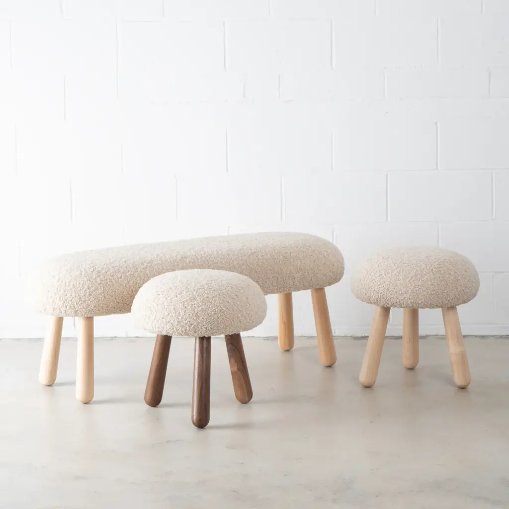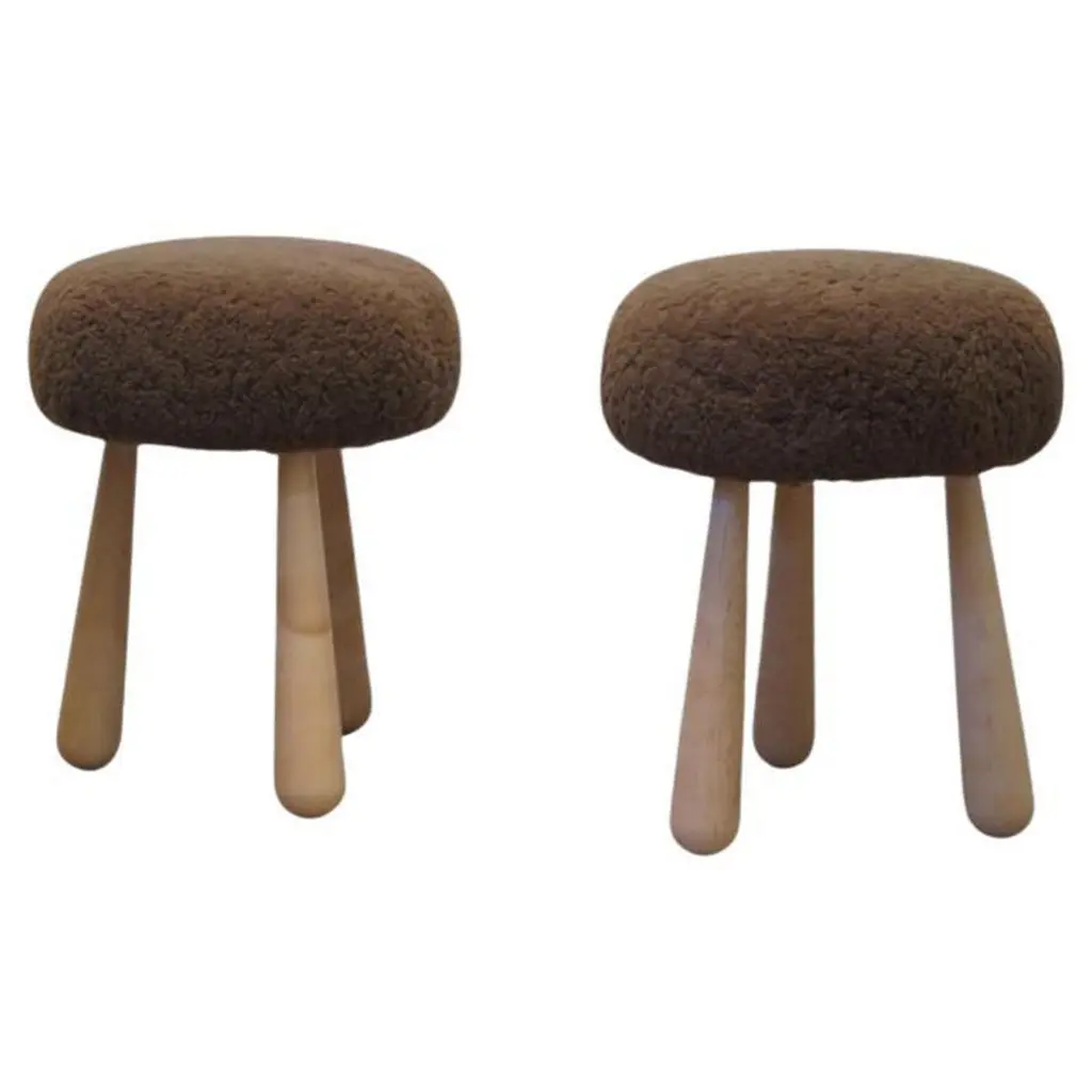 Wooly Ottomans In Natural Faux Lambswool & Walnut By Object Refinery- A Pair