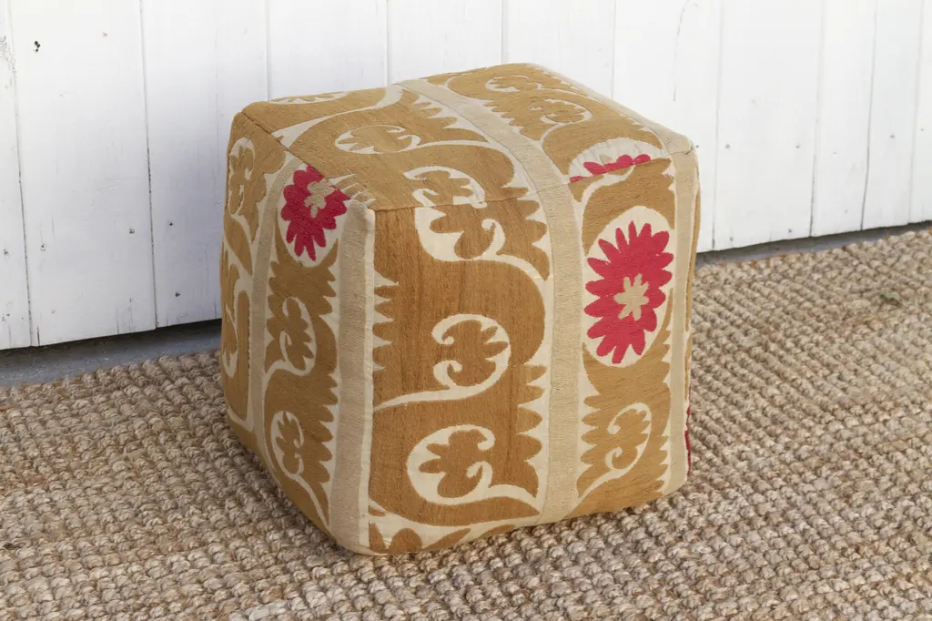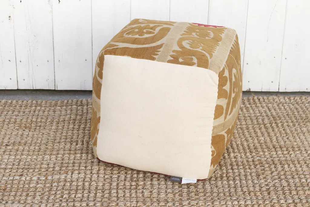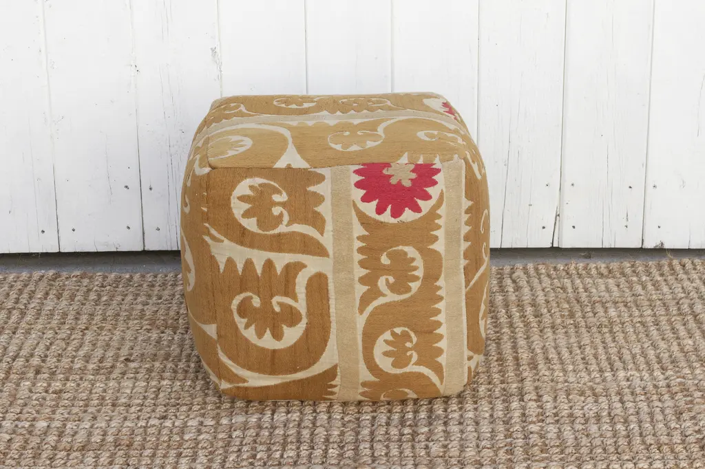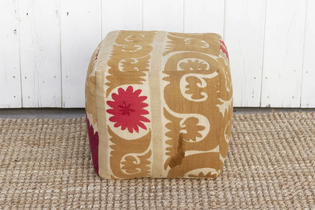 Our collection of Suzani ottomans offers a unique way to incorporate timeless beauty into your home. Suzani embroidery, traditionally crafted by women to adorn their homes and celebrate special occasions, is a breathtaking art form. We breathe new life into antique Suzani tapestries by transforming them into stunning square ottomans showing designs on all sides, with a durable base. Each piece boasts captivating, hand-stitched artistry featuring vibrant floral, leaf, and vine motifs.