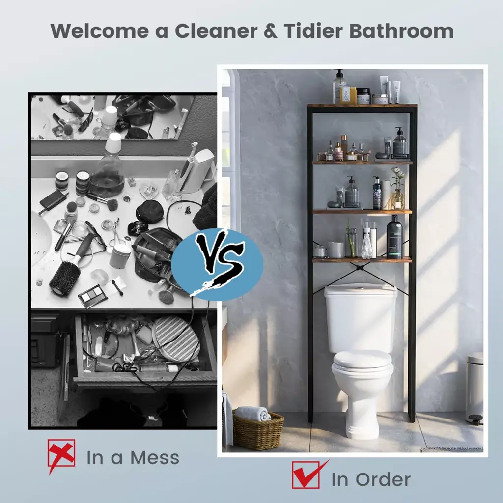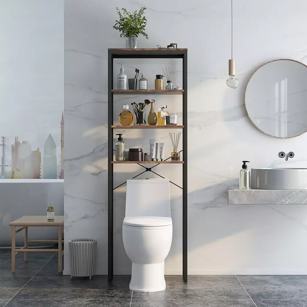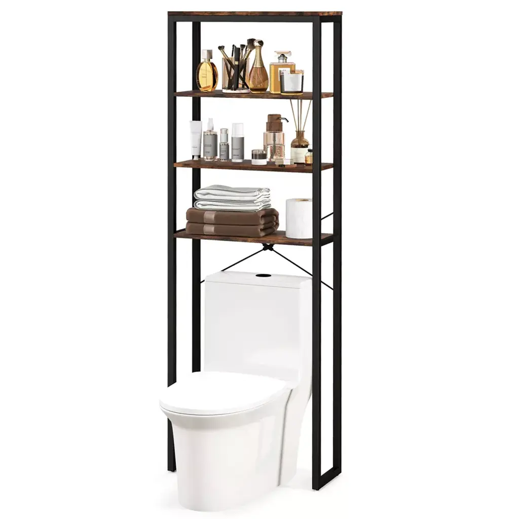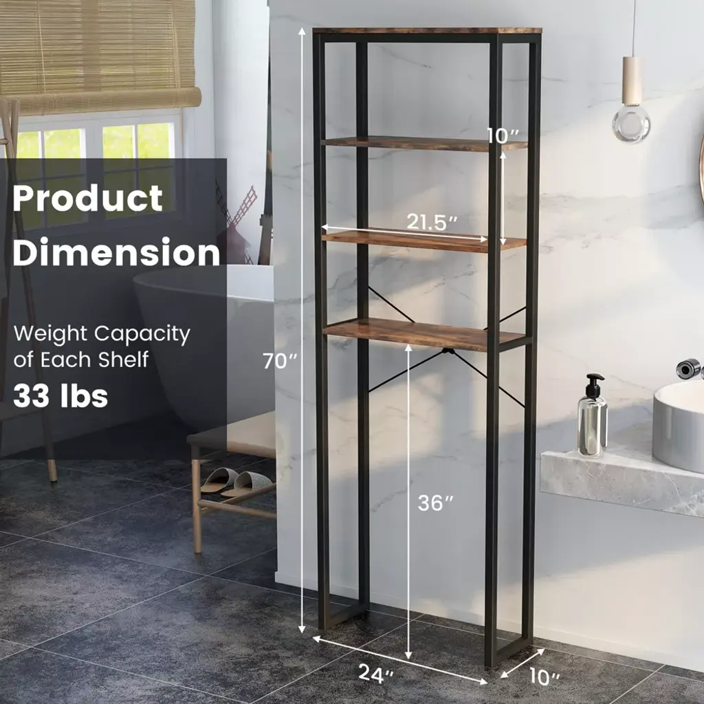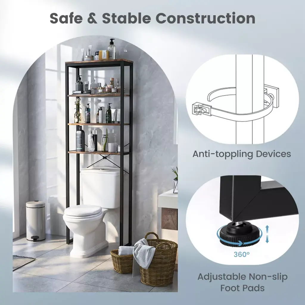Spruce up your bathroom with this over the toilet storage rack! Made of high-grade engineer wood and supported by heavy-duty metal frame, the freestanding bathroom space saver will accompany you for many years. With the 4-tier storage space, you are able to organize various bathroom necessities in order. The open storage makes it easier to reach items. In addition, the 4-tier wooden toilet rack can be fixed to the wall with anti-toppling devices for added stability and safety. And the adjustable anti-slip foot pads adapt to uneven ground. The bathroom storage rack can also serve in the living room, bedroom, balcony and other places. You have the final say about where to put it! FeaturesUtilize the area over the toilet without taking up too much space 4-tier storage space holds bathroom essentials for easy access 36'' toilet clearance fits a variety of toilets High quality E0-grade engineer wood for long-lasting use Sturdy and rustproof metal frame for overall steadiness Anti-toppling devices for firm attachment to the wall Adjustable non-slip foot pads for additional stability Widely applied in the bathroom, living room, laundry, etc Detailed and illustrated user's manual for easy installation Smooth and water resistant surface for simple cleaningColor: Black + Rustic Brown Materials: Engineer ed Wood, Metal Overall Dimension: 24'' x 10'' x 70'' (L x W x H) Space for Toilet: 21.5'' x 36'' Net Weight: 26 lbs Weight Capacity of Each Shelf: 33 lbs Package Includes: 1 x Over-the-toilet Storage Rack 1 x Instruction