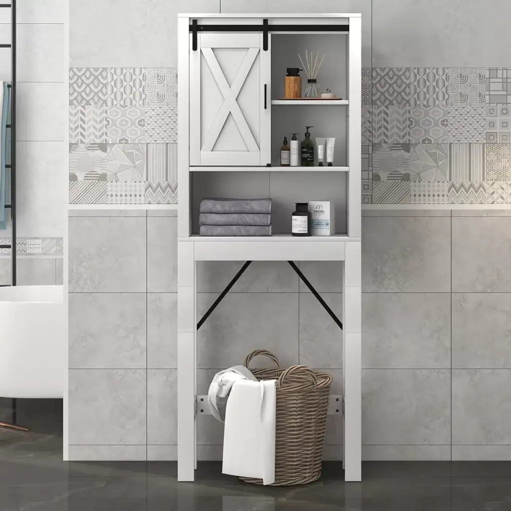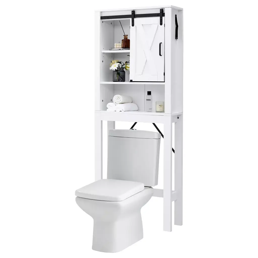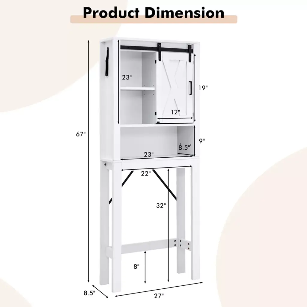Spruce up your bathroom with this over-the-toilet storage cabinet! Featuring roomy storage space with adjustable shelves, the 4-tier over-the-toilet storage organizer is able for hold various bathroom items for easy access. In addition, the selected materials can adapt to the bathroom environment well, accompanying years to come. Anti-tip kit is included since your safety is our priority. The smooth sliding bar door allows you to push it to your desired position easily. Furthermore, the clear instruction can simplify assembly. When it comes to daily cleaning, the waterproof and smooth surface helps a lot.FeaturesSliding barn door for dust-proof performance Anti-toppling device for secure use Ample storage space for a variety of objects 3-level adjustable shelves for flexible storage solution Anti-slip foot pads enhance stability A convenient handle for simple use Widely applied in the bathroom, restroom, laundry Illustrated instruction for simple installation Waterproof surface for easy maintenanceColor: White Materials: Engineer Wood, MDF Overall Dimension: 27'' x 8.5'' x 67'' (L x W x H) Toilet Clearance: 27'' x 32'' (L x H) Net Weight: 50 lbs Weight Capacity of Top: 44 lbs Total Weight Capacity: 130 lbs Package Includes: 1 x Over-the-toilet Storage Cabinet 1 x Instruction