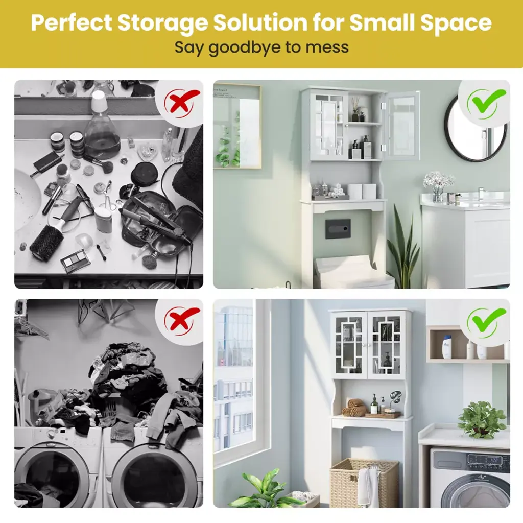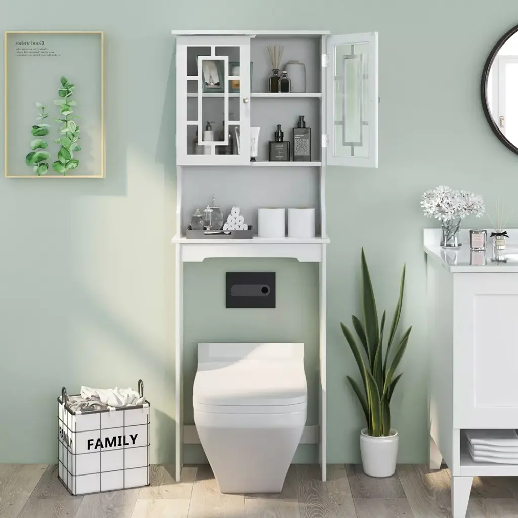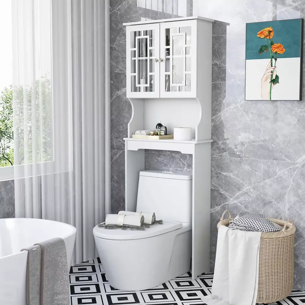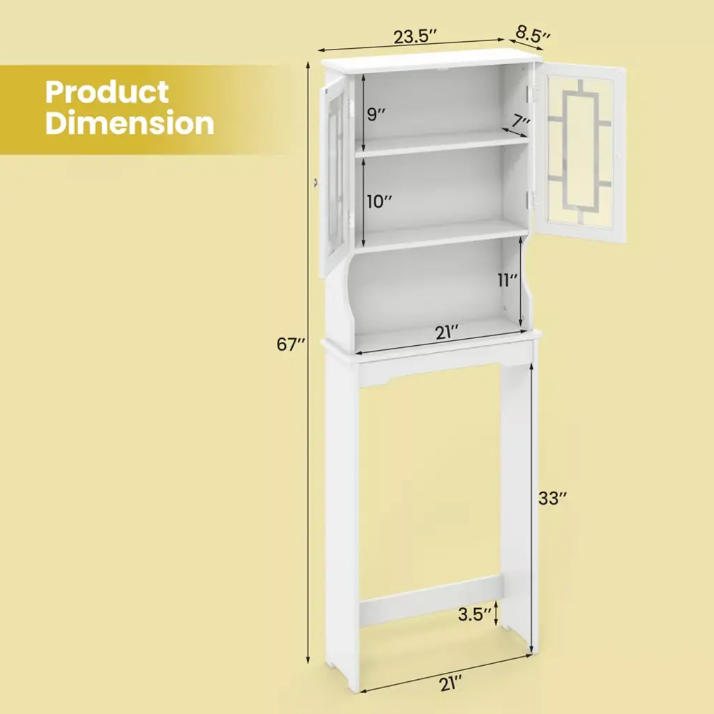 Enjoy your life with this over the toilet storage cabinet! This over the toilet storage cabinet helps to keep your bathroom tidy without taking up much floor space (please measure the height of your toilet before buying). Equipped with 2 tempered glass doors, a 3-position adjustable shelf and an open compartment, the bathroom organizer cabinet offers roomy storage space and can meet various storage needs. Crafted from selected engineered wood, this bathroom space saver ensures long-lasting use. Besides, the anti-toppling device and bottom reinforced crossbar enhance stability. Meanwhile, the smooth and anti-scratch surface is easy to wipe clean. FeaturesAmple storage space for bathroom essentials or other items 3-position adjustable shelf for placing different sized items Anti-toppling device fixes the cabinet to the wall for added safety Keep your bathroom neat and tidy without taking up floor space High quality materials and sturdy construction for long-term use Handy knobs and magnetic catch make it easy to open the doors Elegant and modern look adds a touch of delicacy to your home Ideal for bathroom, laundry room, balcony, etc Clear instruction for simple assembly Easy-to-clean surface Color: White/Grey Material: Engineered Wood, MDF, Tempered Glass Product Dimension: 23.5" x 8.5" x 67" (L x W x H) Recommend Toilet Size: 21" x 33" (W x H) Net Weight: 37 lbs Weight Capacity of Each Layer: 22 lbs Package Includes: 1 x Over-the-Toilet Storage Cabinet 1 x Instruction