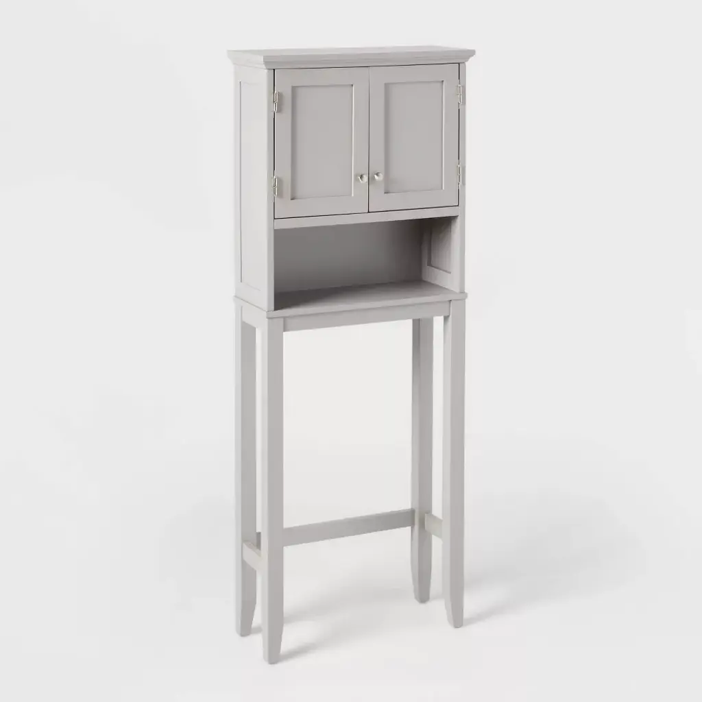 Save space while getting a convenient spot to keep your bath essentials organized with the Over the Toilet Wood Space Saver from Threshold™. This storage cabinet features two drawers along with an open bottom shelf to give you the convenience of displaying essentials while keeping other items hidden. Made with wood, this etagere gray storage cabinet looks great with your bathroom decor, and fits well above the toilet.Threshold™: Quality & Design / Casual classics for house and home.