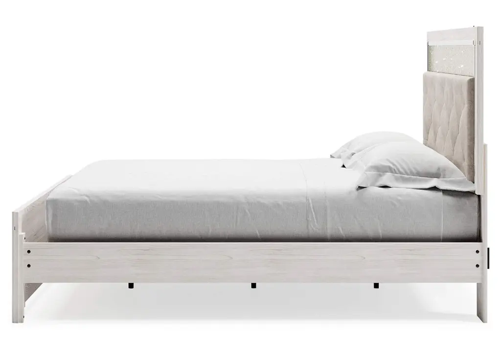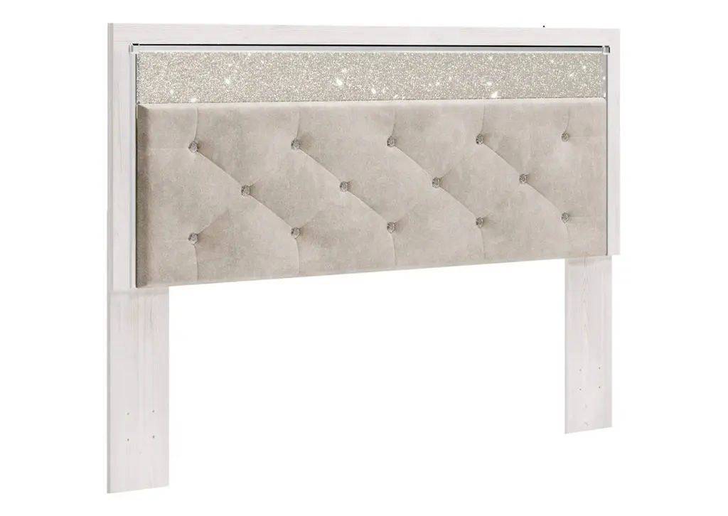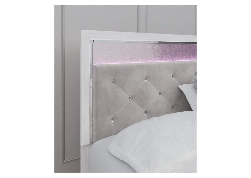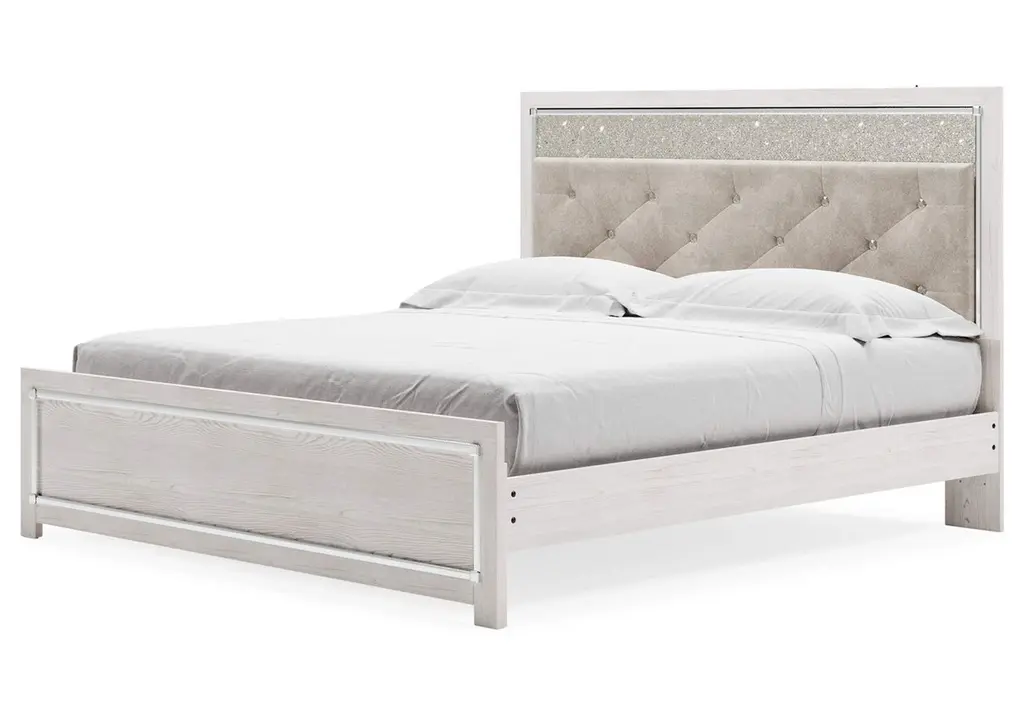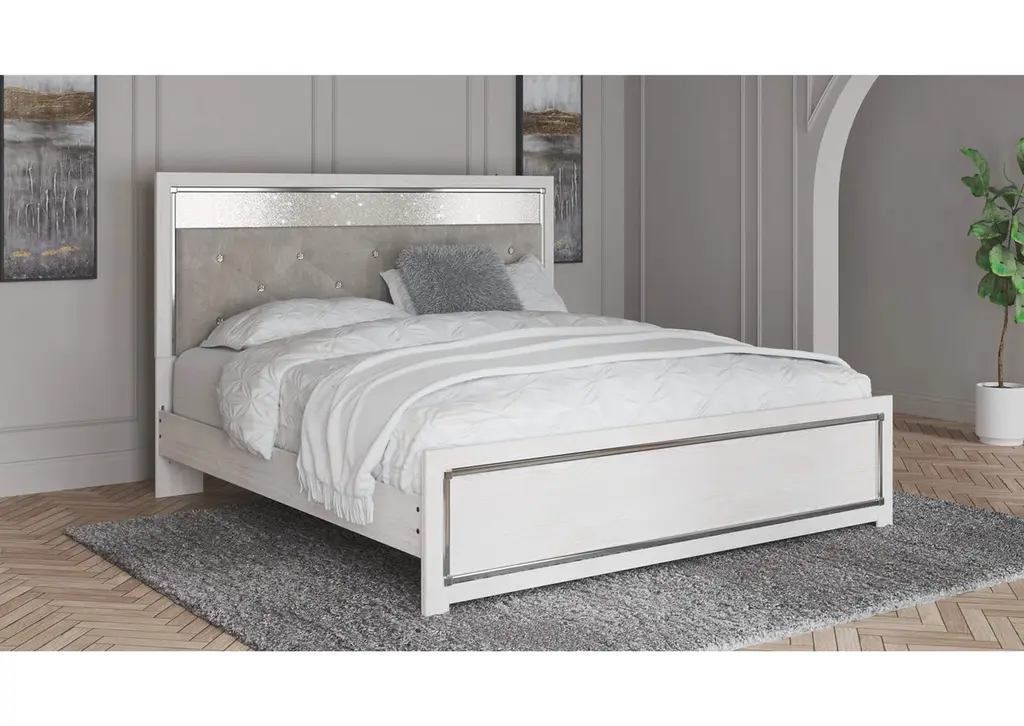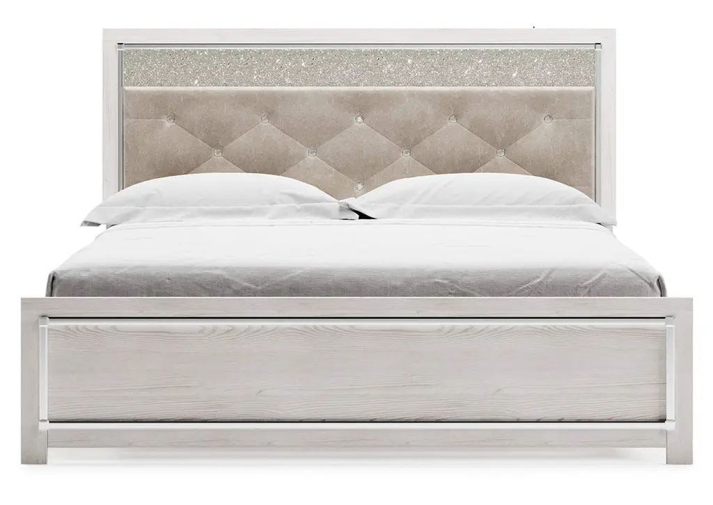 The epitome of fashion-forward design, the Altyra king panel bed is a beautiful blend of comfort and luxury. Shiny chrome-tone accents, a pearlized finish and button-tufted upholstery bring a glam touch to the richly rustic appearance. Remote-controlled LED lighting adds style and modern convenience to your restful retreat. Weight 231.000 lbs. (103.95kgs.)