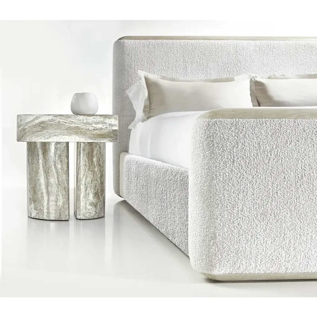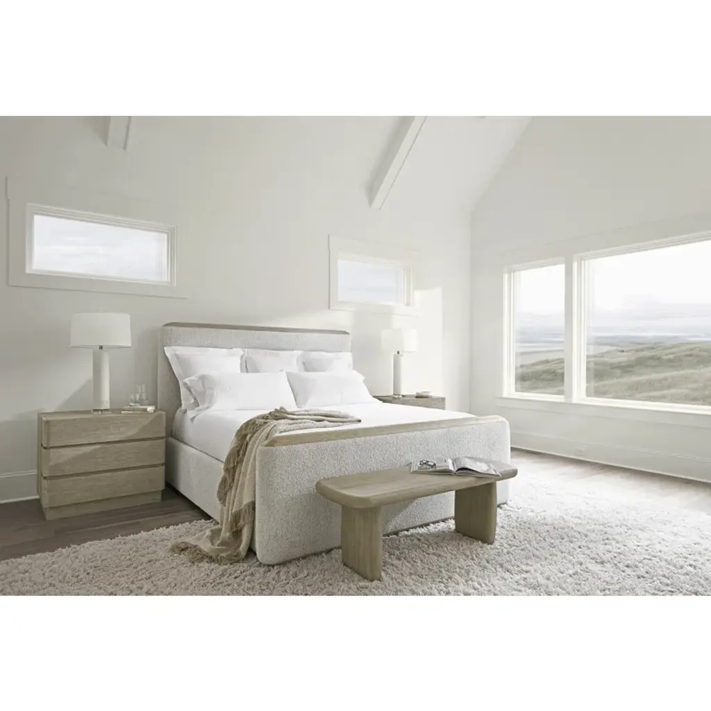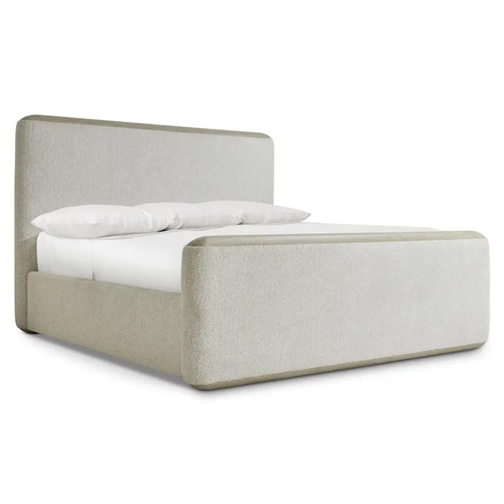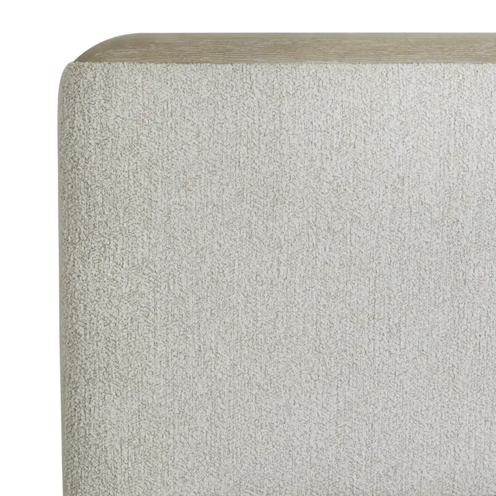 Beautifully rounded and upholstered panels form the headboard and footboard for the Arcadia bed. The shapes are highlighted by cast resin cap rails with a woodgrain pattern. Upholstered side panels continue the textural design, giving this bed a serene style.