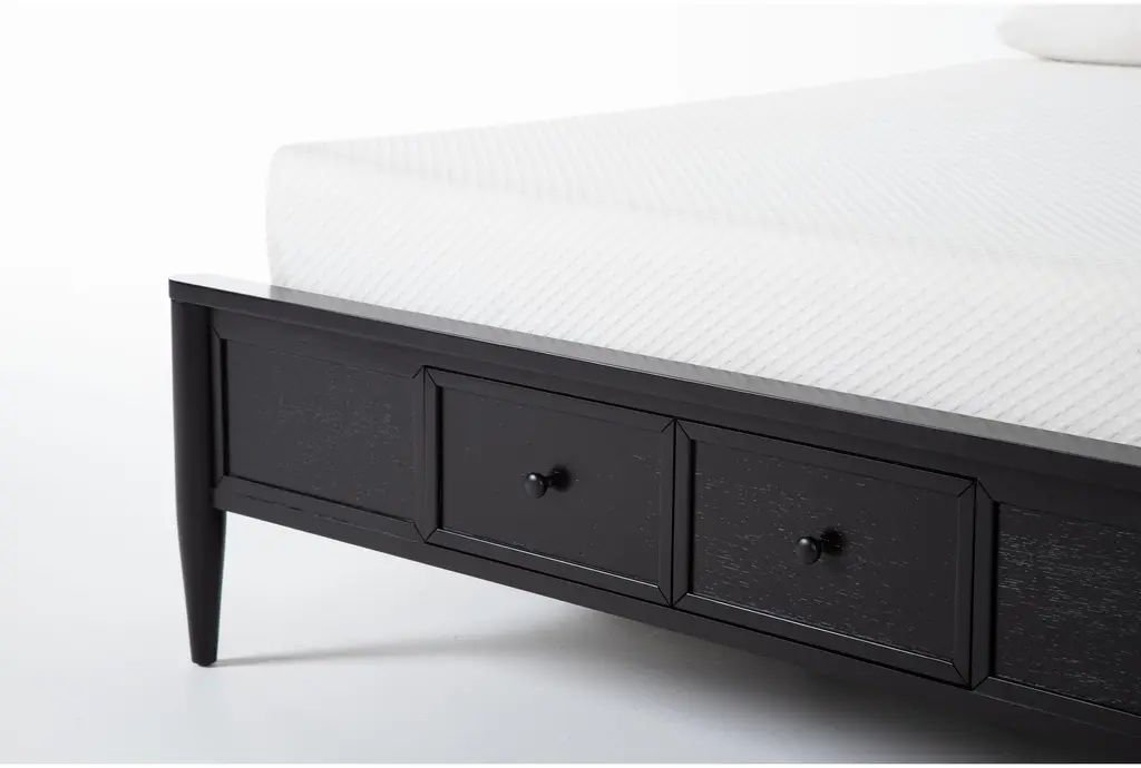 As part of a complete whole-home collection that was developed entirely by Living Spaces, the Austen Black wood upholstered bed reflects a unique and thoughtful approach to design. With a refined all-American look and extensive functionality, this piece is a natural and purposeful addition to your bedroom. A textured black finish accentuates oak veneer and solid wood, while an upholstered headboard provides soft support. We offer options with and without storage, so you can enjoy no storage, side storage, footboard storage, or side and footboard storage. Cedar lining in the drawers repels moths and insects, and keeps clothes fresh by eliminating mildew.