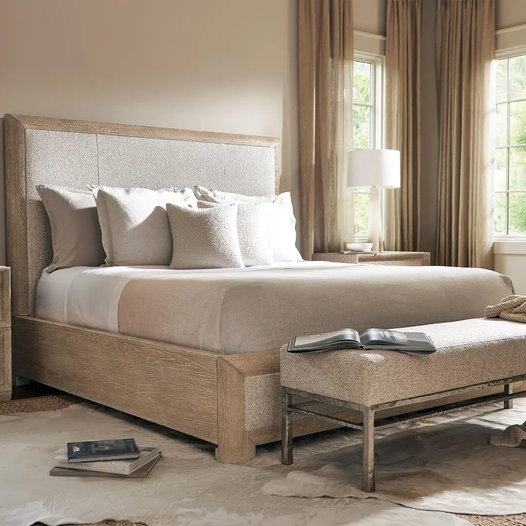 The Aventura Upholstered Panel Bed from Bernhardt reimagines classic forms with a modern, bright sophistication. Its inset upholstered panels accentuate the headboard and low footboard, while the Marcona-finished wood frame adds depth and a rustic charm. This bed offers a refined yet casual centerpiece for any contemporary bedroom. Highlights