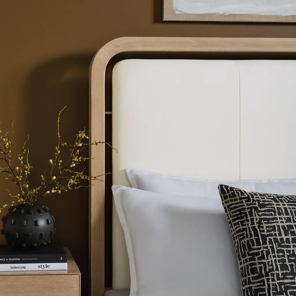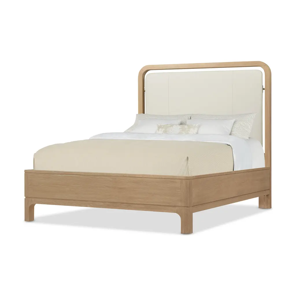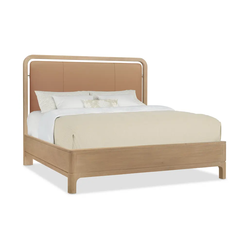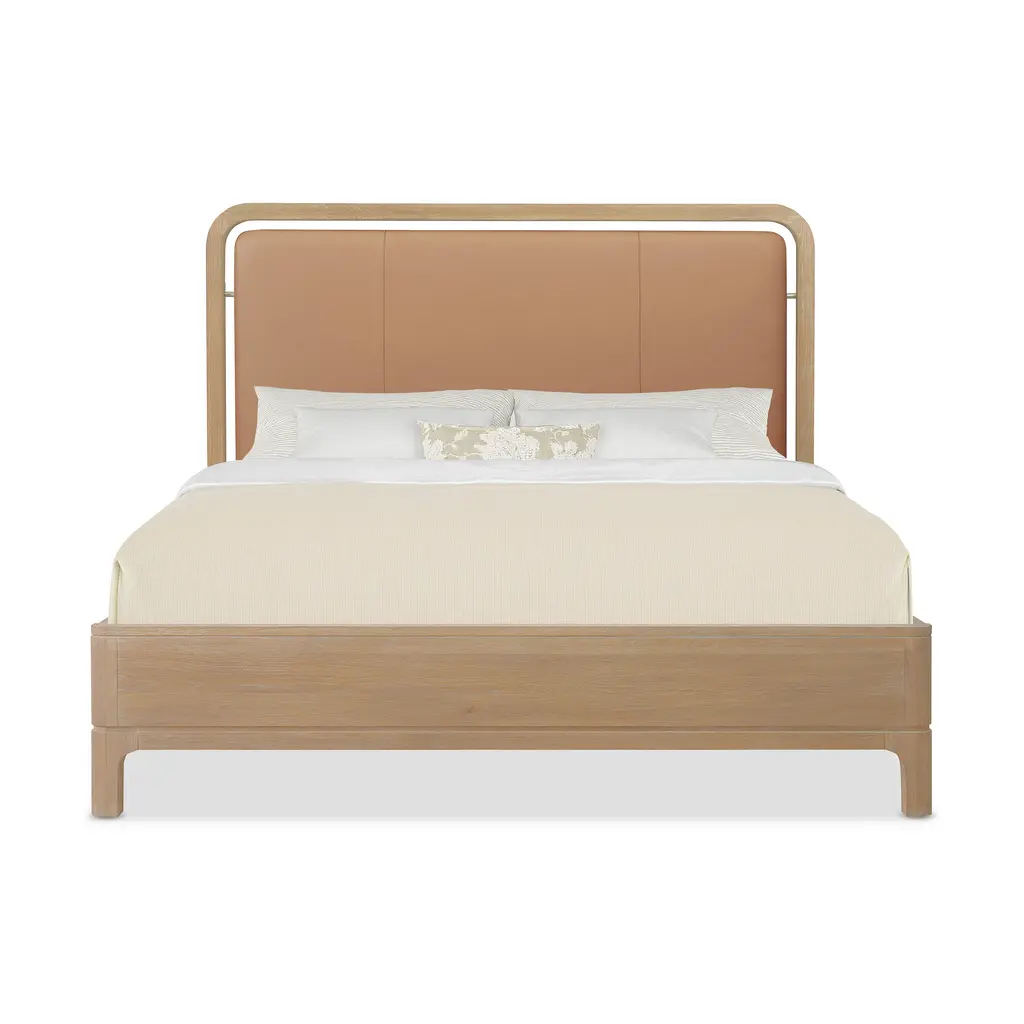 Transform your bedroom into a luxurious and stylish retreat with the Banyon Bay Panel Bed from Hooker. Crafted from white oak solids and veneers, and finished with wire-brushing and cerusing for added texture, this modern bed features a leather-upholstered headboard with open frame and metal supports. Perfect for urban, coastal, or mountain settings, it offers a tasteful combination of natural materials and contemporary design. Highlights