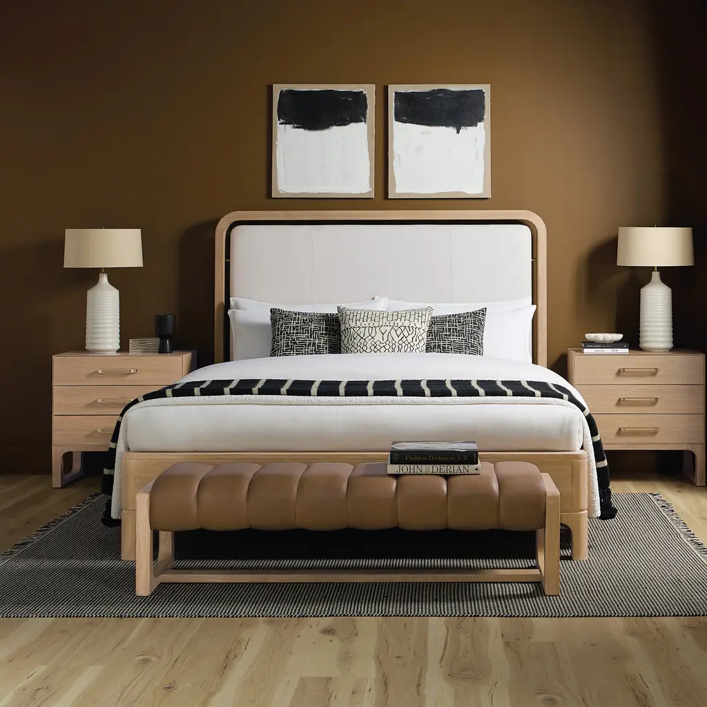 Transform your bedroom into a luxurious and stylish retreat with the Banyon Bay Panel Bed from Hooker. Crafted from white oak solids and veneers, and finished with wire-brushing and cerusing for added texture, this modern bed features a leather-upholstered headboard with open frame and metal supports. Perfect for urban, coastal, or mountain settings, it offers a tasteful combination of natural materials and contemporary design. Highlights