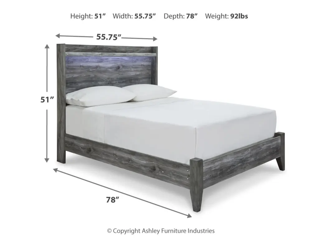 Rest in the casually cool style of the Baystorm full panel bed. Its driftwood and smoky finish and cool LED lighting give this bed an easy-going vibe perfect for setting the scene of a relaxed getaway. Clean lines and modern handles provide a fuss-free look. Mattress and foundation/box spring available, sold separately.