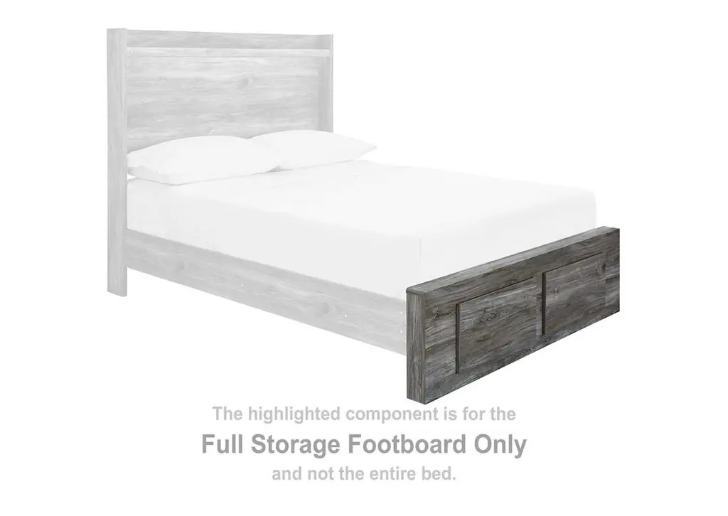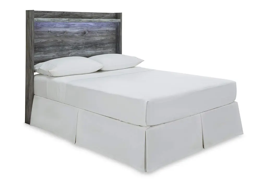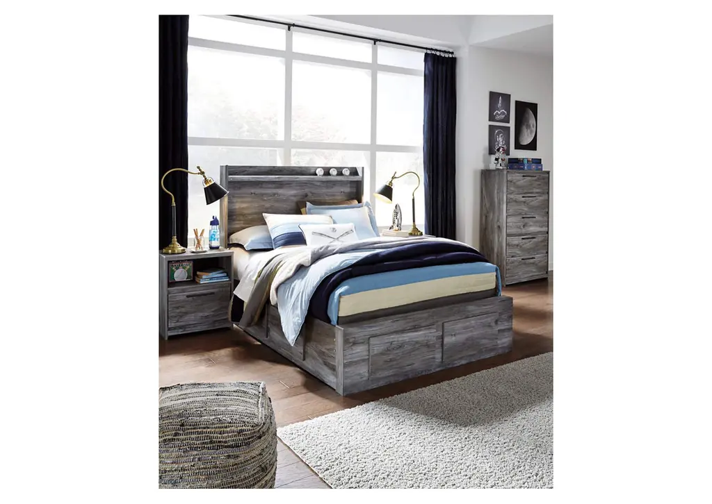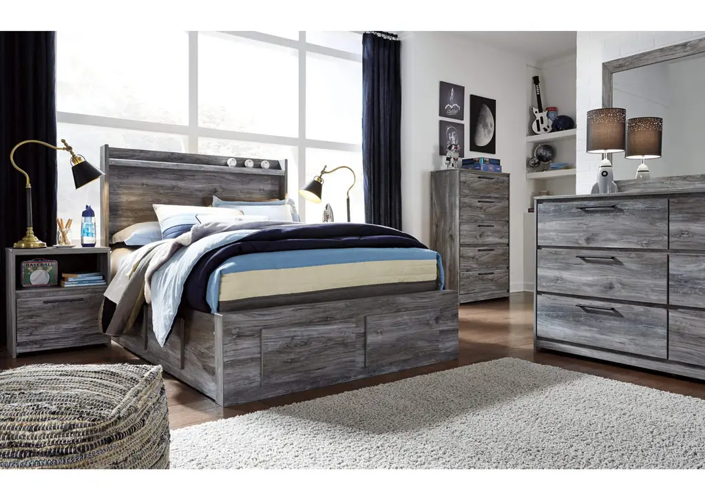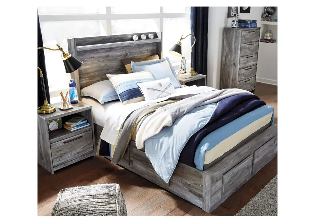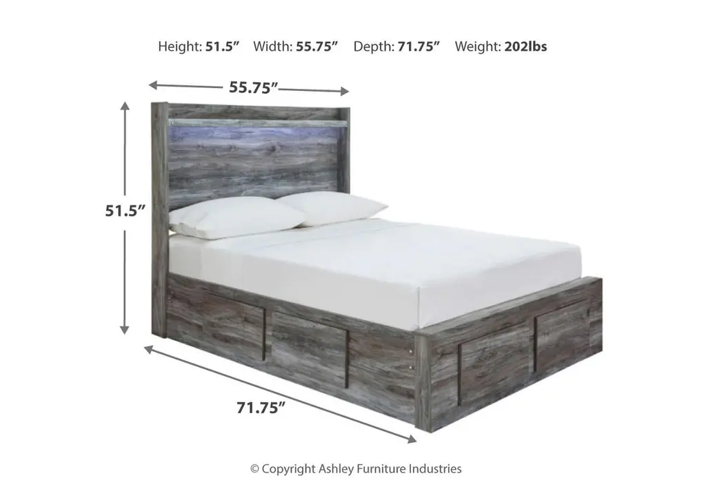 Rest in the casually cool style of the Baystorm full panel storage bed. Its driftwood and smoky finish and cool LED lighting give this bed an easy-going vibe perfect for setting the scene of a relaxed getaway. Keeping everything neat and tidy, four smooth-gliding drawers provide plenty of underbed storage. Mattress available, sold separately. Weight 242.000 lbs. (108.9kgs.)