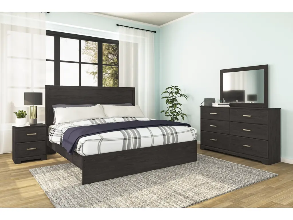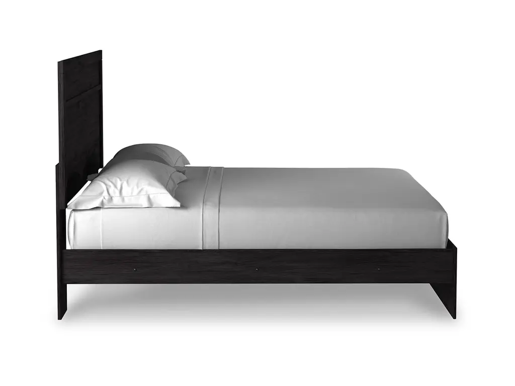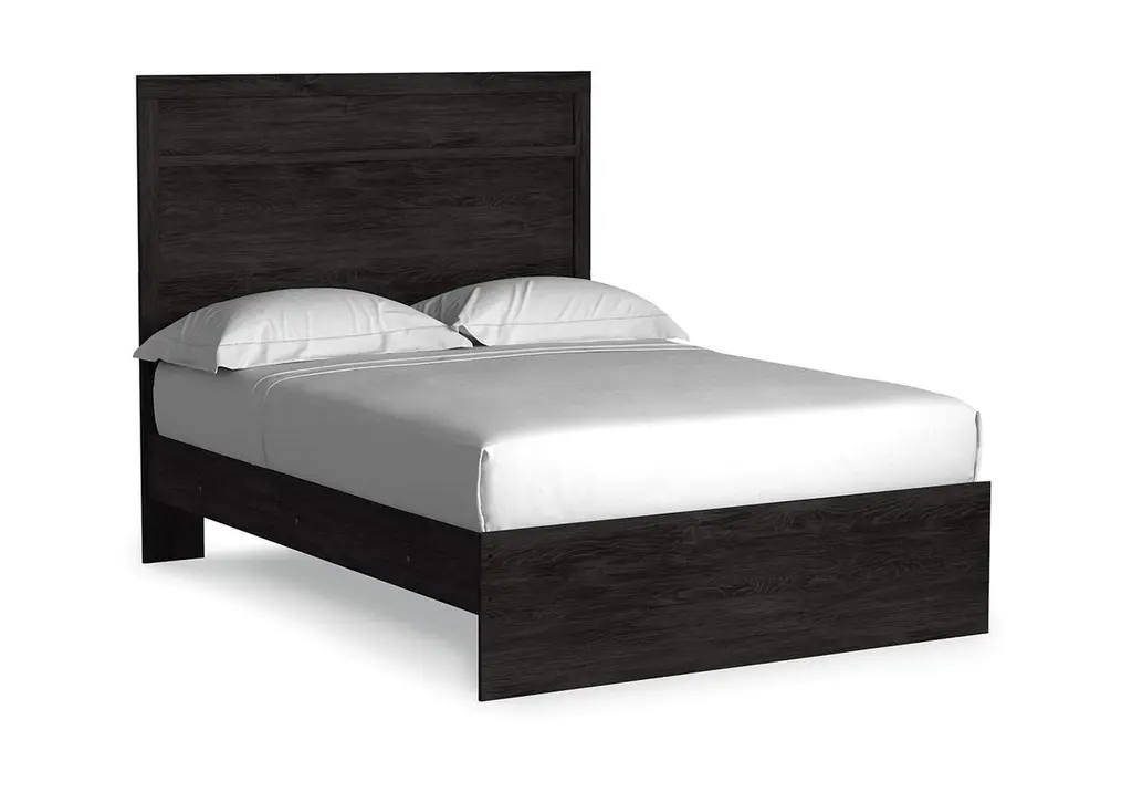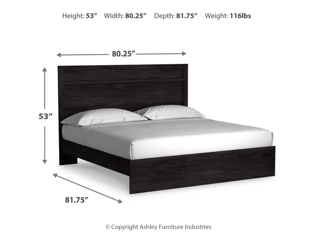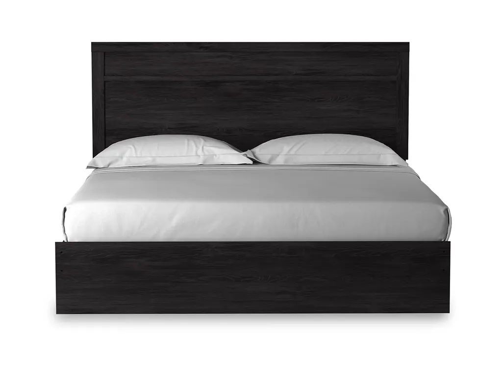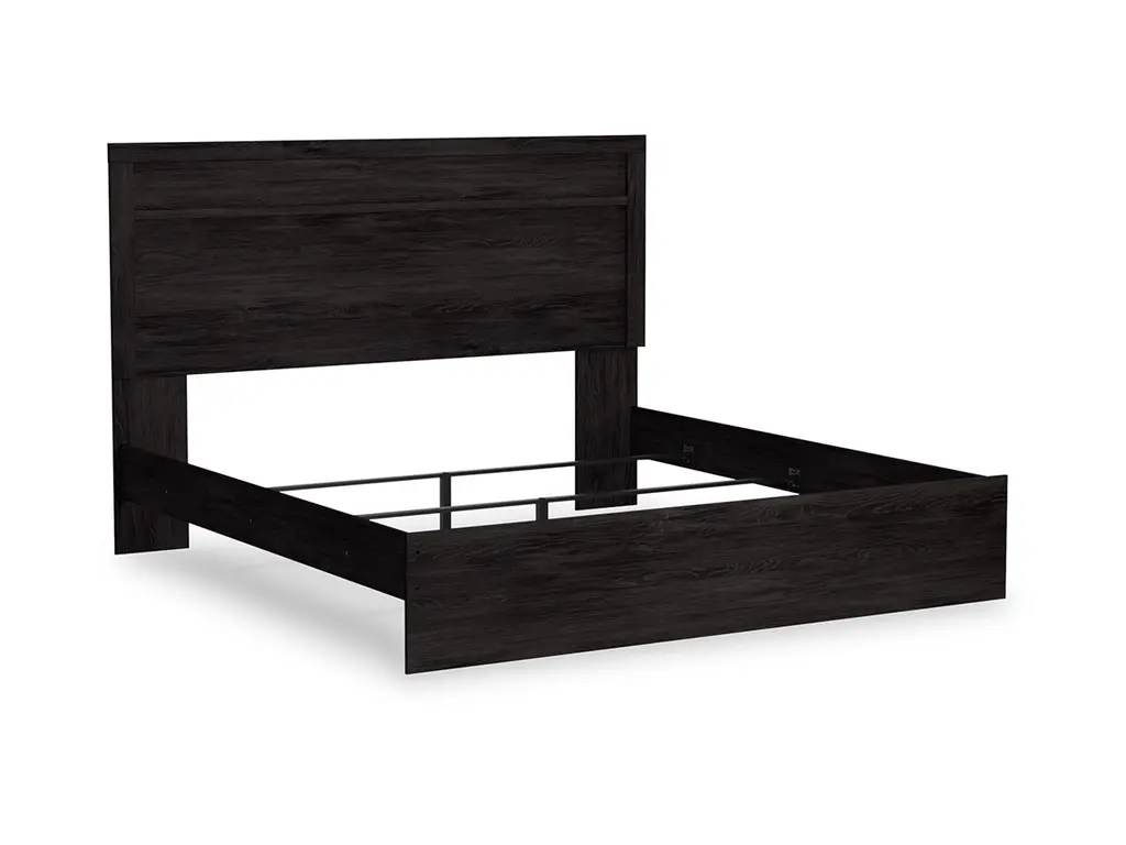 With its clean-lined look and modern attitude, the Belachime king panel bed is a fresh style awakening. A warm charcoal hue over replicated oak grain easily complements other furniture finishes. The simple, unadorned profile is given depth and dimension with the addition of plank-style moulding on the headboard—proof that beauty lies in the details.