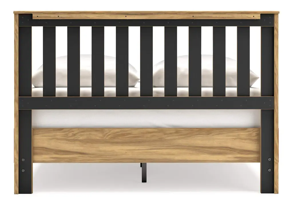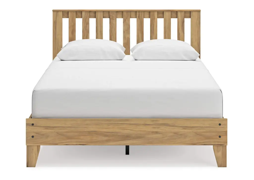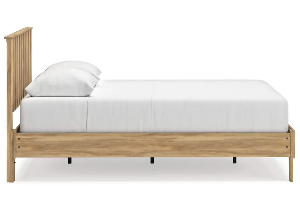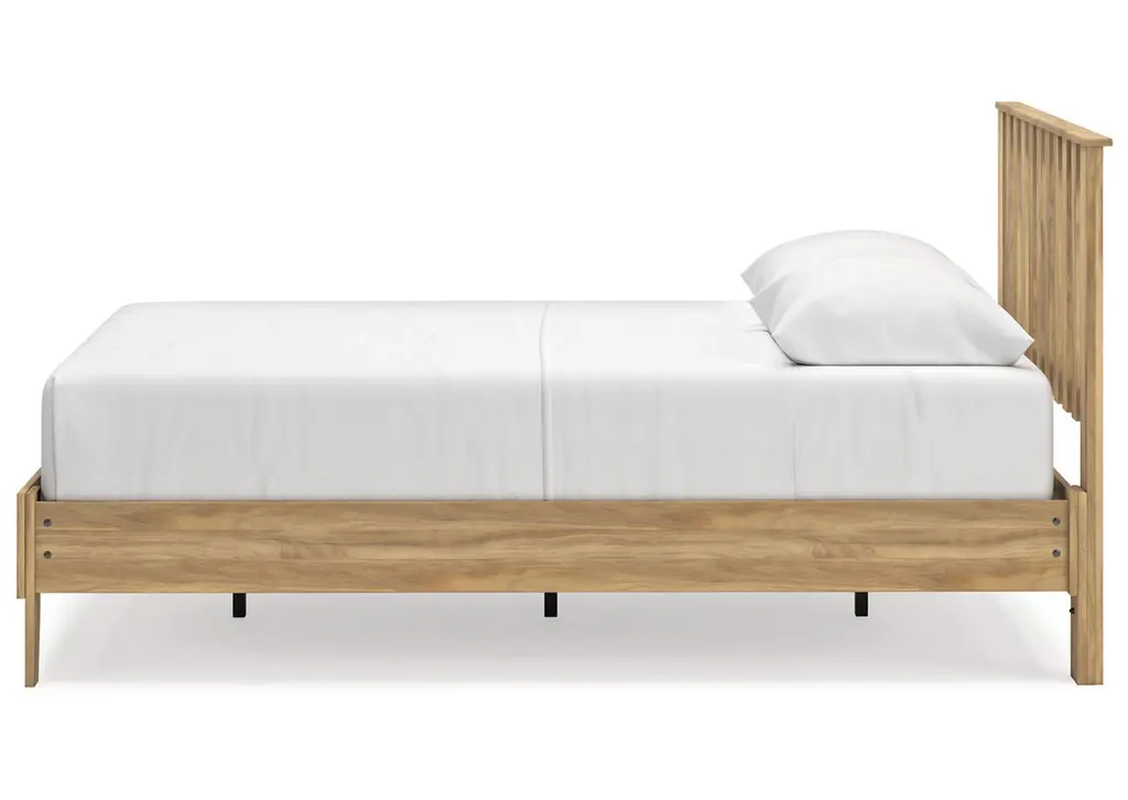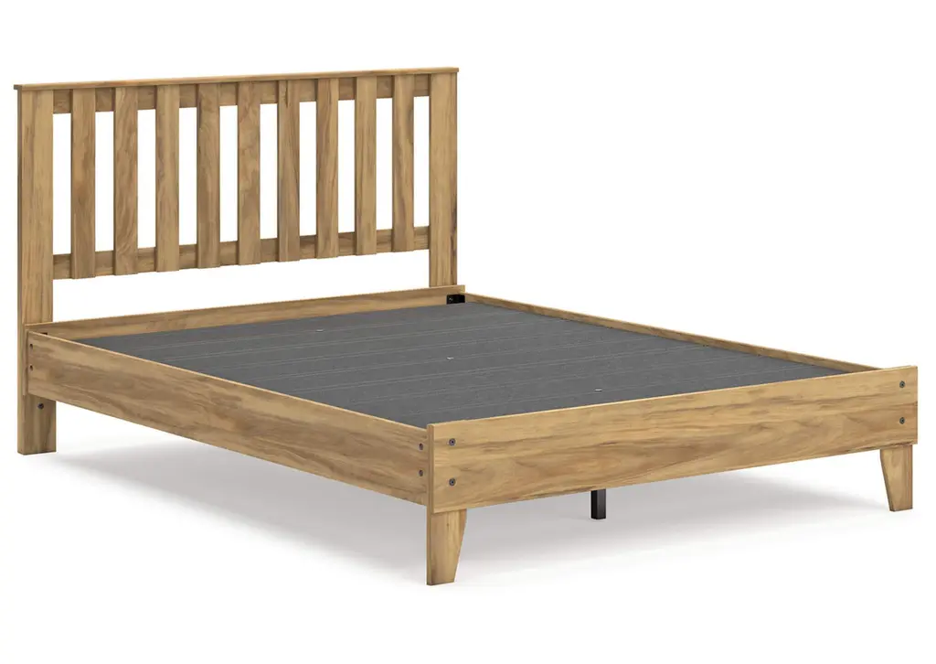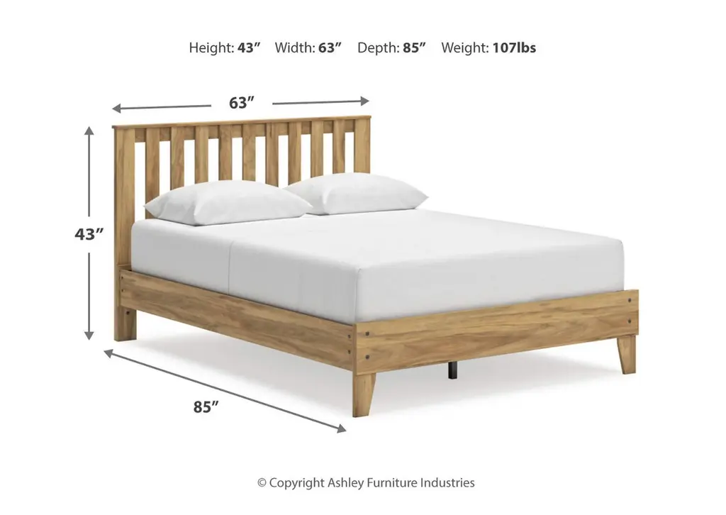 The Bermacy queen platform panel bed puts the dream of a casual bedroom retreat beautifully within budget. A warm light brown finish over replicated hickory grain exudes a homey vibe. Slatted detailing on the headboard incorporates rich dimension. It’s a simply relaxed way to achieve the bedroom of your dreams without needing a foundation or box spring. Weight 128.000 lbs. (57.6kgs.)