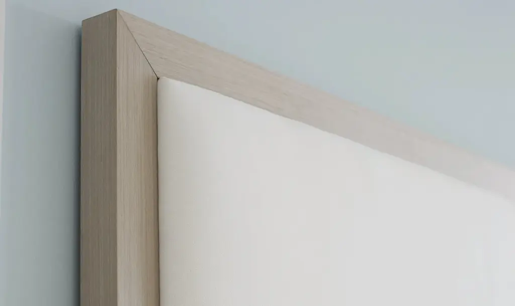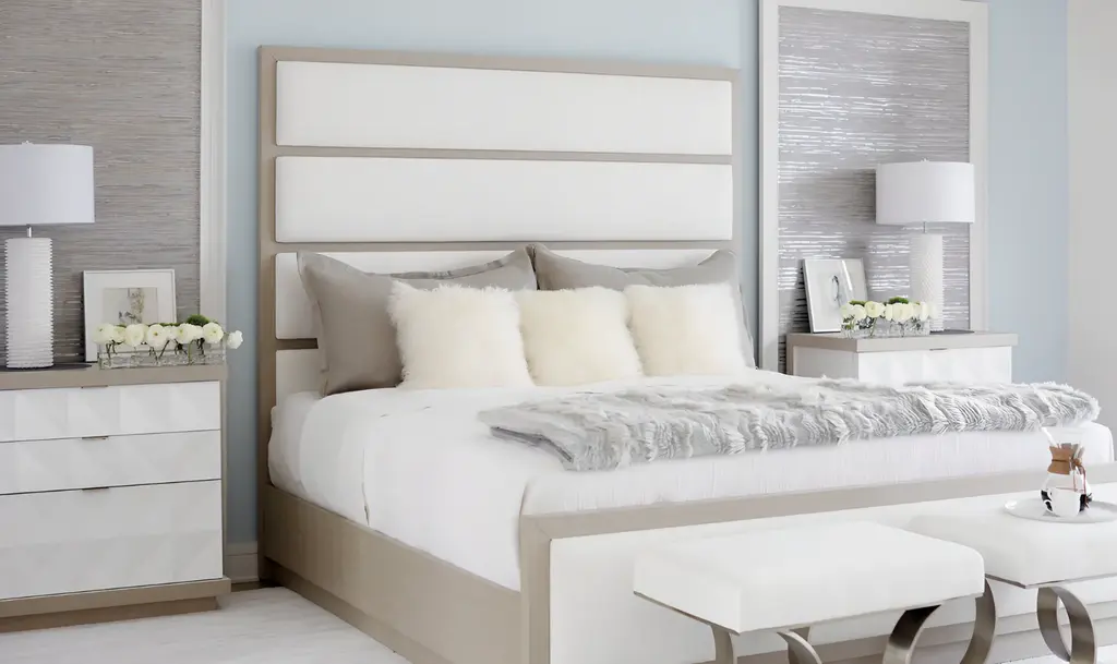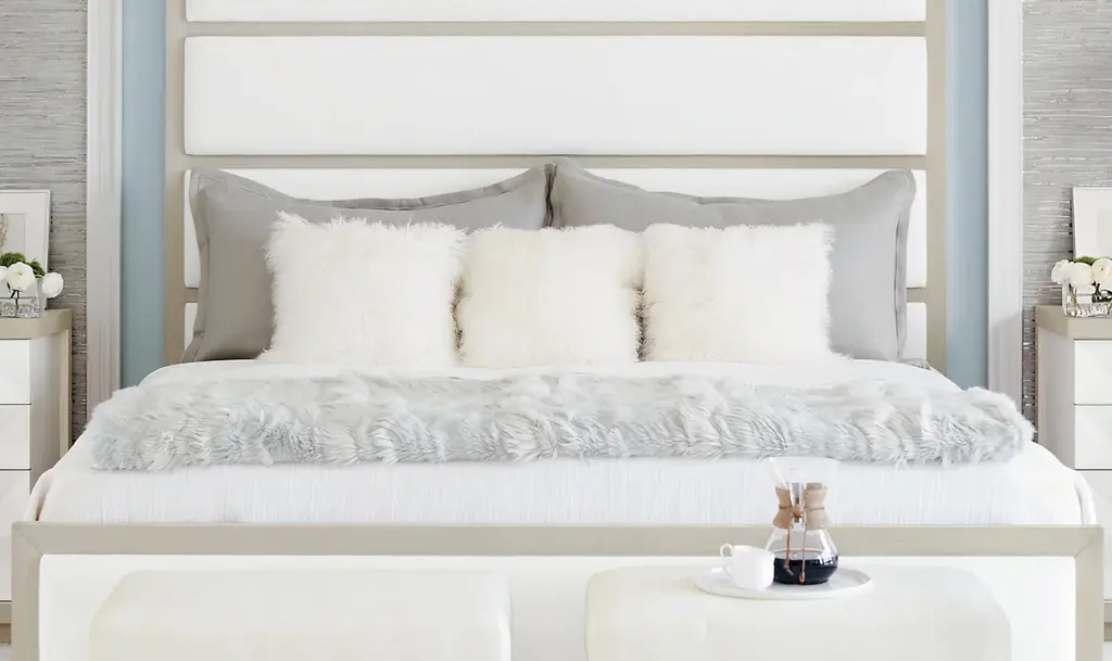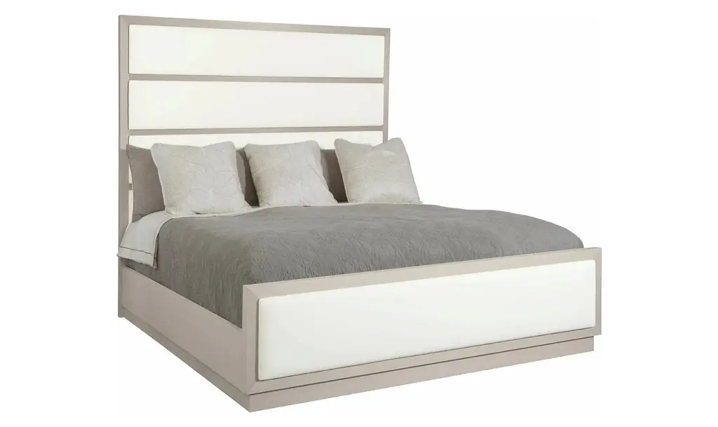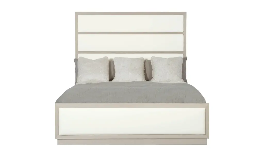 With its contemporary appeal and attention to craftsmanship, Axiom is a transitional furniture collection that refuses to play by the rules. The Axiom upholstered panel bed offers clean lines and a sleek form, yet the feeling remains warm and inviting. Providing comfortable support and modern flair, the winged headboard features six inset upholstered panels in a grid pattern. Engineered faux anigre veneers are presented in a silky yet low-sheen Linear Gray finish, while the neutral tone of the fabric keeps the look clean and balanced.