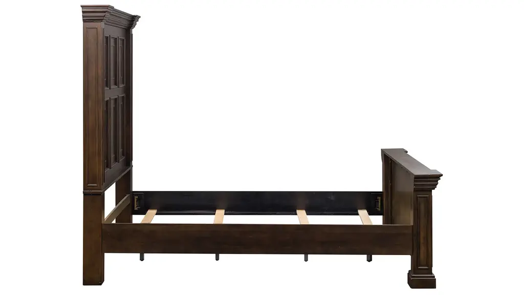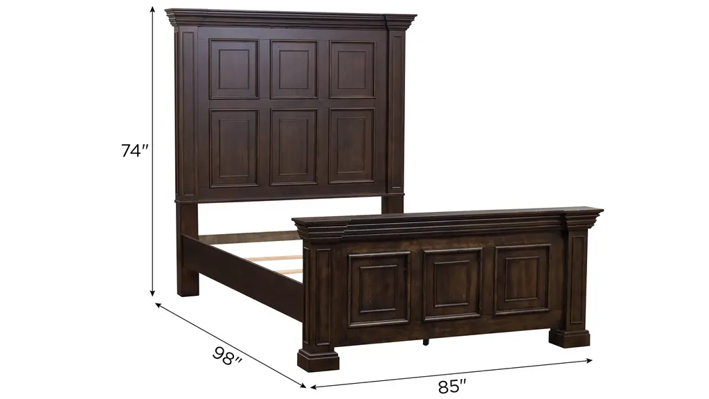 Live life beautifully with the Big Valley Panel Bed. Crafted of rubberwood solids with birch veneers this kit features a brownstone finish with heavy distressing, bolt-on rails, and a center support slat system. The panel bed, appropriately named the mansion bed, features heavy crown molding and square post pilasters. It has warm and intricate details which replicates a salvaged antique door. Warm antique finishes and artistic distressing along with grand scale makes the Big Valley a group to be passed on to generations.