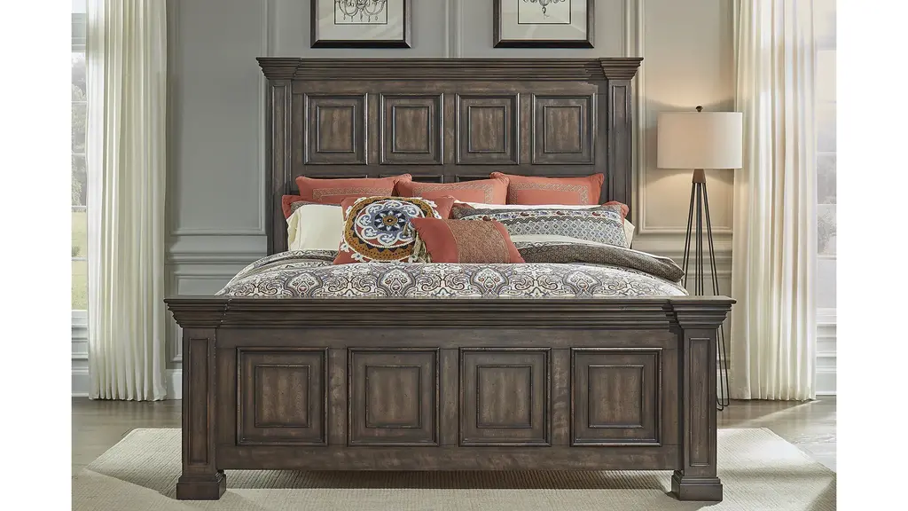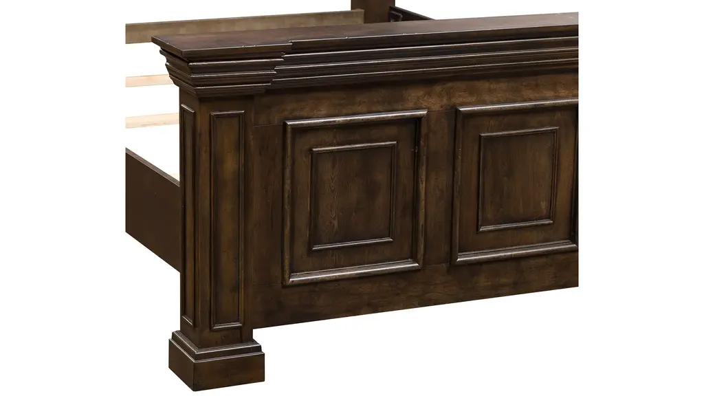 Live life beautifully with the Big Valley Panel Bed. Crafted of rubberwood solids with birch veneers this kit features a brownstone finish with heavy distressing, bolt-on rails, and a center support slat system. The panel bed, appropriately named the mansion bed, features heavy crown molding and square post pilasters. It has warm and intricate details which replicates a salvaged antique door. Warm antique finishes and artistic distressing along with grand scale makes the Big Valley a group to be passed on to generations.