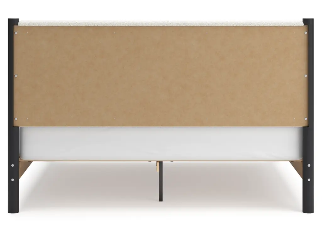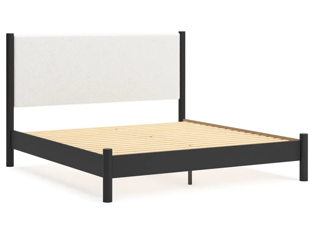 The Cadmori king upholstered panel bed reflects your sophisticated approach to boho style. Crafted with both form and function in mind, its fresh white fabric beautifully contrasts the matte black finish. The versatile design suits all-neutral spaces or blends with your favorite pops of color. It’s inviting, yet posh. Luxe, yet laid-back. With this bed, your free-spirited vibe meets modern design.