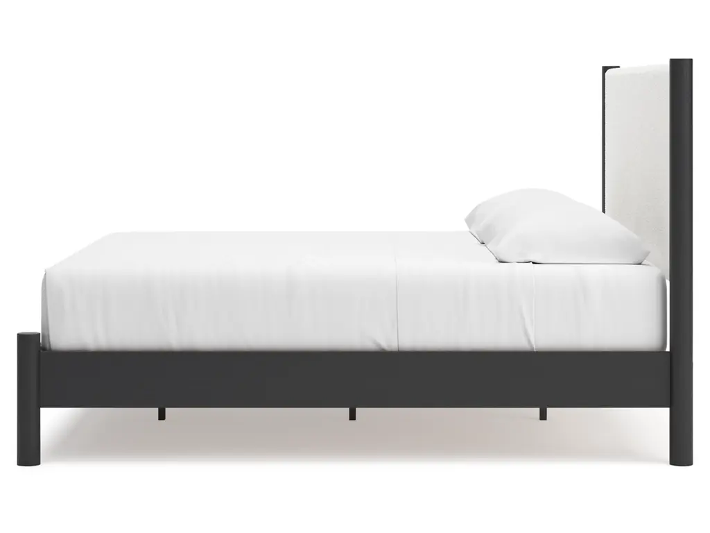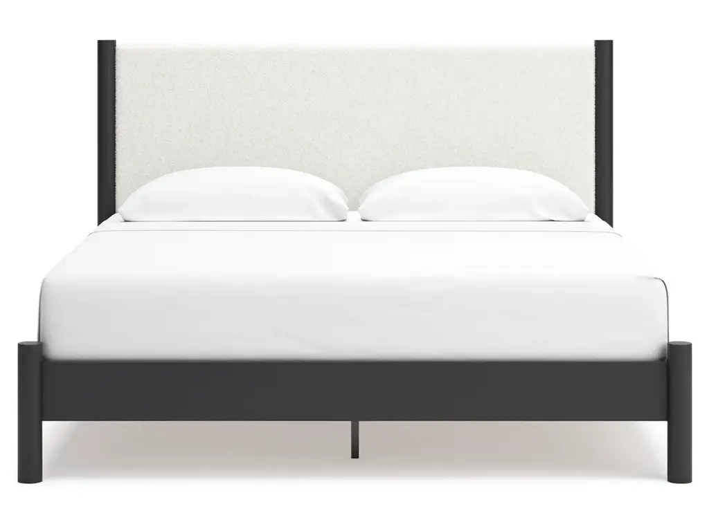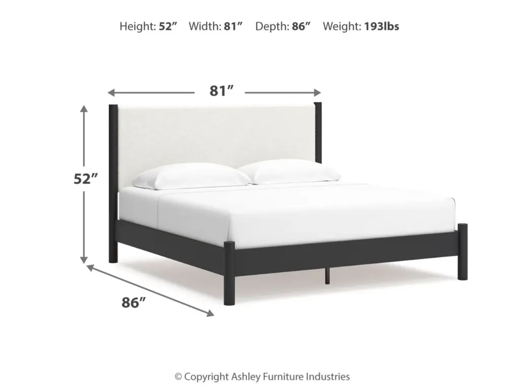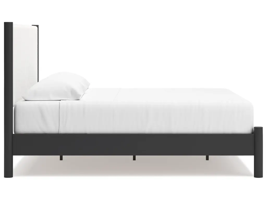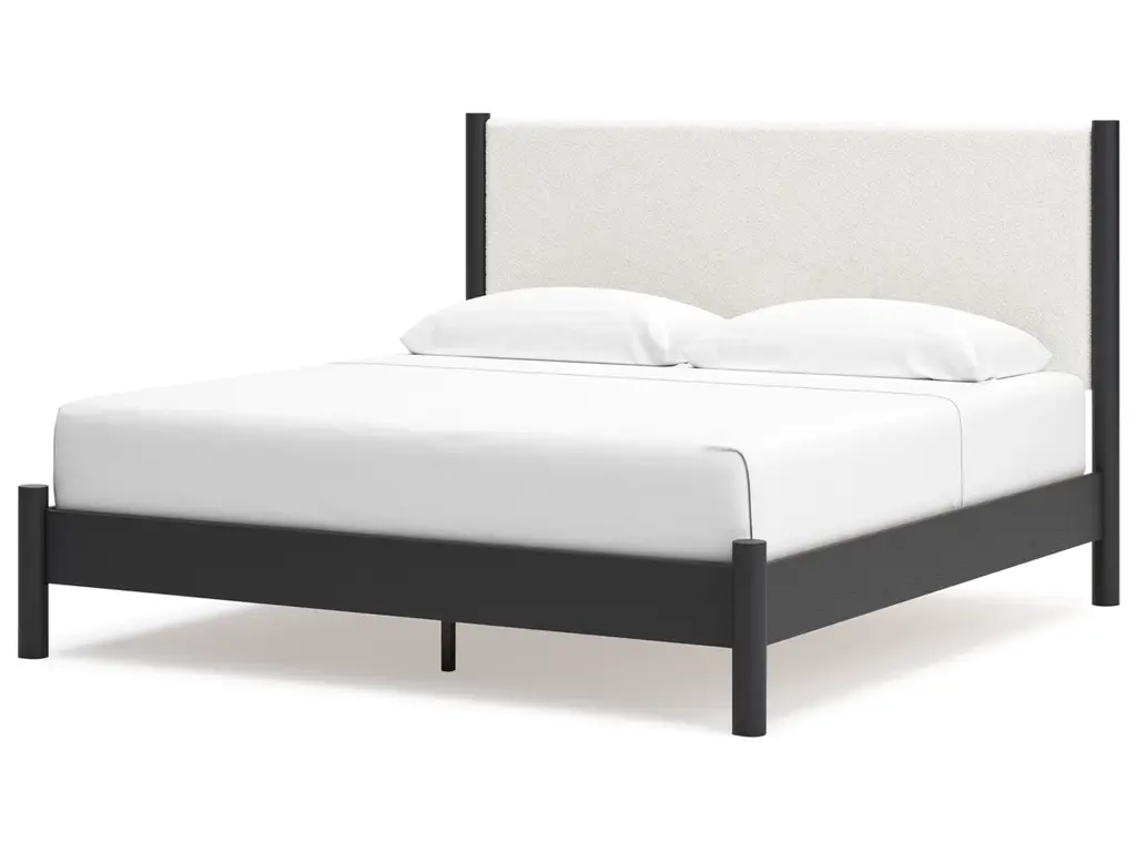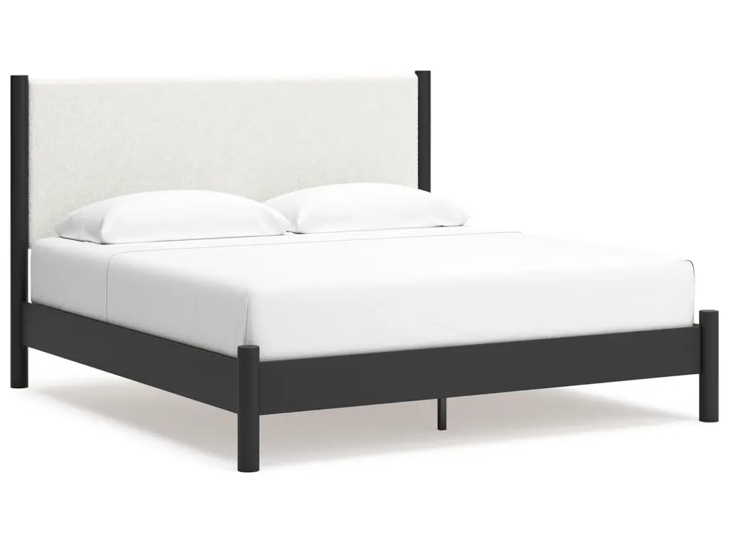 The Cadmori king upholstered panel bed reflects your sophisticated approach to boho style. Crafted with both form and function in mind, its fresh white fabric beautifully contrasts the matte black finish. The versatile design suits all-neutral spaces or blends with your favorite pops of color. It’s inviting, yet posh. Luxe, yet laid-back. With this bed, your free-spirited vibe meets modern design.