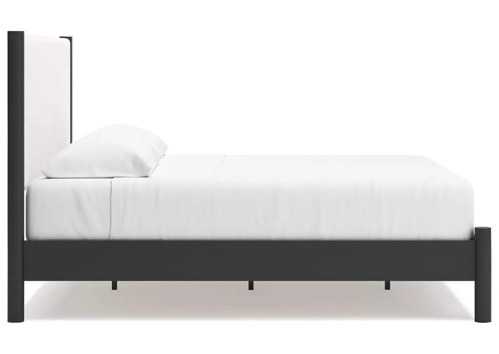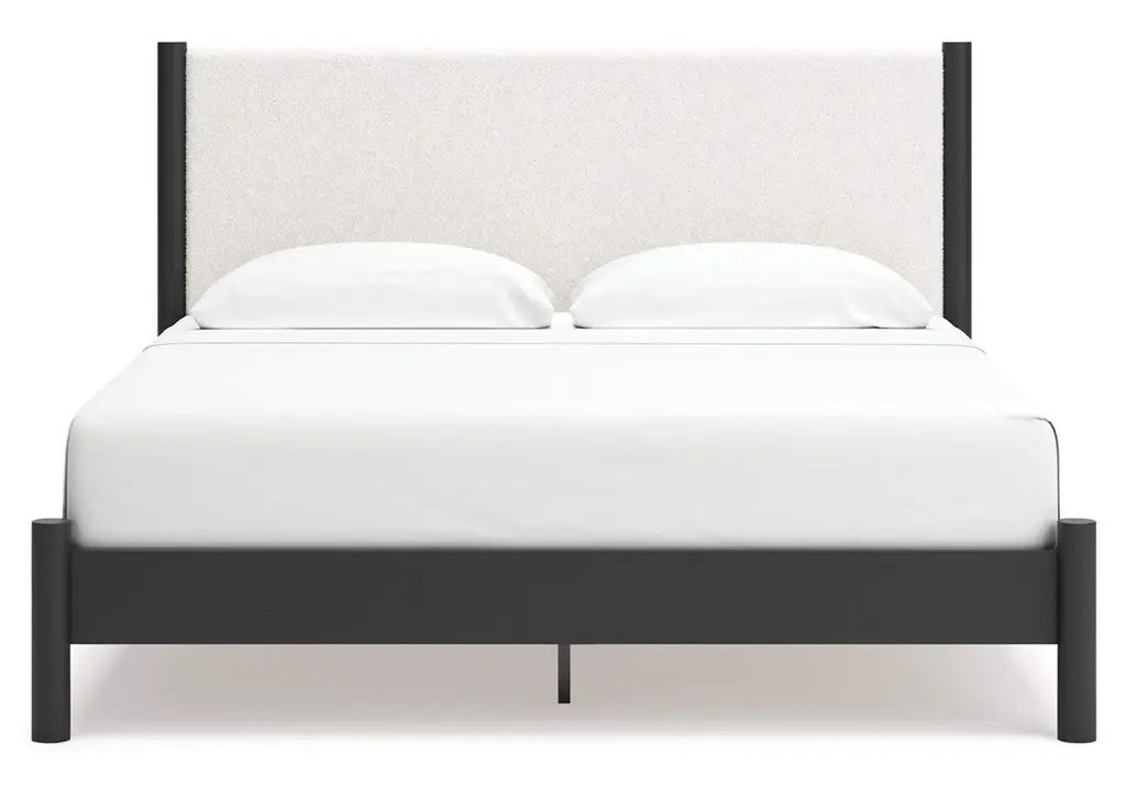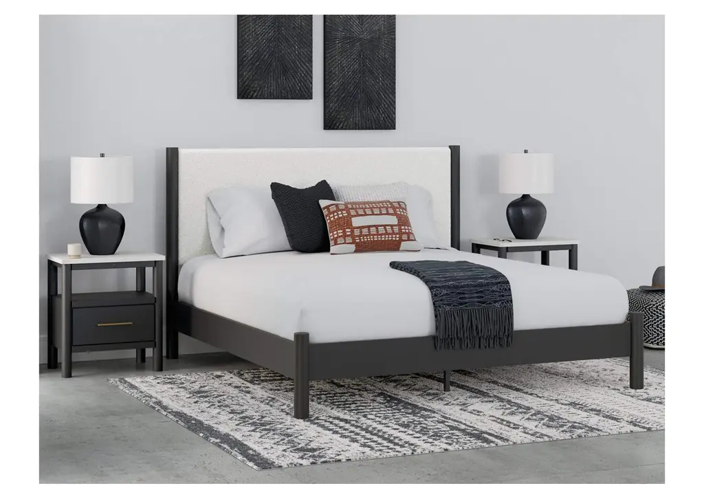 The Cadmori king upholstered panel bed reflects your sophisticated approach to boho style. Crafted with both form and function in mind, its fresh white fabric beautifully contrasts the matte black finish. The versatile design suits all-neutral spaces or blends with your favorite pops of color. It’s inviting, yet posh. Luxe, yet laid-back. With this bed, your free-spirited vibe meets modern design. Weight 190.350 lbs. (85.66kgs.)