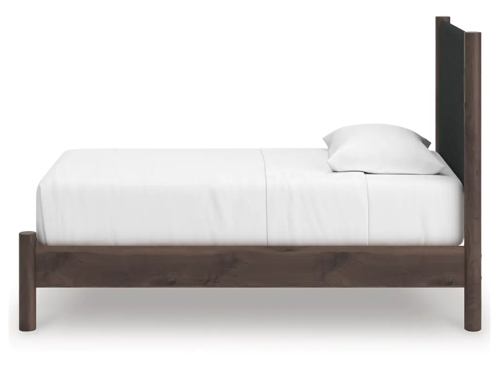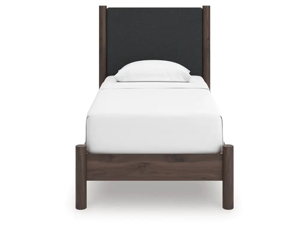 Crafted with both form and function in mind, the Cadmori twin upholstered panel bed brings a dash of retro-cool character to your modern boho aesthetic. Its textured black headboard fabric adds a trend-right touch to the classic silhouette. Warmly welcoming with a rich brown finish, this bed pairs well with muted hues, earth tones and other neutrals alike. What a refined take on easygoing style.