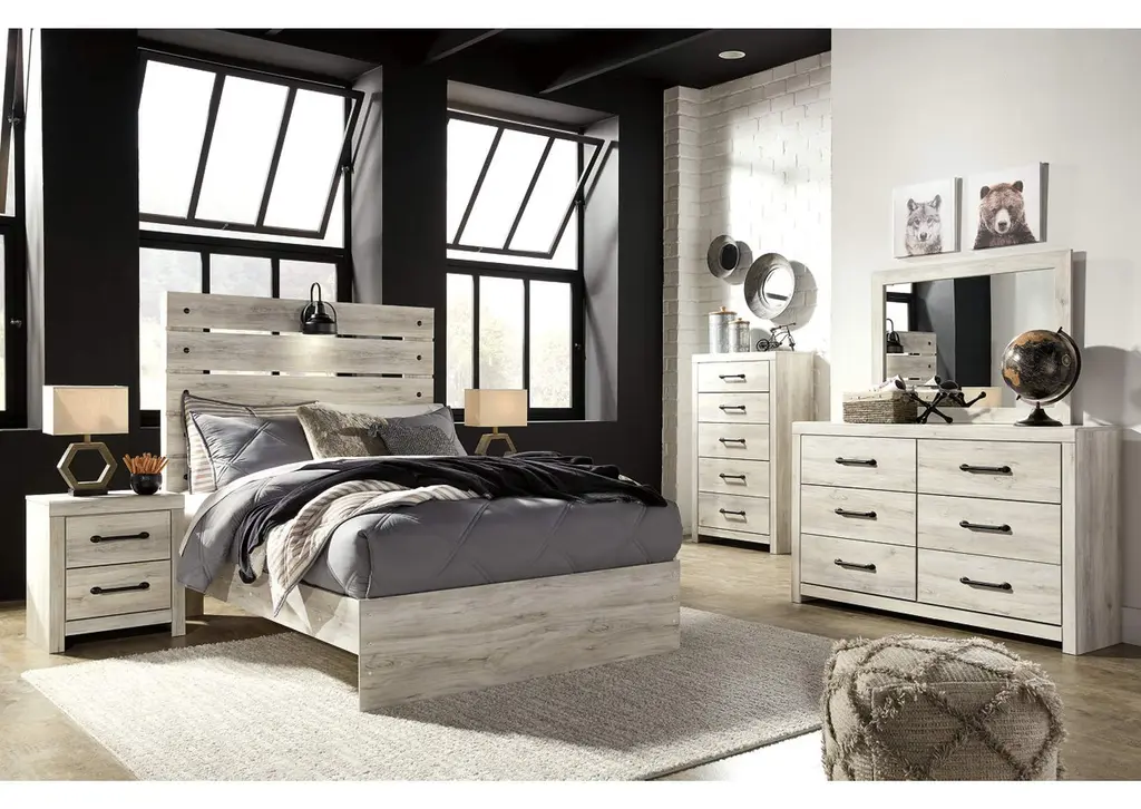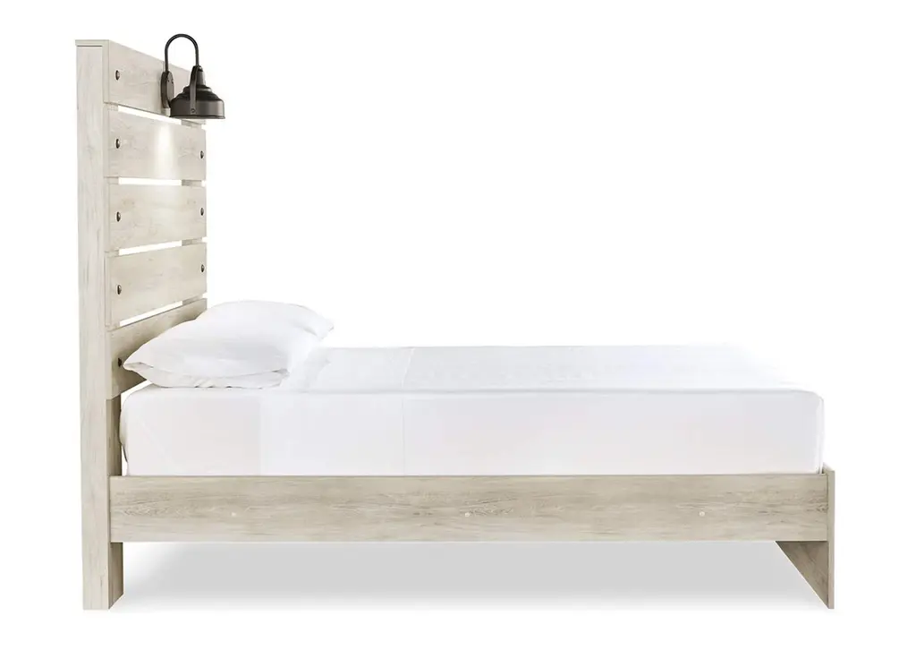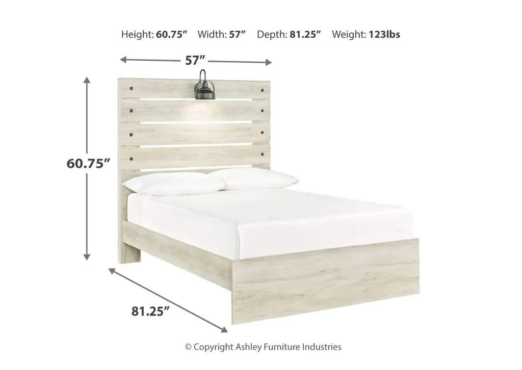 What a delightful take on rustic industrial style. Whether modern loft or modern farmhouse, the Cambeck full panel bed makes itself at home. The wispy whitewash palette enhances without covering the grain for that weathered look you crave. Love to read in bed? You’re sure to find the retro-chic light sconce and USB plug-ins on the open-slat style headboard such a bright idea. Weight 123.000 lbs. (55.35kgs.)