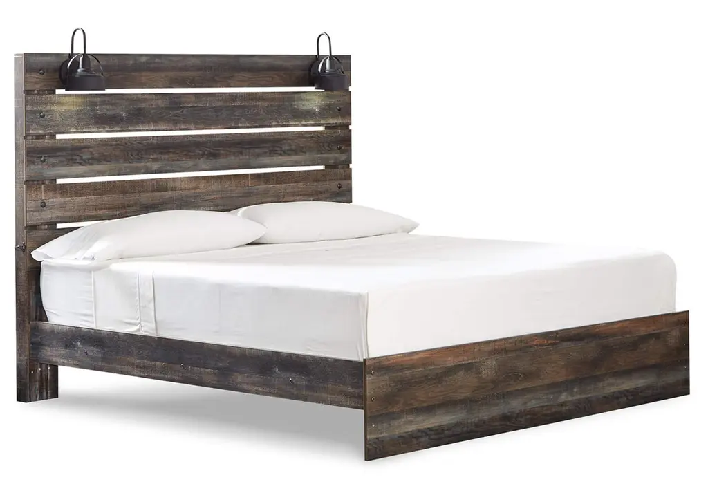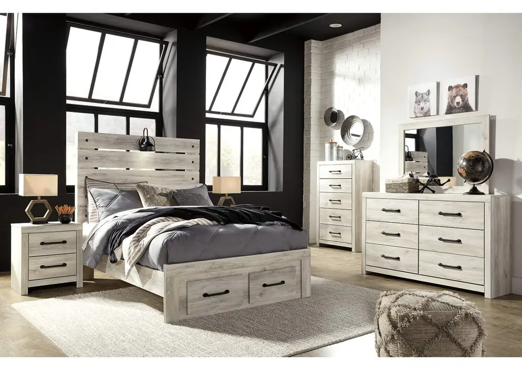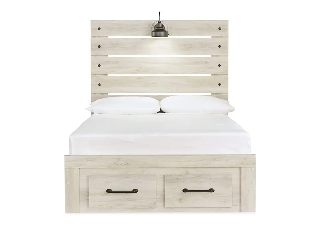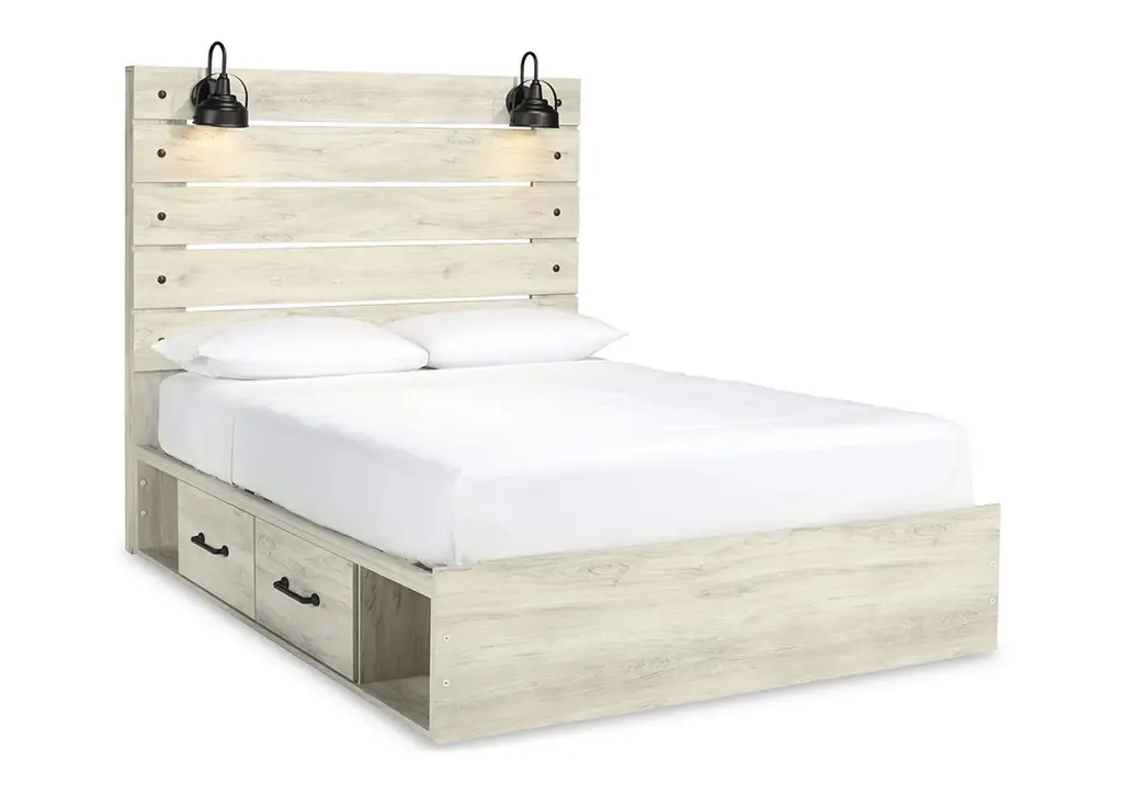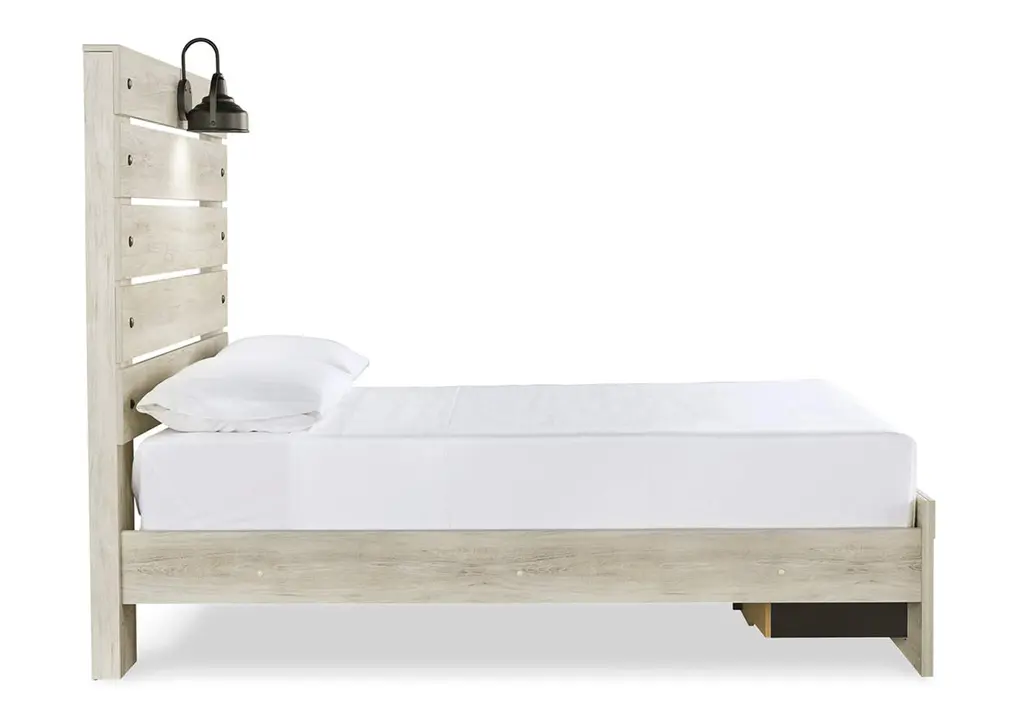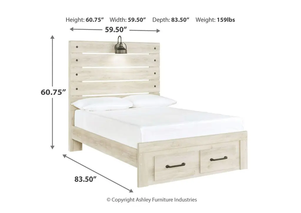 What a delightful take on rustic industrial style. Whether modern loft or modern farmhouse, the Cambeck full panel bed makes itself at home. The wispy whitewash palette enhances without covering the grain for that weathered look you crave. Love to read in bed? You’re sure to find the retro-chic light sconce and USB plug-ins on the open-slat style headboard such a bright idea. Elongated drawer pulls on the footboard storage drawers elevate the aesthetic. Weight 159.000 lbs. (71.55kgs.)