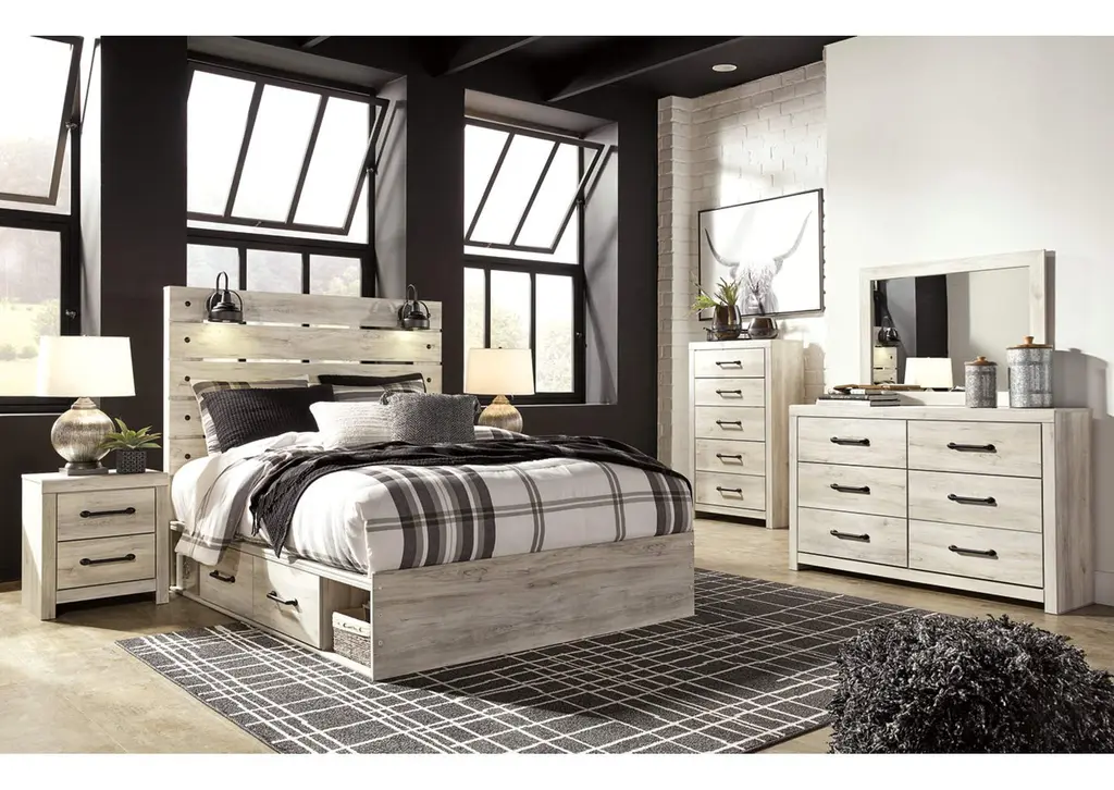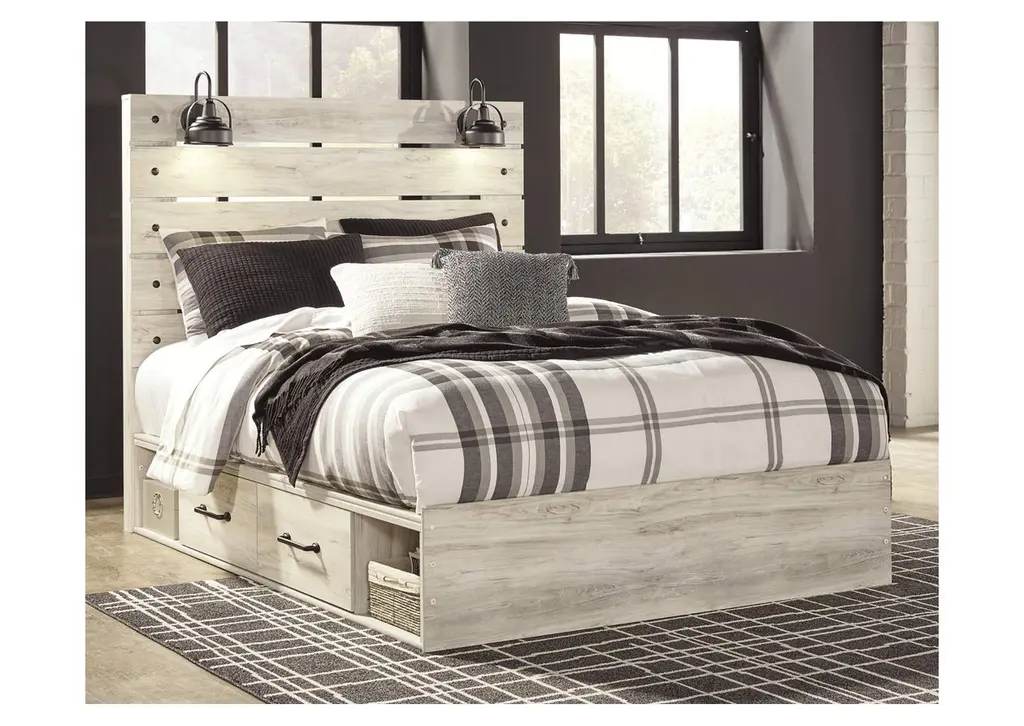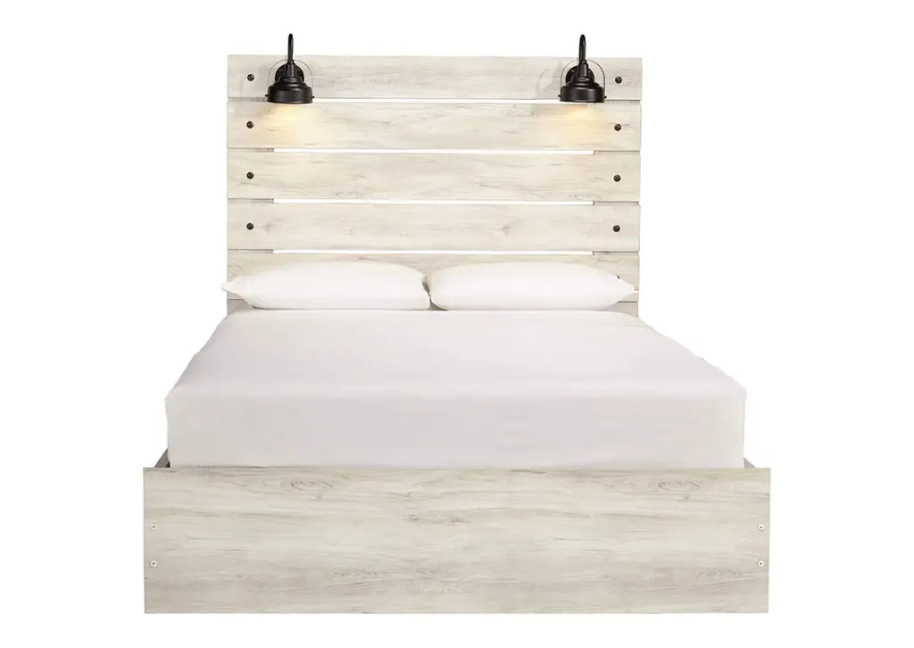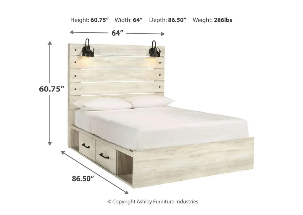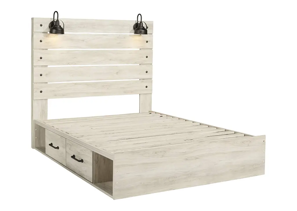 What a delightful take on rustic industrial style. Whether modern loft or modern farmhouse, the Cambeck queen panel storage bed makes itself at home. The wispy whitewash palette enhances without covering the grain for that weathered look you crave. Love to read in bed? You’re sure to find the retro-chic light sconces and USB plug-ins on the open-slat style headboard such a bright idea. Elongated drawer pulls on the under bed storage drawers elevate the aesthetic. Weight 328.000 lbs. (147.6kgs.)