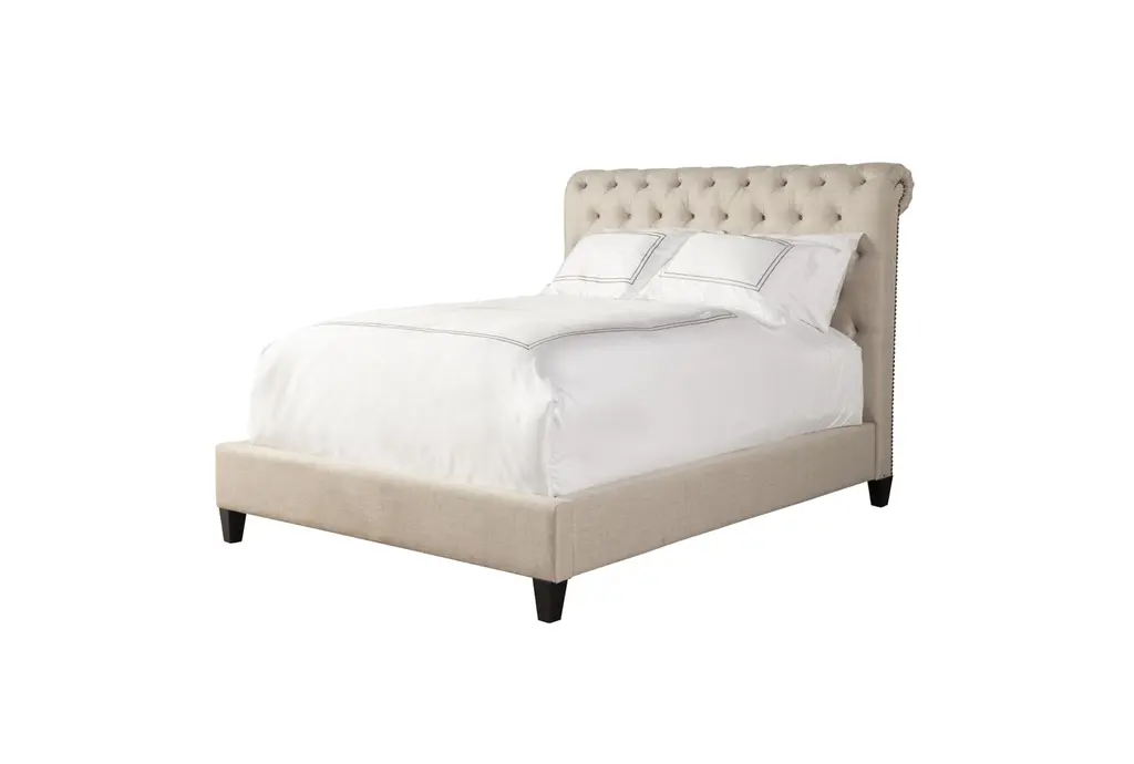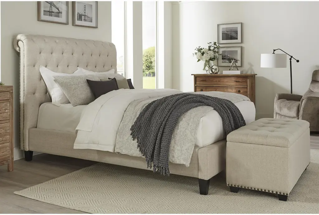 Experience the epitome of comfort and elegance with the Carleigh Beige King Upholstered Panel Bed. This traditional bed, upholstered in a soft Downey beige fabric, brings a timeless and classic touch to your bedroom. The high-performance 100% polyester fabric ensures durability while maintaining a luxurious feel, making it a perfect addition to your sleeping space.