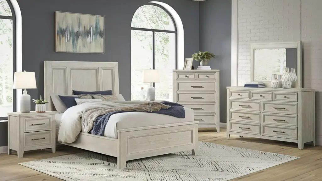 The Carlson Panel Bed offers transitional style blended with the casual nature of lightly wire brushed pine solids and veneer.