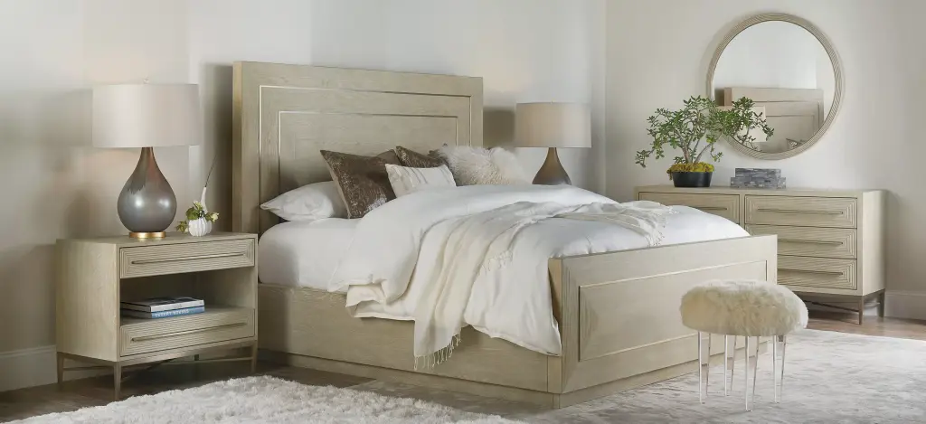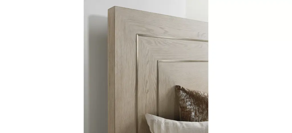 Infuse your master suite with calm and tranquility with the Cascade California King Panel Bed, featuring a sophisticated contrast of materials. Crafted of Oak Veneers in a soft taupe finish with dry brushing, this statement bed is accented with champagne-colored metal inlays for an alluring sparkle. Includes the headboard, footboard and rails.