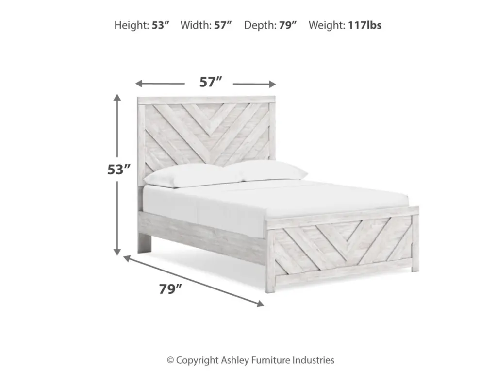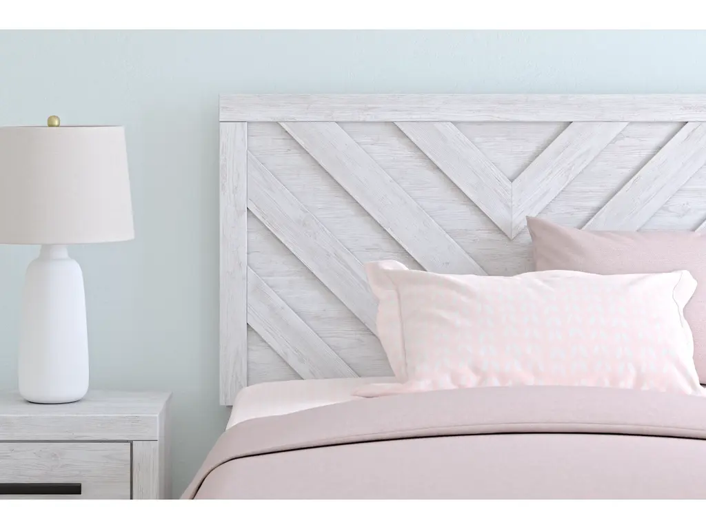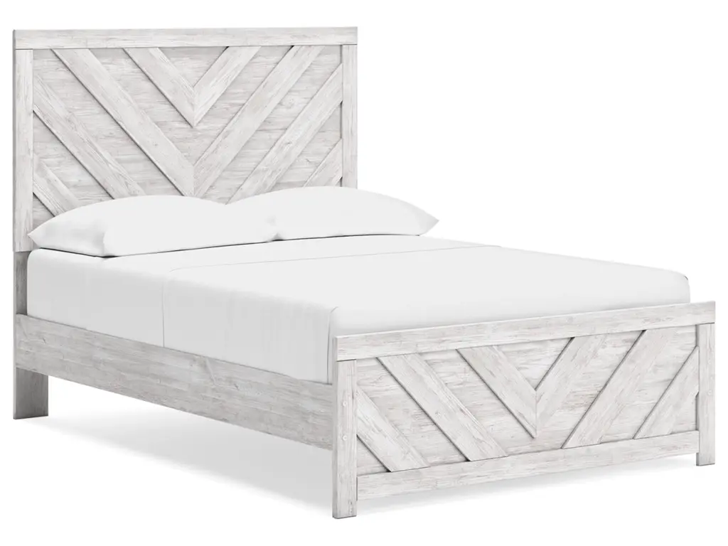 Charmingly designed, the Cayboni full panel bed embraces the aesthetics of countryside living and repurposes them for modern settings. Its whitewash paint, replicating the wear and tear of time, appeals to your love of vintage character. And a chic chevron pattern on the headboard and footboard keeps your bedroom effortlessly on trend.