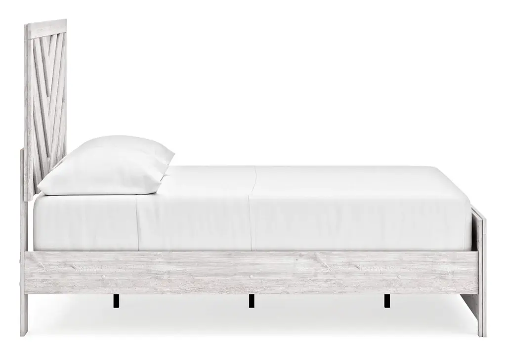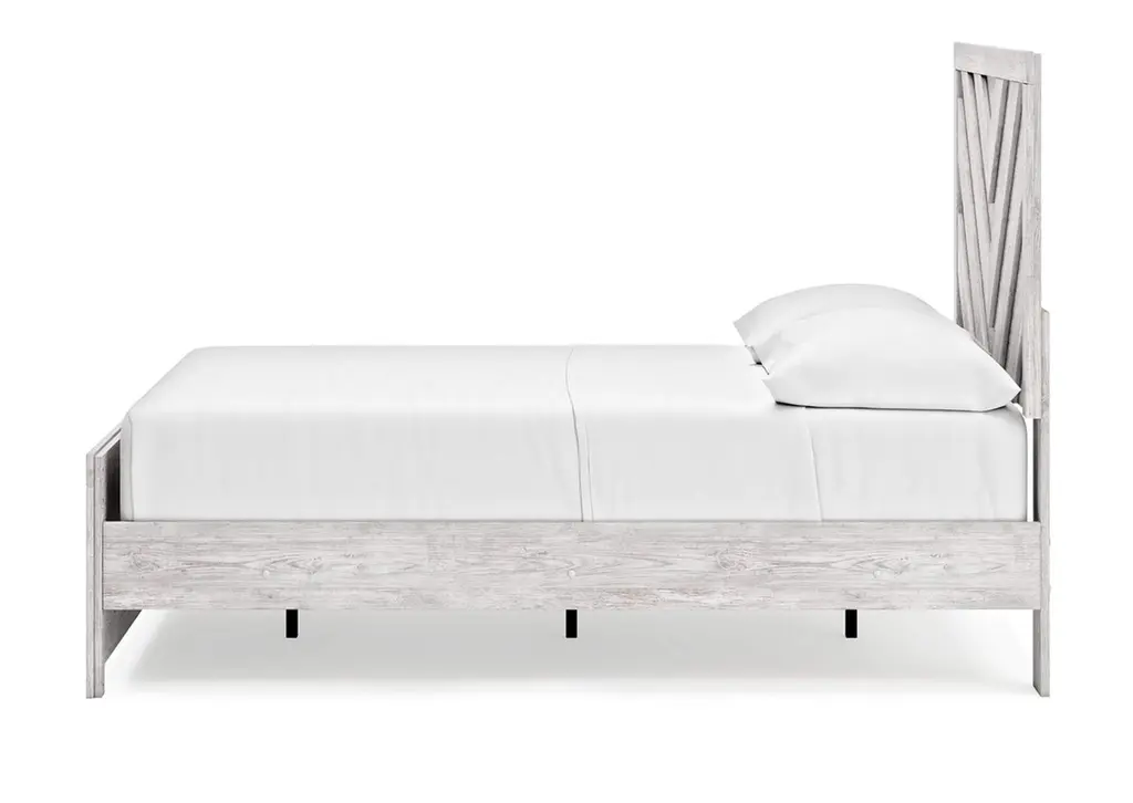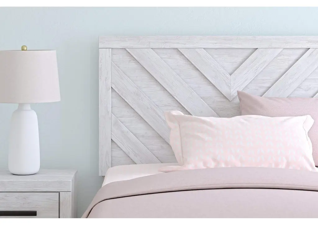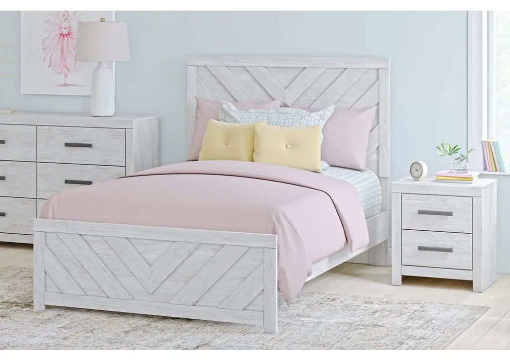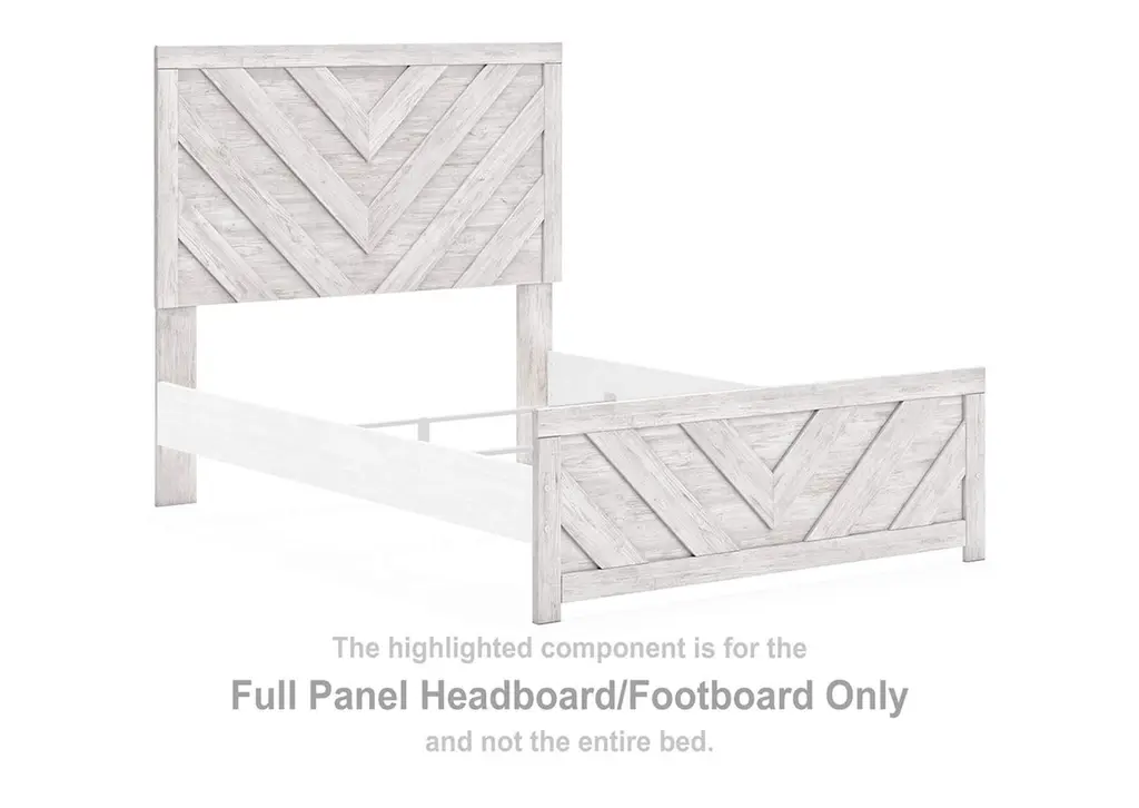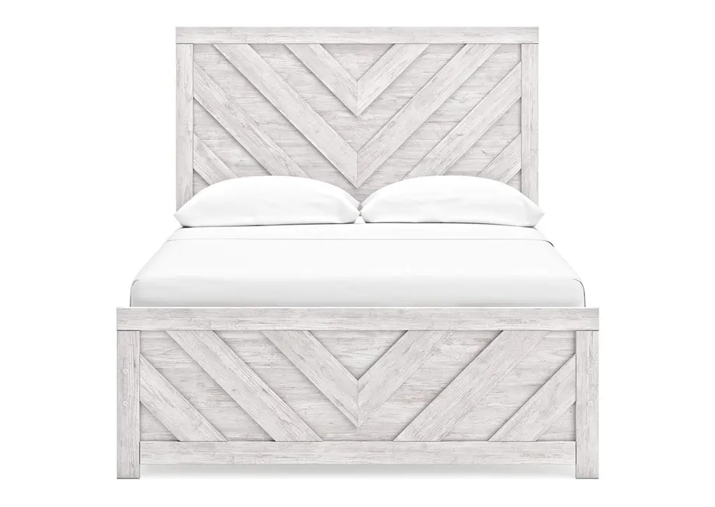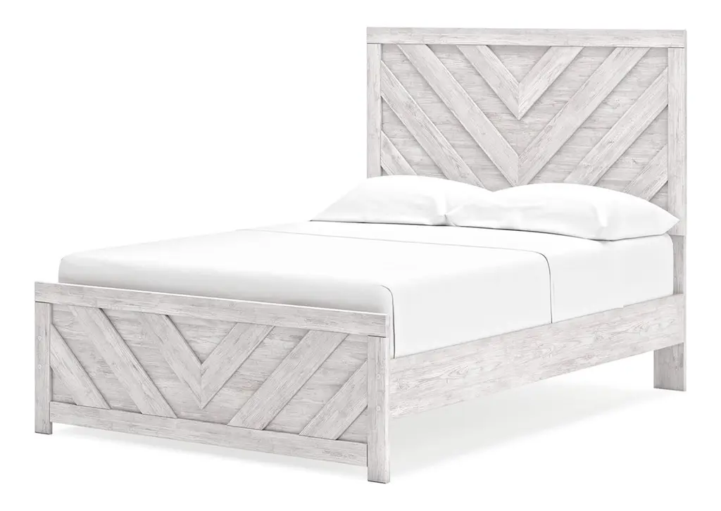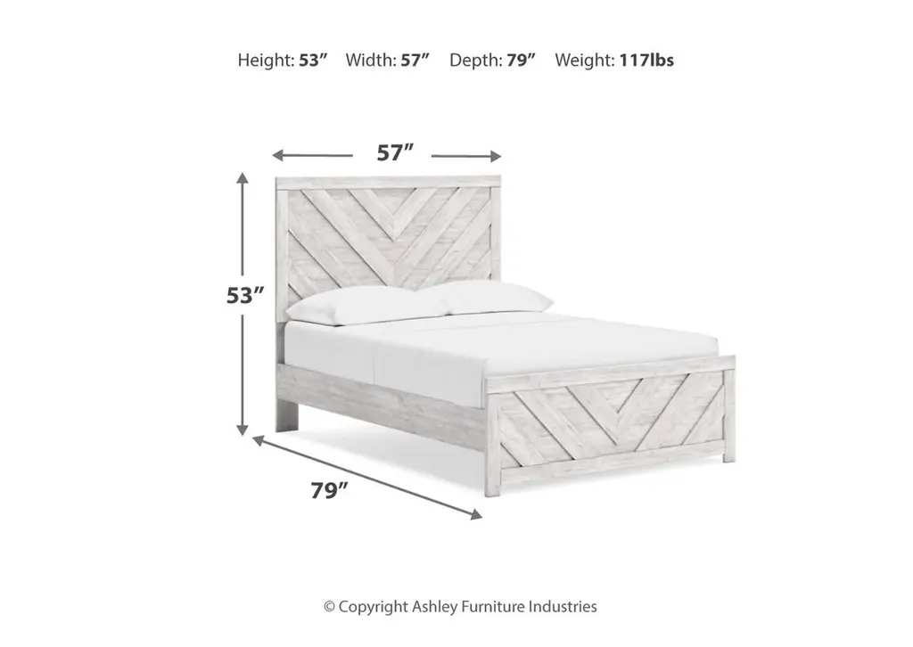 Charmingly designed, the Cayboni full panel bed embraces the aesthetics of countryside living and repurposes them for modern settings. Its whitewash paint, replicating the wear and tear of time, appeals to your love of vintage character. And a chic chevron pattern on the headboard and footboard keeps your bedroom effortlessly on trend. Weight 117.000 lbs. (52.65kgs.)