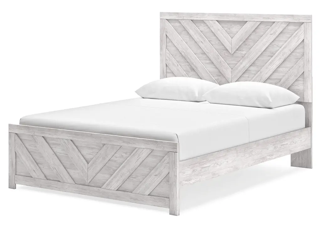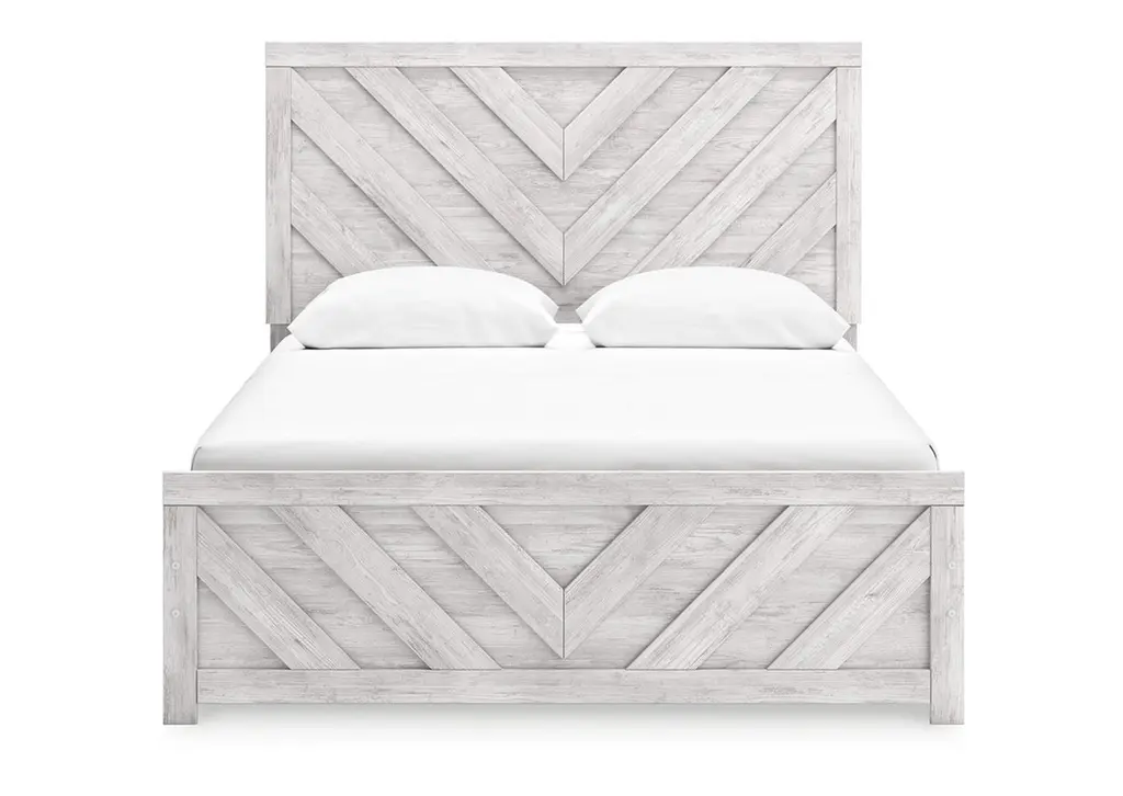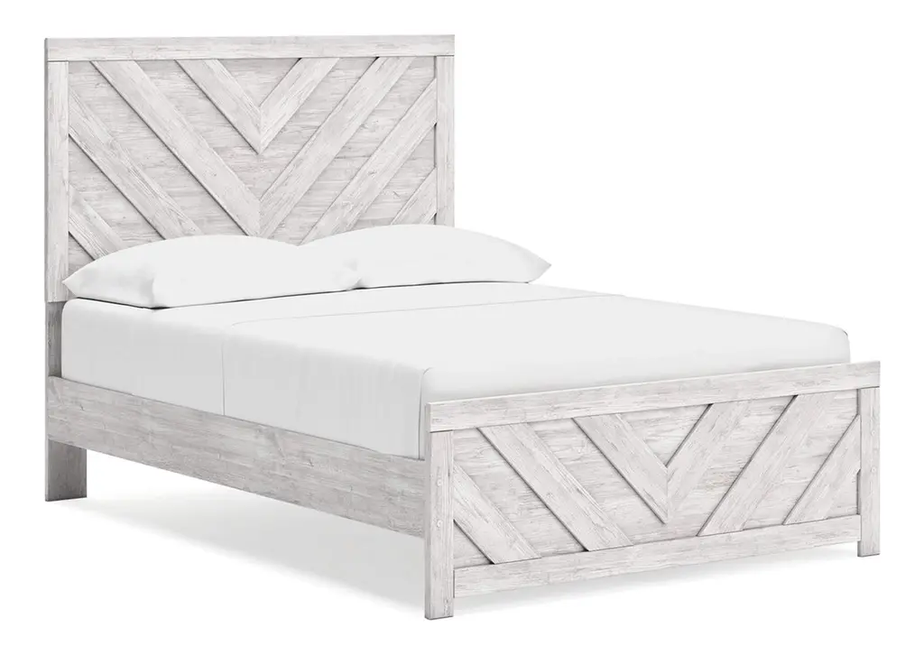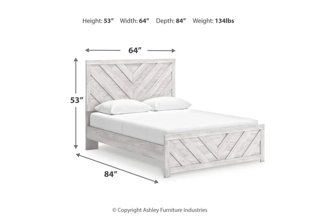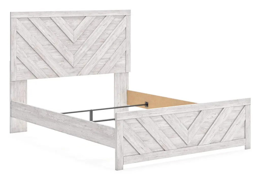Charmingly designed, the Cayboni queen panel bed embraces the aesthetics of countryside living and repurposes them for modern settings. Its whitewash paint, replicating the wear and tear of time, appeals to your love of vintage character. And a chic chevron pattern on the headboard and footboard keeps your bedroom effortlessly on trend. Weight 134.000 lbs. (60.3kgs.)