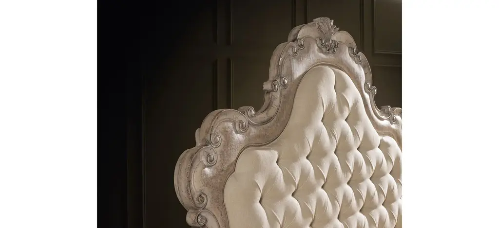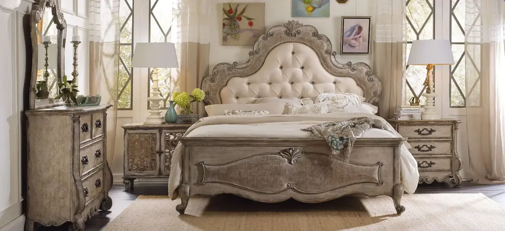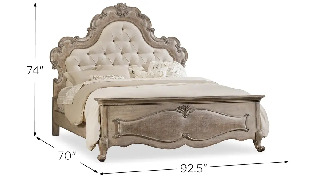 Create an intimate retreat of unsurpassed romance with the Chatelet Queen Upholstered Bed, with a softly carved and shaped headboard and inset tufted upholstery. The parchment-colored Antique Linen finish and cabriole legs add to the allure. Includes headboard, footboard and rails. Headboard can be used alone.
