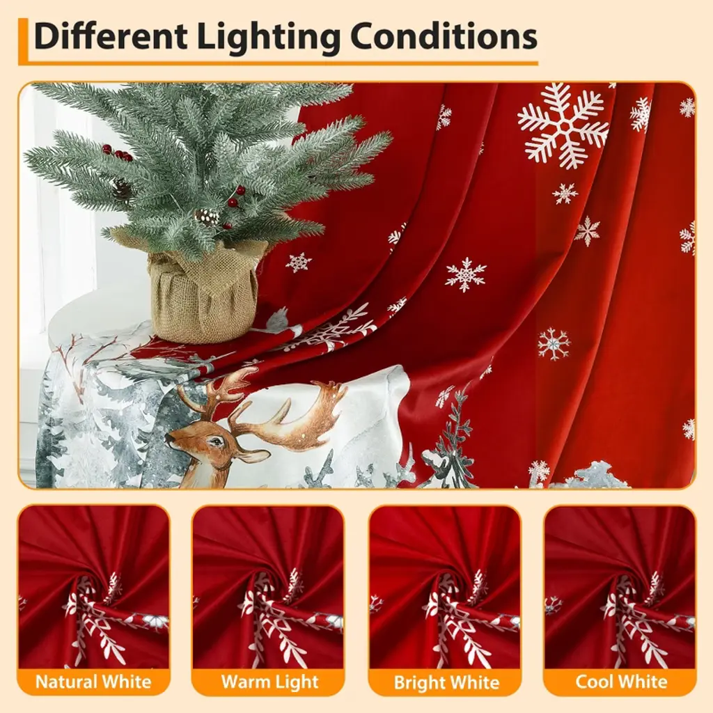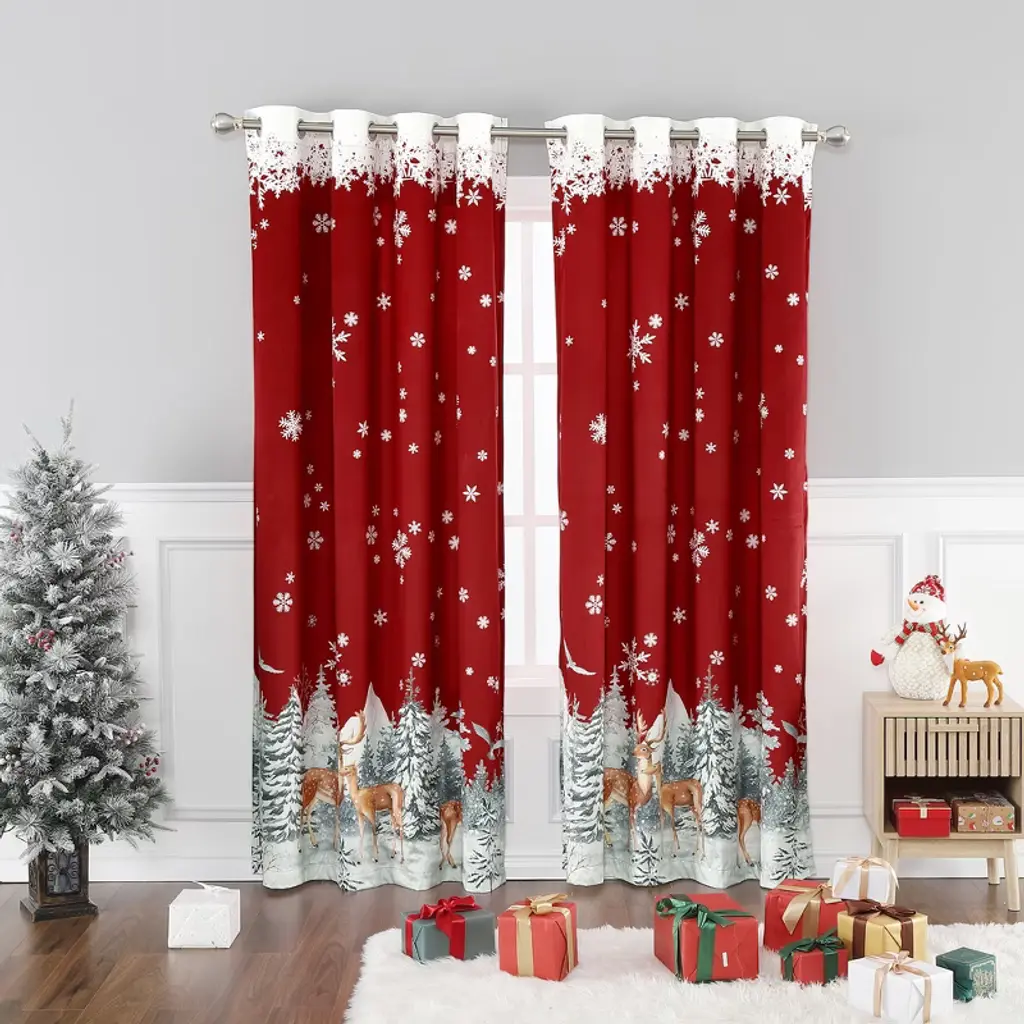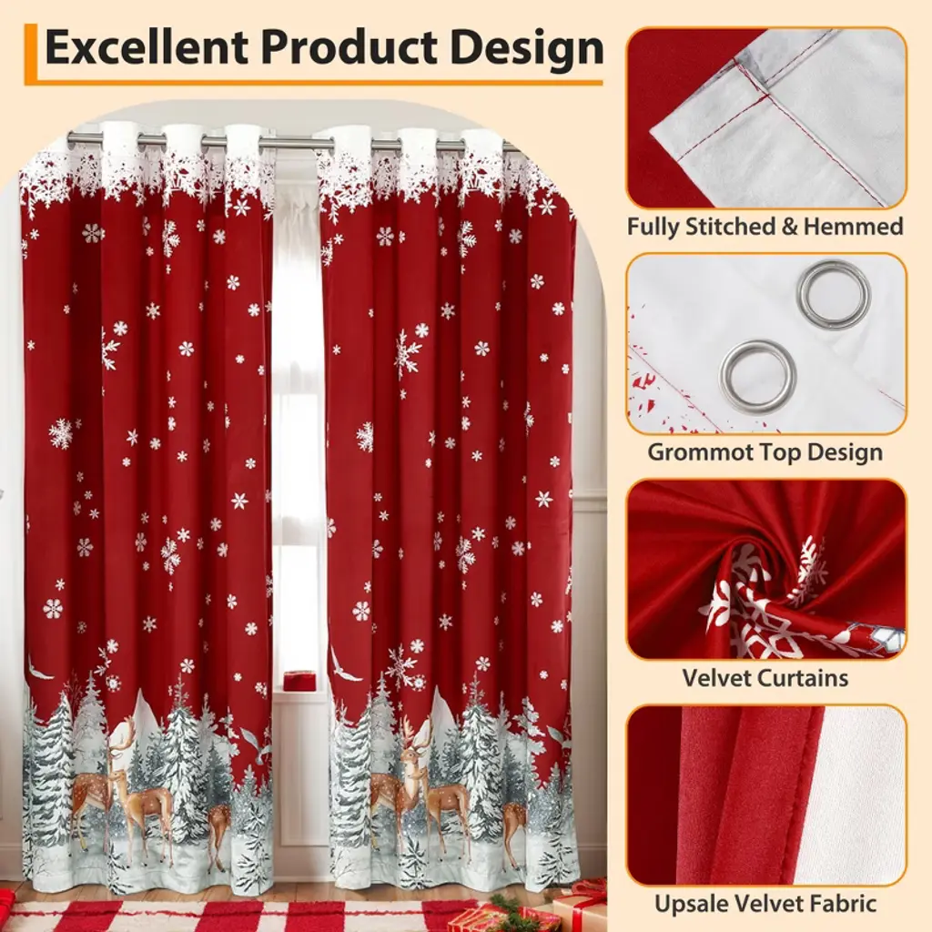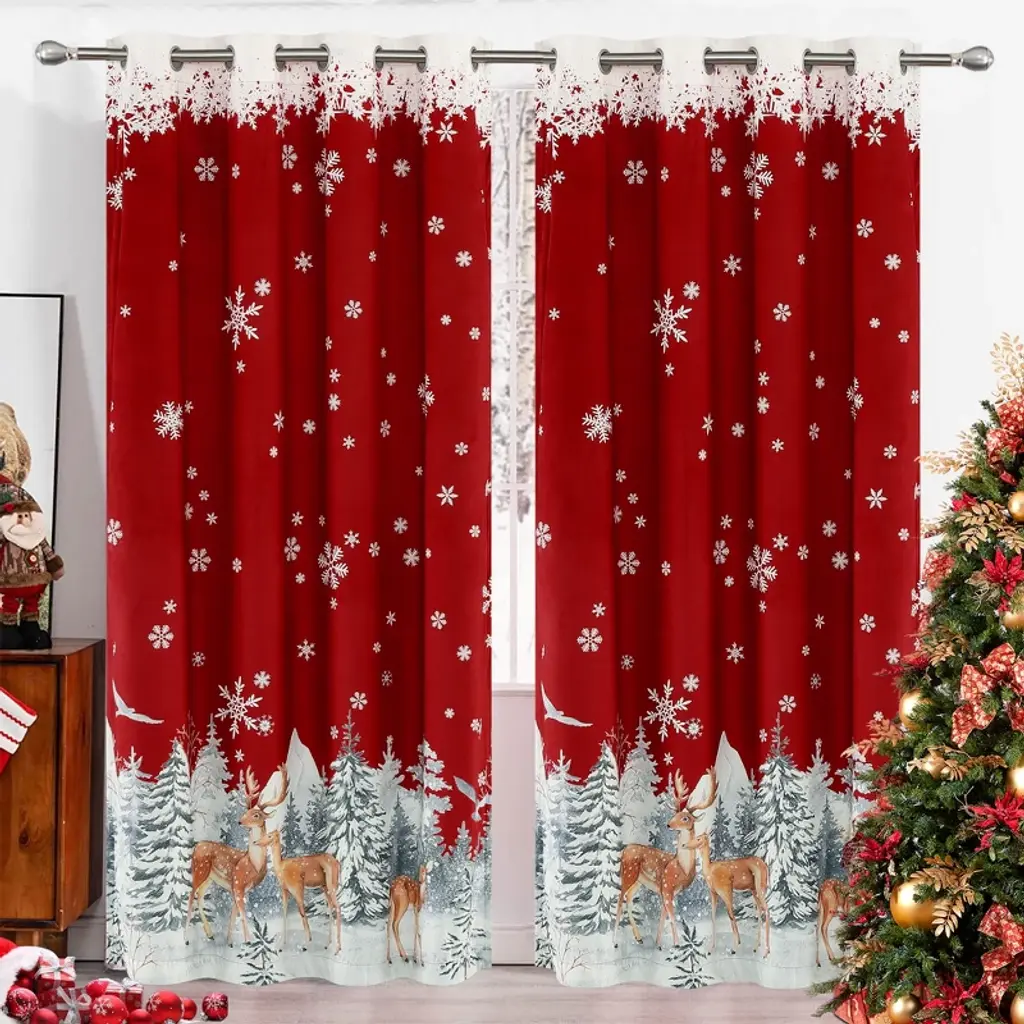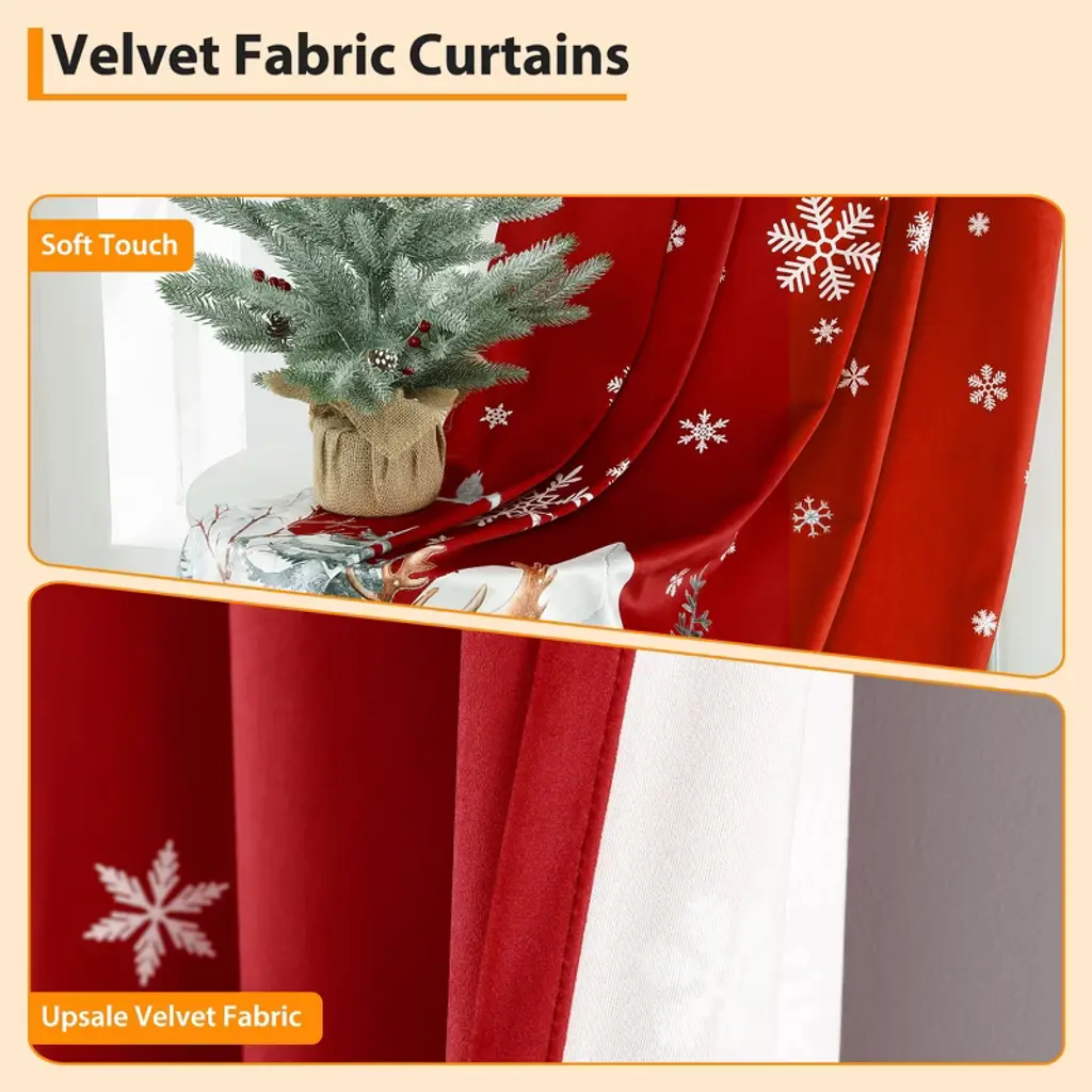 Bring festive warmth and elegance to your home this holiday season with these Christmas red velvet blackout curtains. Adorned with charming snowflake and reindeer patterns, the window panels not only add a cheerful decorative touch, but also block out about 85% of light for enhanced privacy and comfort. Crafted from upscale, fully hemmed velvet, these curtains are soft, durable, and easy to install with sturdy metal grommets. Plus, they're machine washable for effortless care, making them a perfect addition to your living room or bedroom Christmas décor.