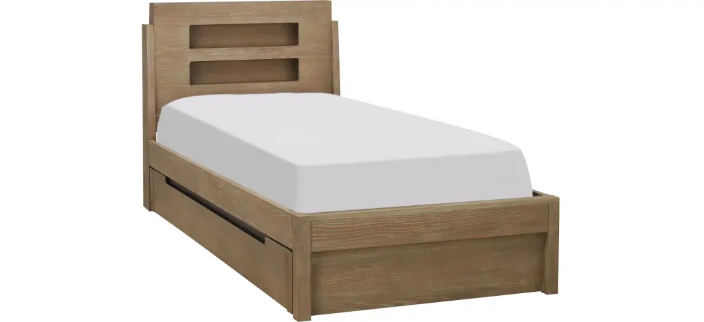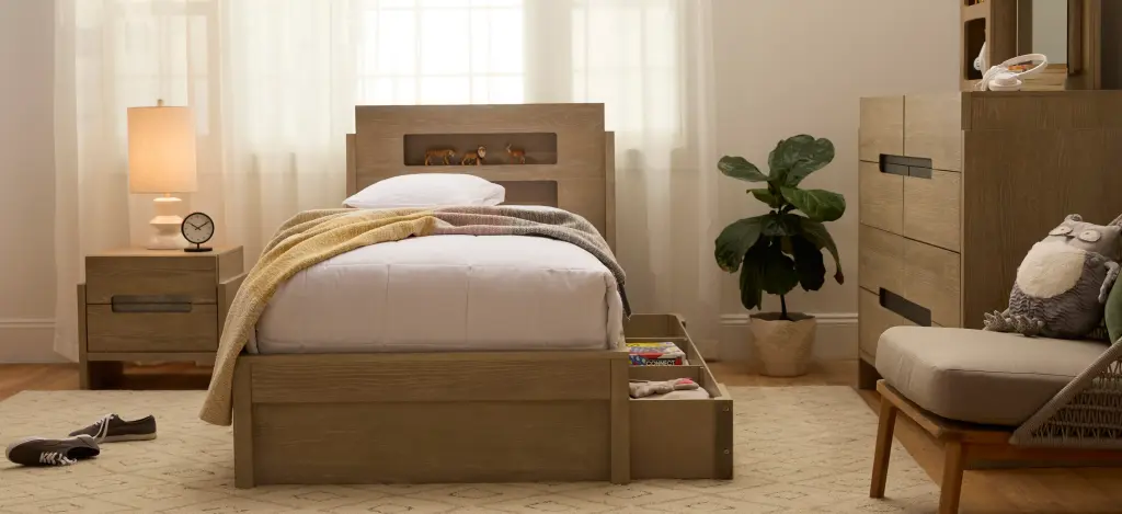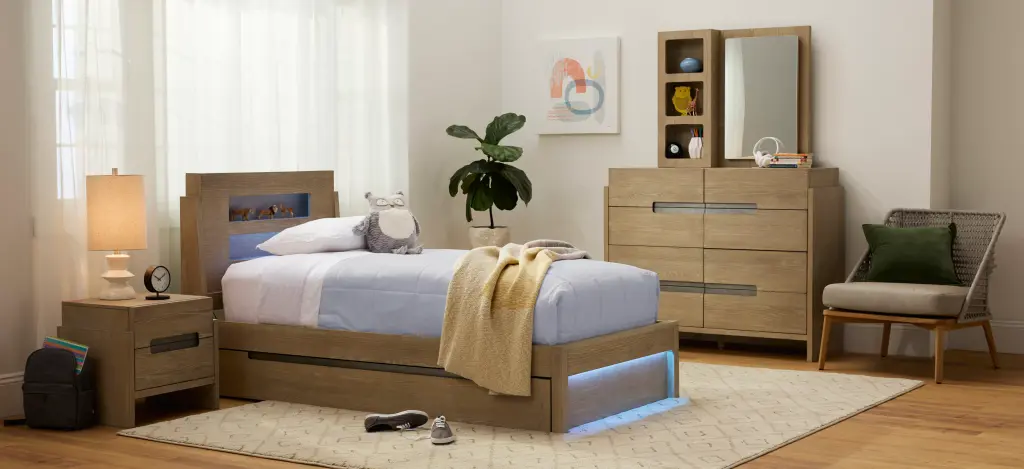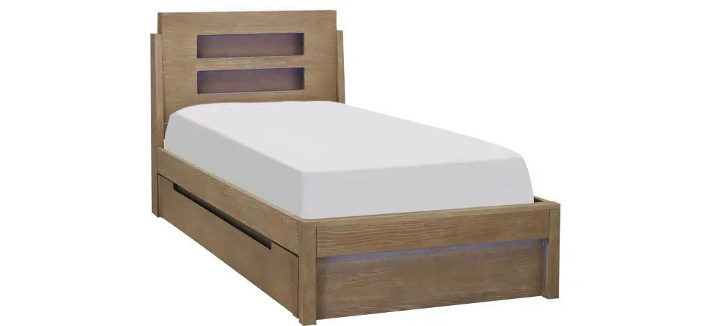 Give your kid the bedroom of their dreams with the Copper Harbor panel bed with storage drawer. Beautiful oak veneers match any color, while two shelves and a drawer offer plenty of underbed storage. You can also keep a second mattress underneath for sleepovers. Plus, remote controlled LED lighting with color change puts the power in their hands to customize their style.