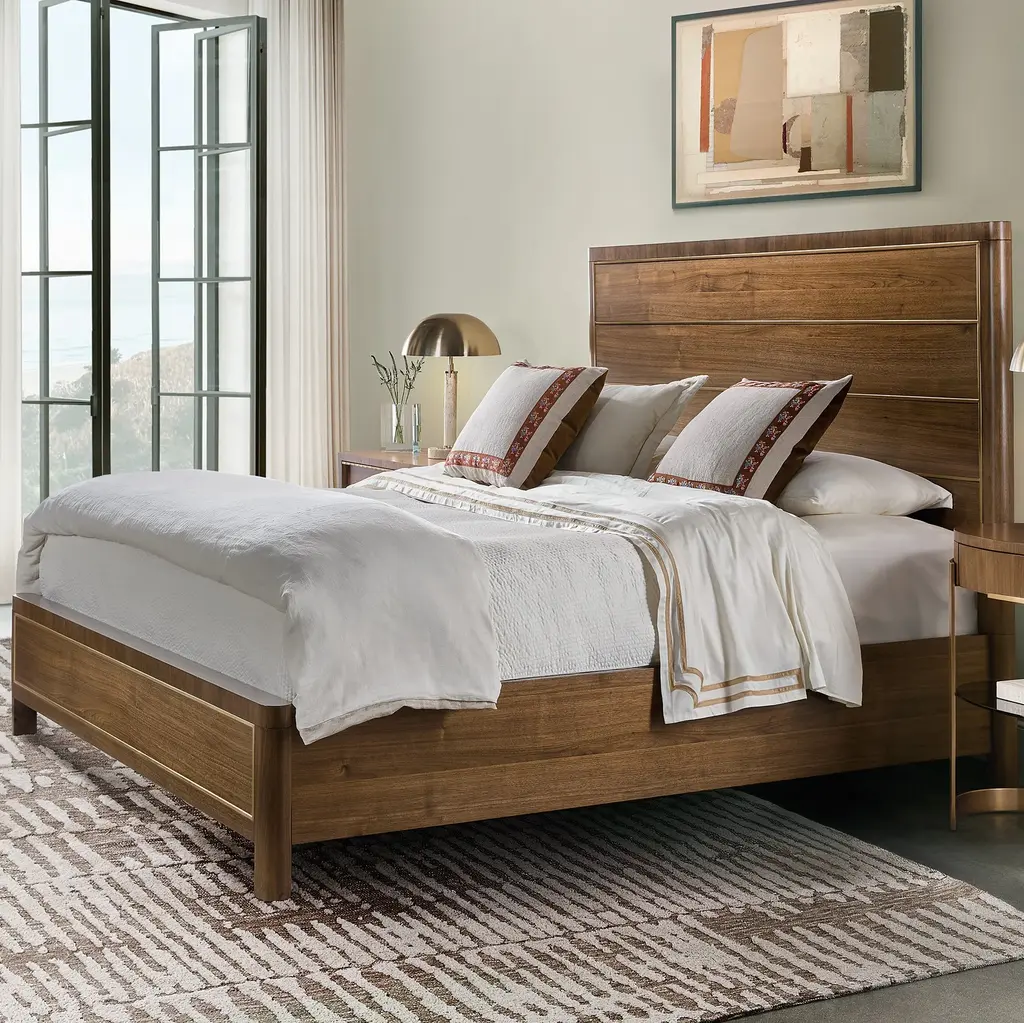 A statement of timeless elegance, the Eleana Panel Bed from Hooker Furniture is a stunning centerpiece for any transitional bedroom. This beautiful bed is crafted from rich walnut veneers in a light caramel finish, with soft, rounded corners that enhance its graceful, sculptural silhouette. The headboard is accented with a clean line of plated Sunlit Bronze metal trim, adding a touch of modern sophistication. A fusion of warm wood tones and cool metallic accents, it brings a sense of understated luxury and comfort to your personal sanctuary. Highlights: