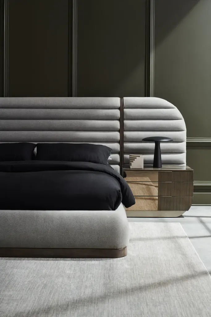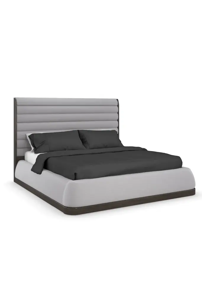 Architectural by design, yet soft around the edges, this channel-tufted bed makes a dramatic impact in a pebble gray billiard cloth fabric. Clean lines are accentuated by Sepia trim, warmly framing the headboard and surrounding platform base. A rounded ledge at the foot of the bed is perfect for sitting when slipping off your shoes and getting dressed.