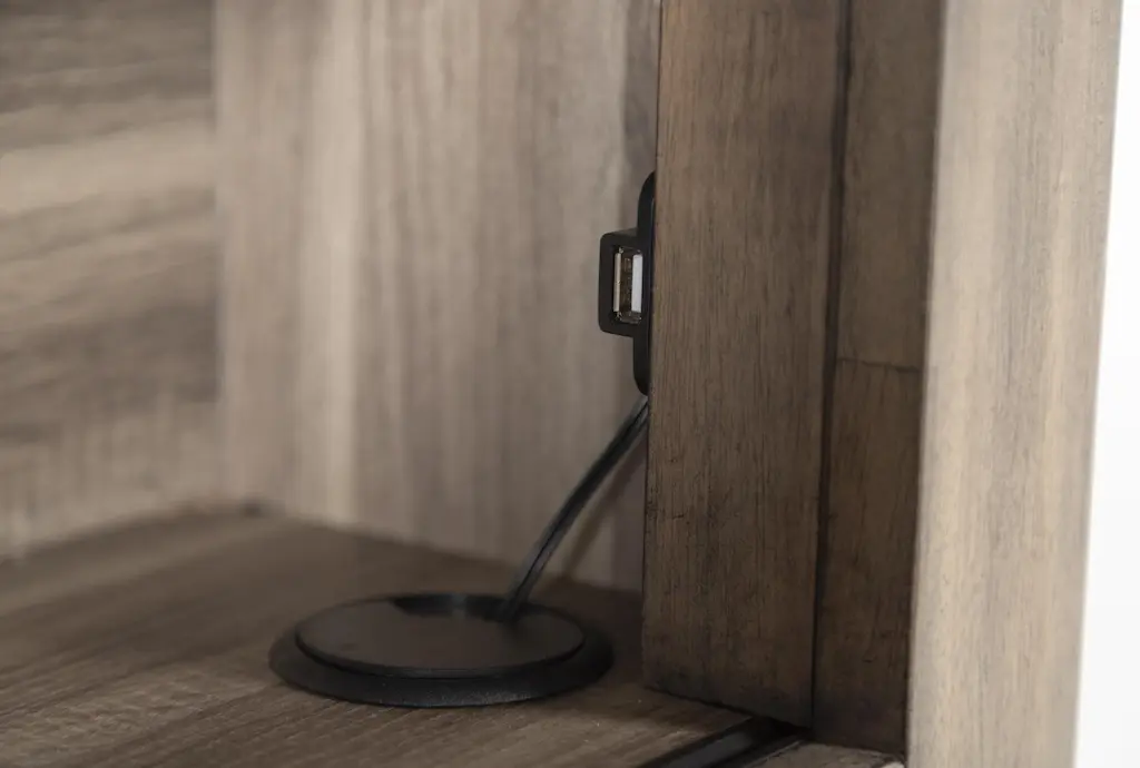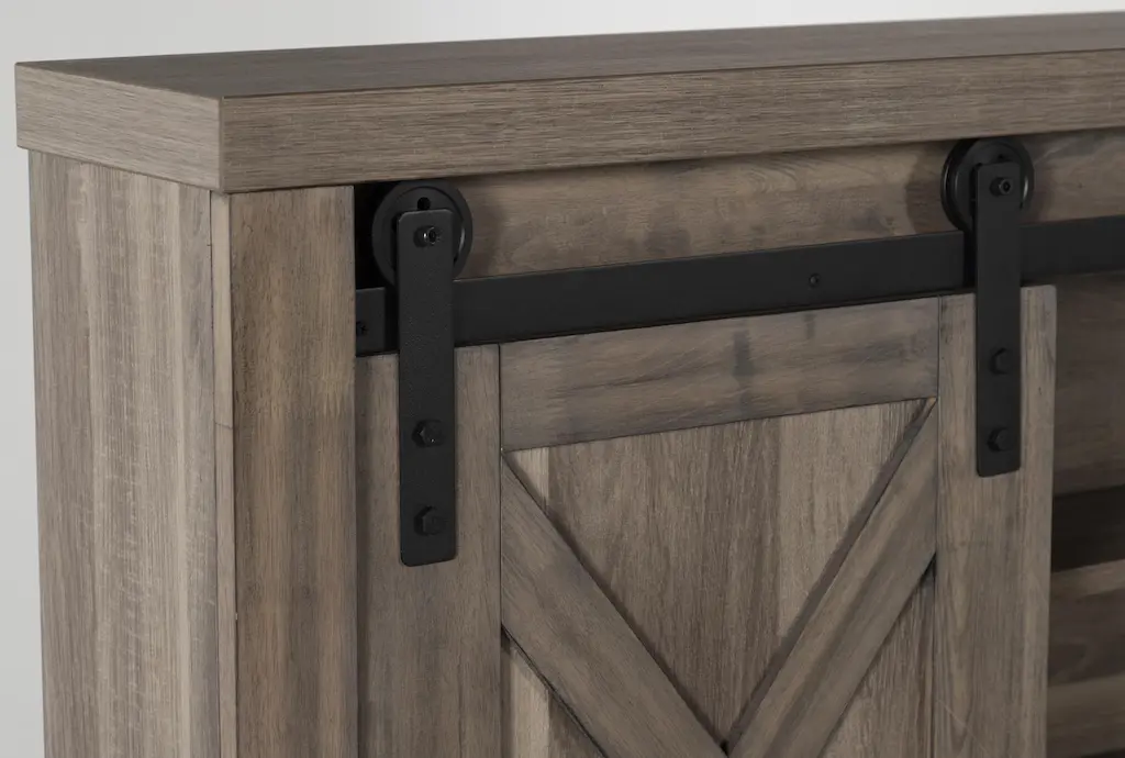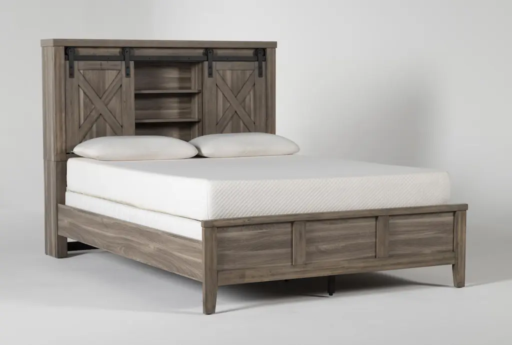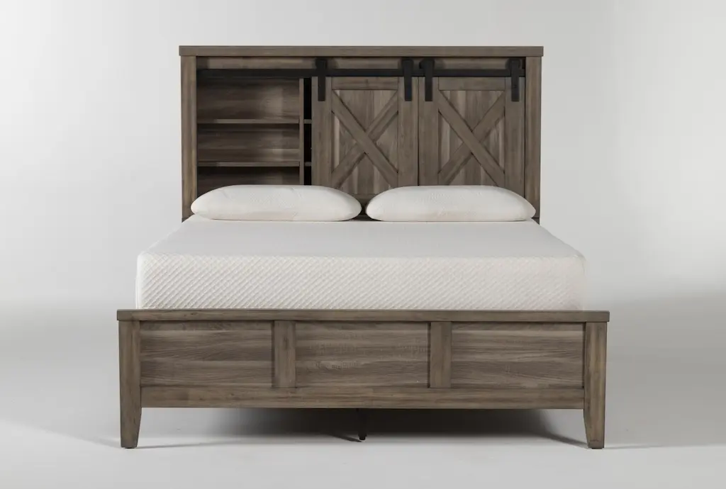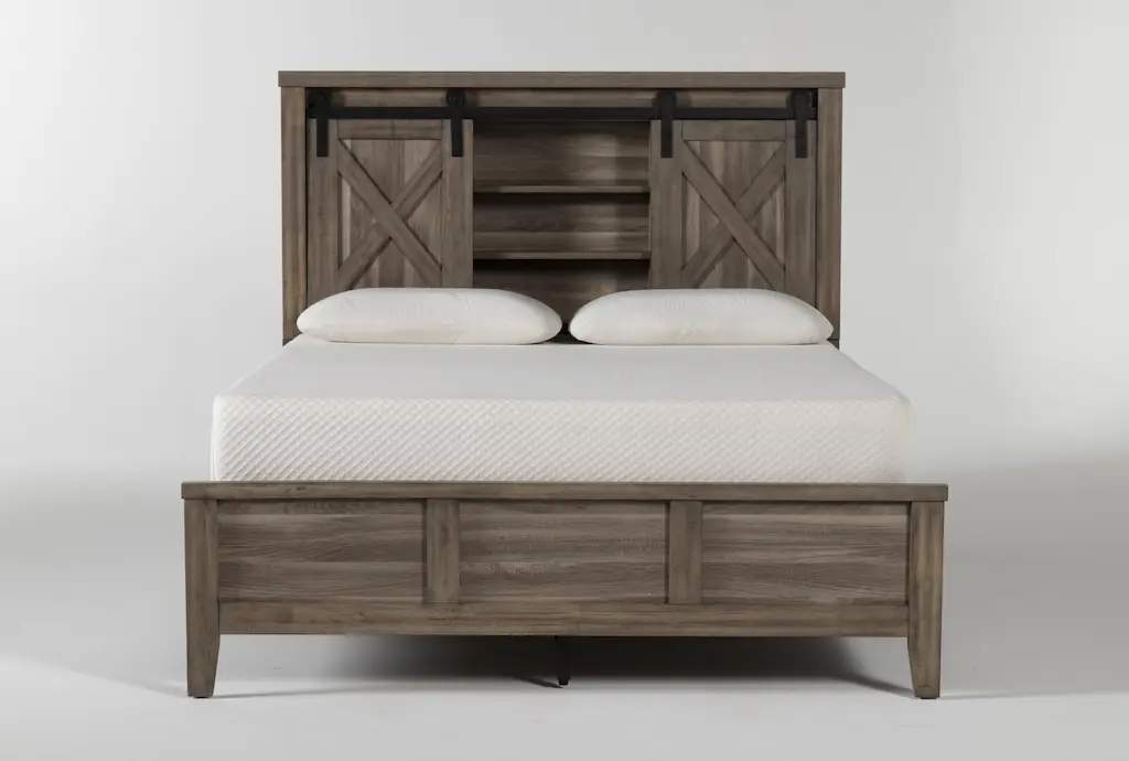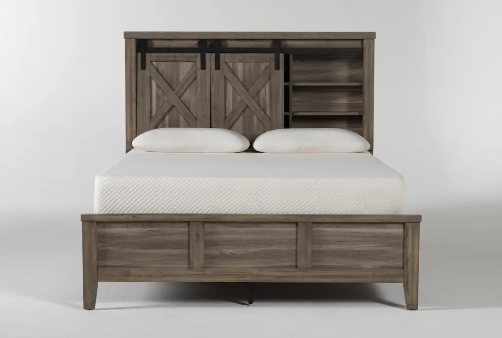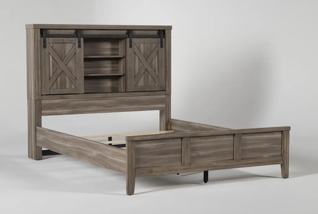 Our Haskell bed’s charming farmhouse elements will bring warmth and character to your retreat. Wake up to an inviting design that encompasses a sturdy blend of laminate and MDF, which is decked in a grey barnwood finish. Uniquely functional, the headboard is distinguished by a barn door feature with powder-coated metal hardware, shelves and USB ports. With its rustic appeal and handsome details, this piece is an outstanding value.