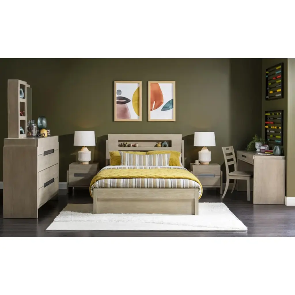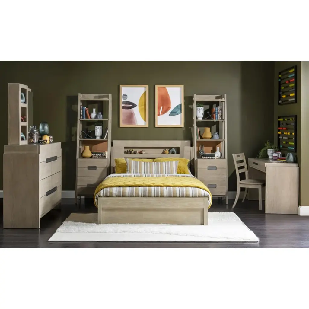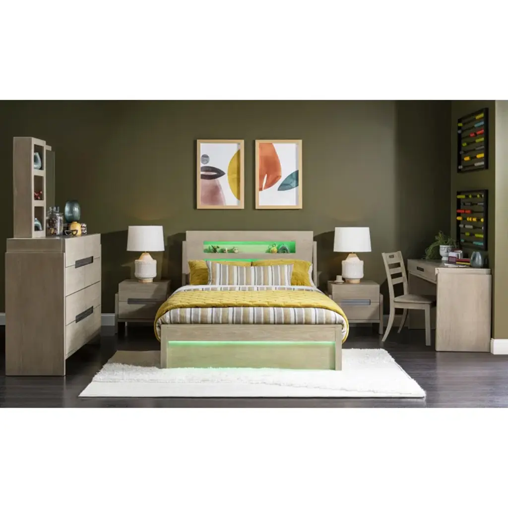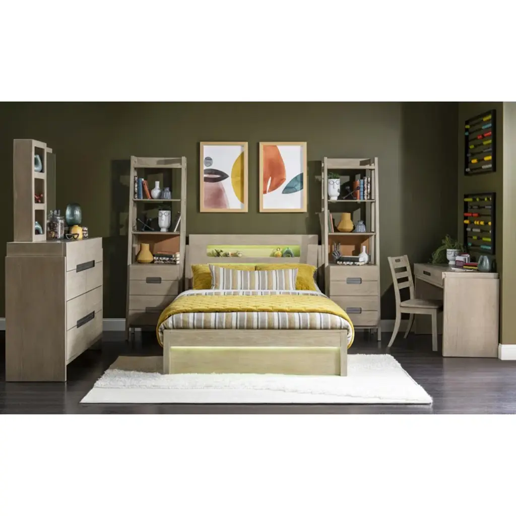 Complete Panel Bed, (Works With -9500) - Clean contemporary forms and multi-functional pieces create the energetic Klier collection by Legacy Kids - Teens. The collection is crafted of Straight Grain, White Oak with a Weathered Oak finish and accented by rustic pewter hardware. A focal-point piece is the Captain's Bed, combining the functions of sleep, study, and storage in a compact footprint. Below the elevated bed are 4 drawers and a trundle, along with 2 pull-out work surfaces. All sizes of the panel beds have inset headboards and footboards with lighting operated by remote control or an app that can be downloaded, allowing children and teens to control lighting colors, patterns, and intensity, and even to program lighting to correspond to the rhythms of the music. - Crafted of Select Hardwoods with Straight Grain and White Oak Veneers - Fun Multi-Colored LED Lighting - Rustic Pewter Hardware
