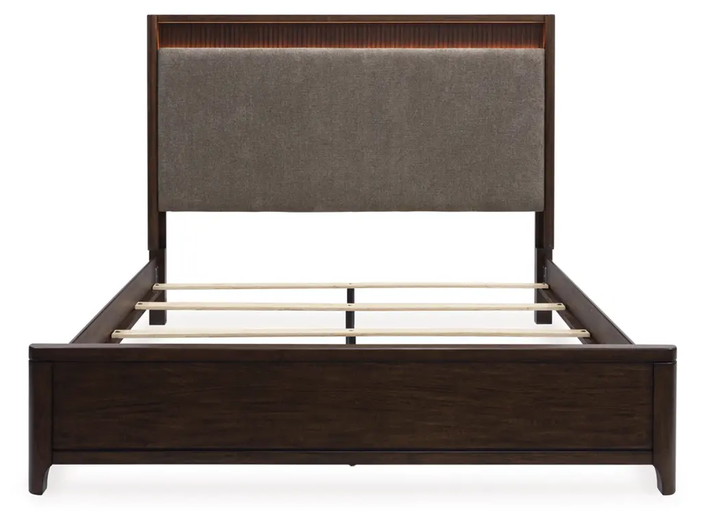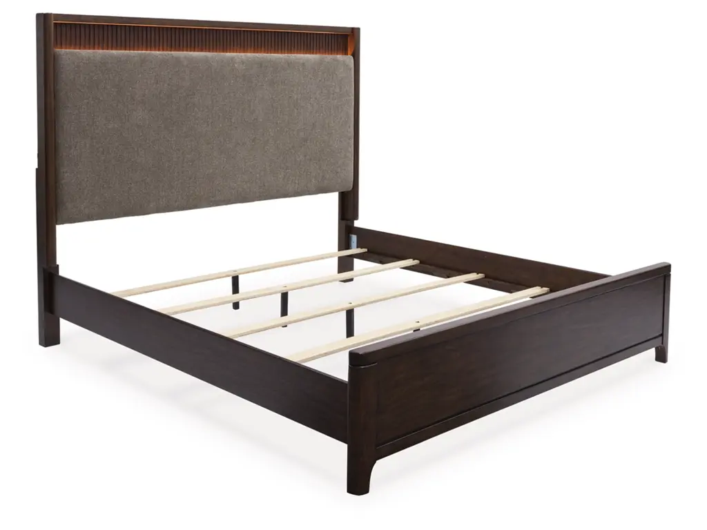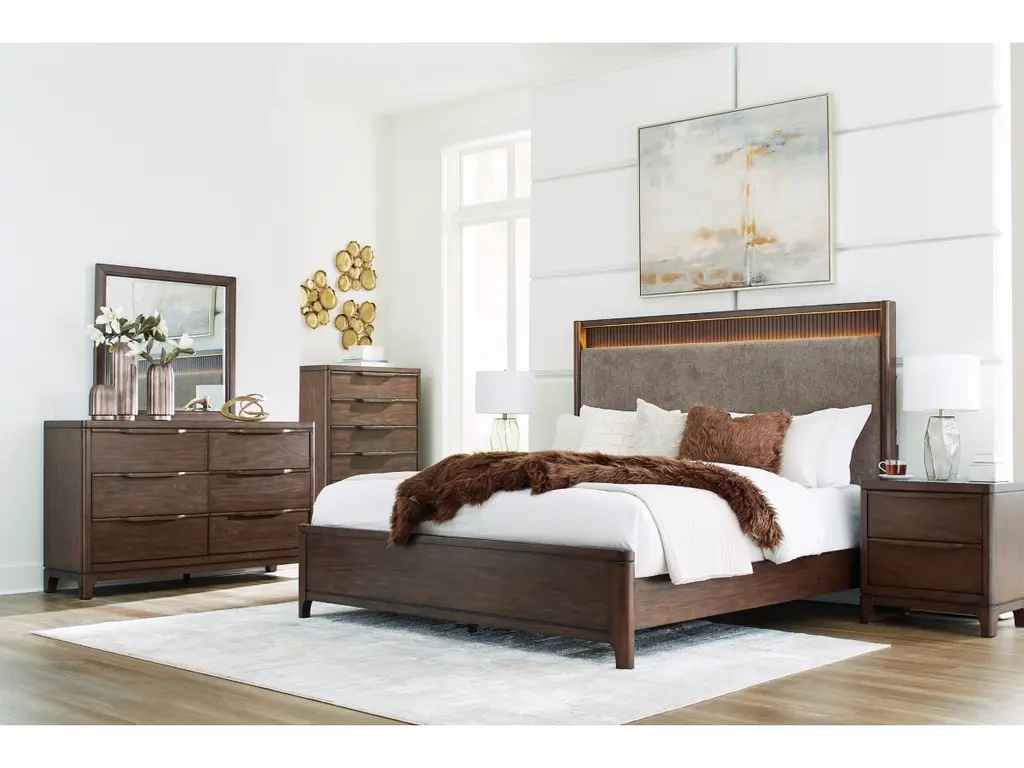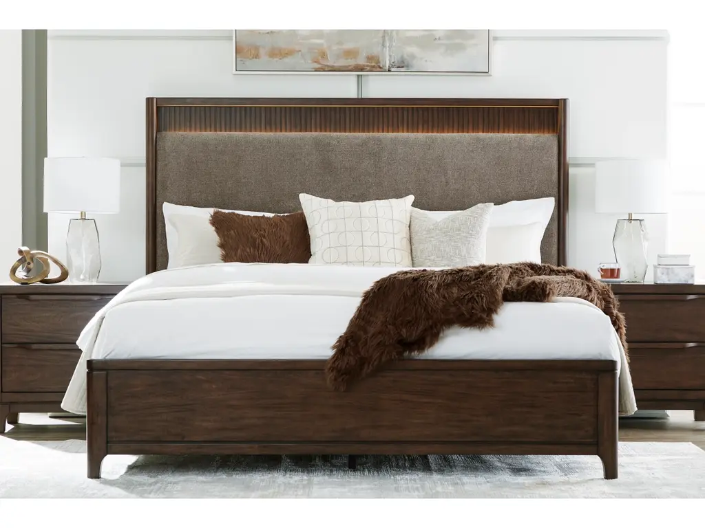 The Korestone king upholstered panel bed exemplifies casual contemporary design with an urban vibe. Warm and inviting with a rich brown finish and soft tan upholstery, it makes winding down before bed that much sleeker thanks to an integrated LED light. A reeded accent panel on the headboard subtly nods to mid-century modern design. What a stunning reflection of your simple-meets-elegant sensibility.
