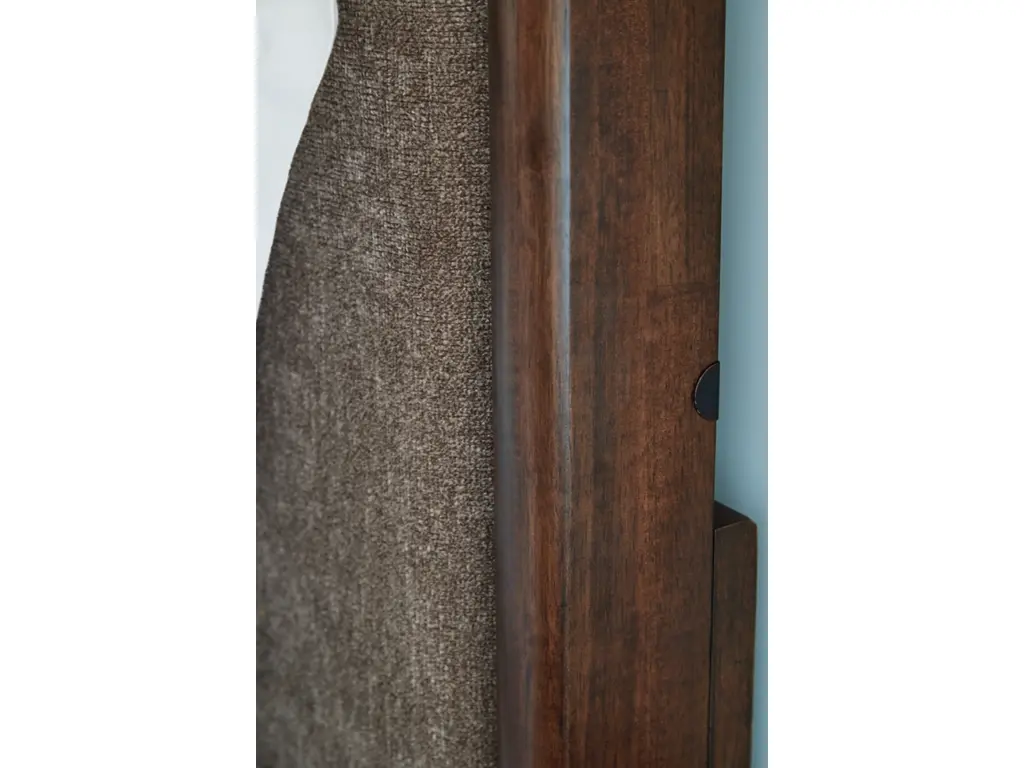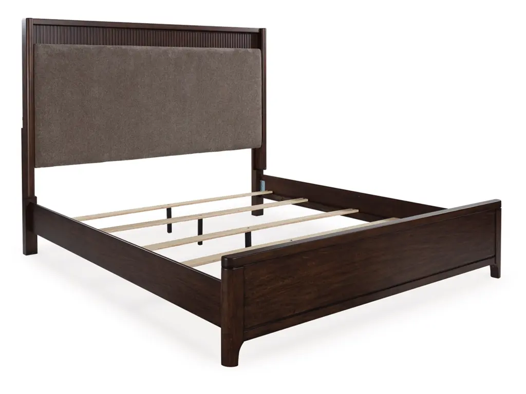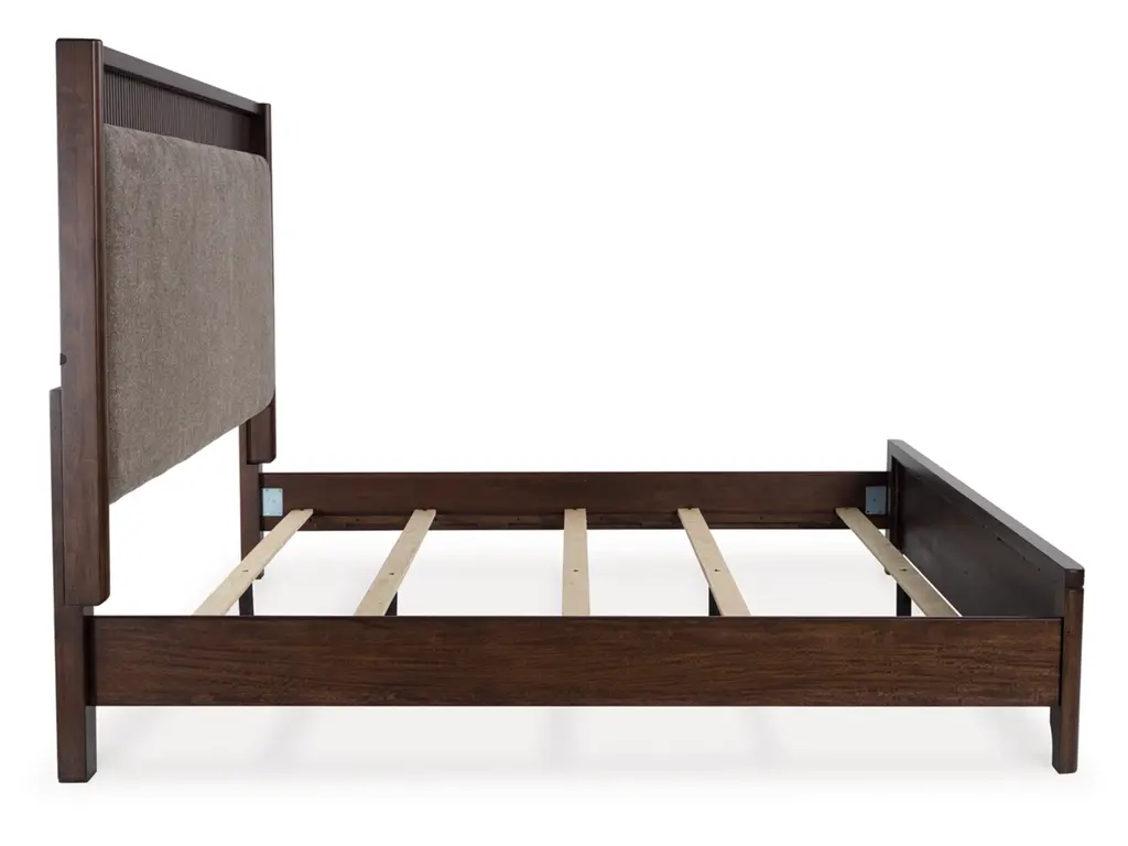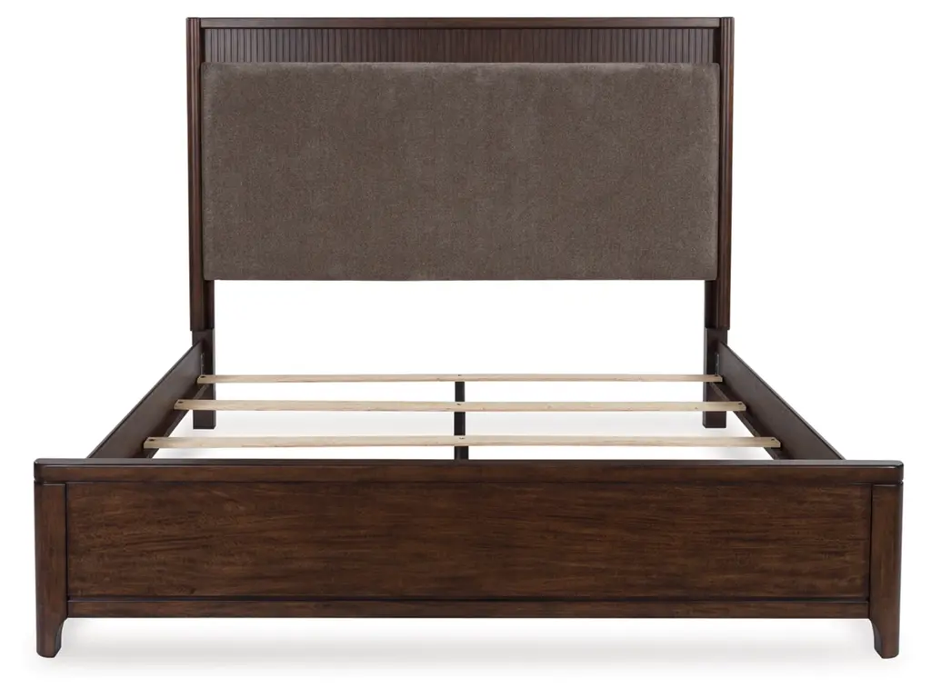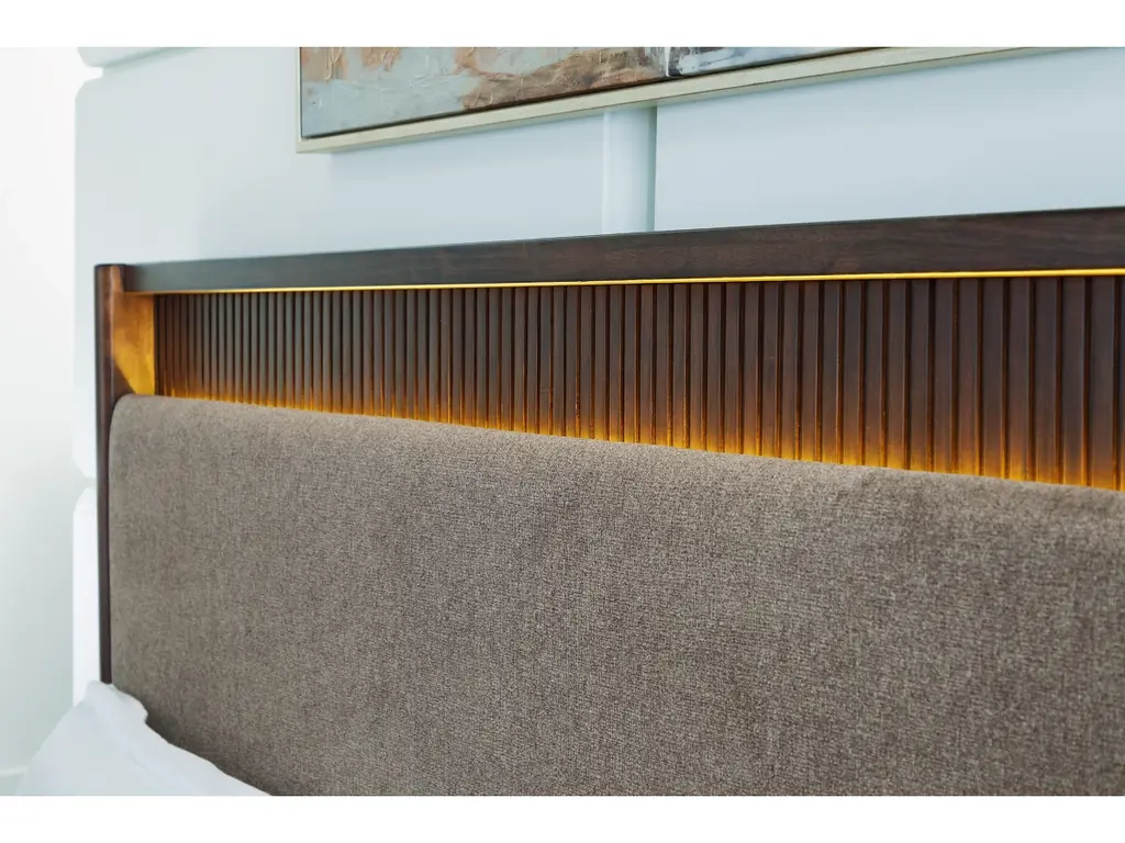 The Korestone king upholstered panel bed exemplifies casual contemporary design with an urban vibe. Warm and inviting with a rich brown finish and soft tan upholstery, it makes winding down before bed that much sleeker thanks to an integrated LED light. A reeded accent panel on the headboard subtly nods to mid-century modern design. What a stunning reflection of your simple-meets-elegant sensibility.