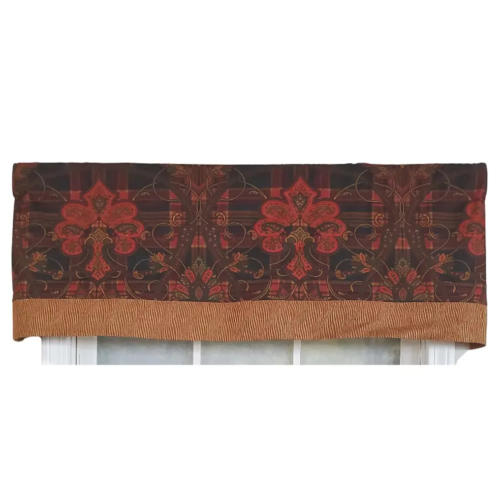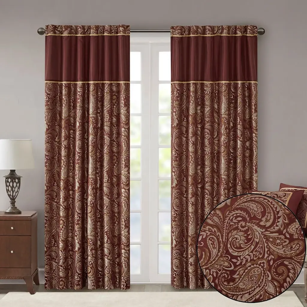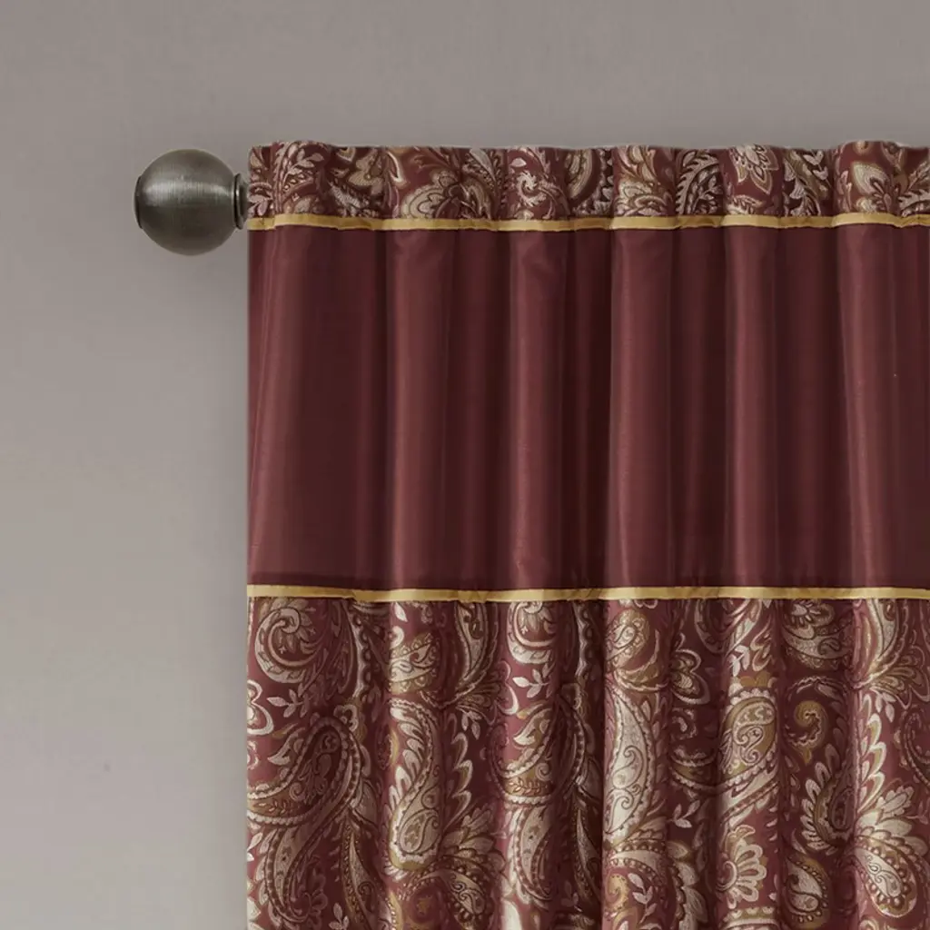 For a luxuriously classic style, our window curtain Pair is the perfect touch to your decor. The alluring jacquard weave is inspired from an updated paisley motif and is woven in beautiful hues of burnt red, gold, and a hint of platinum for a shimmering accent. The window panels are pieced with solid faux silk and beautiful flat piping details in gold, creating an elegant look.