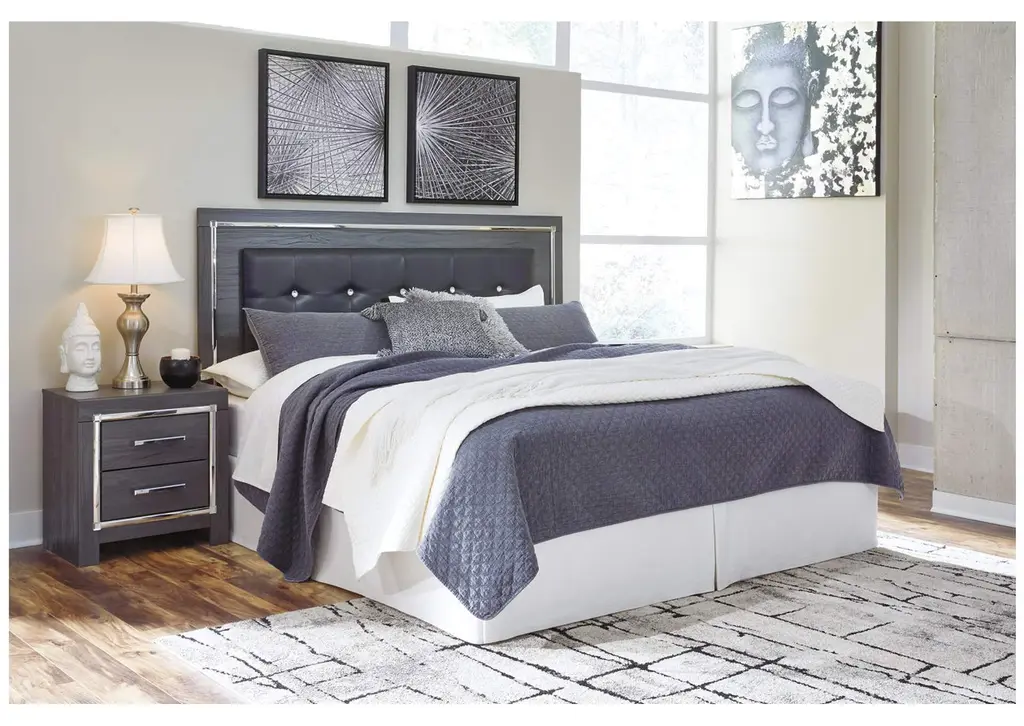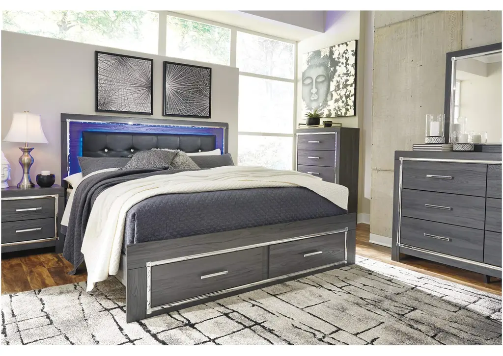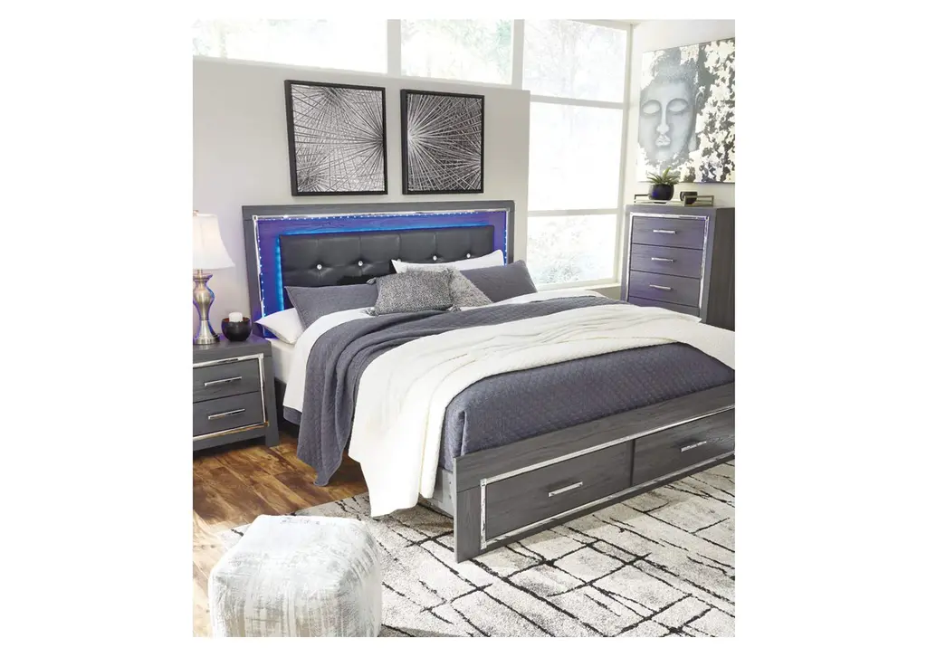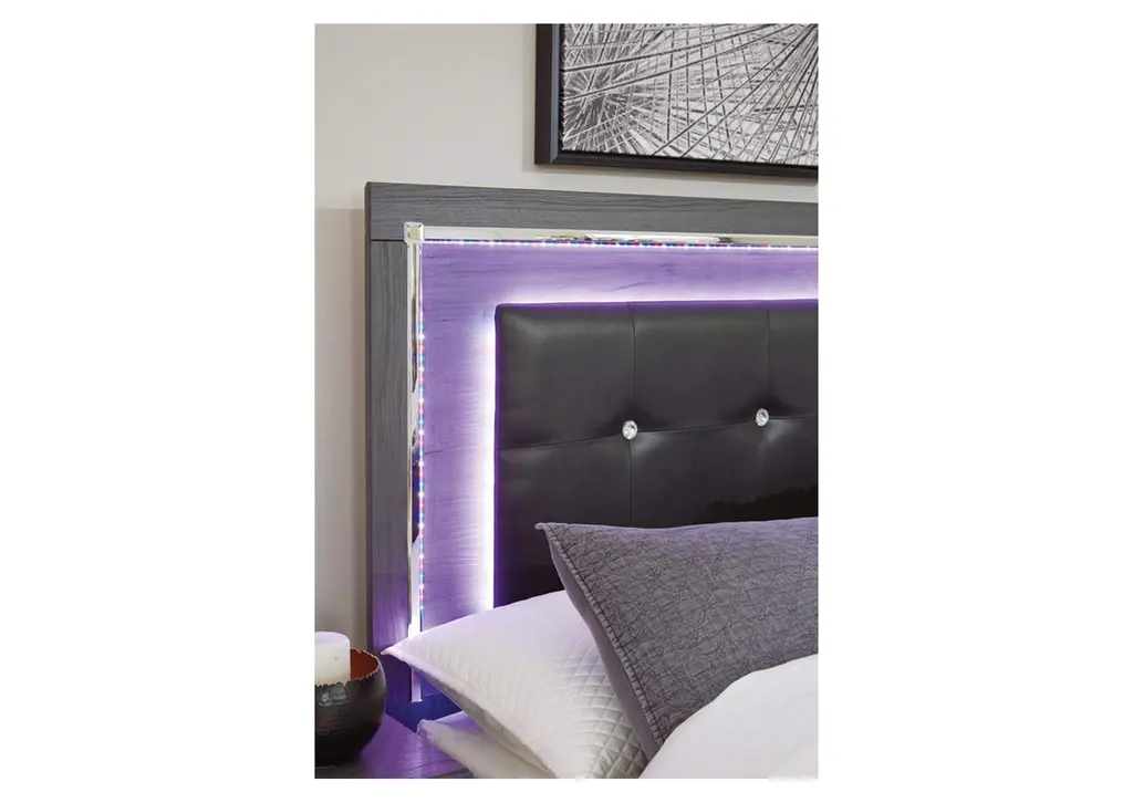 Reminiscent of Hollywood glamour of yesteryear, the Lodanna king panel bed with storage interprets luxury in a decidedly modern way. Sumptuous details include button-tufted upholstery, faceted faux crystals and chrome-tone accents beautifully lit by LED lights enhanced with remote-controlled settings for color and brightness. Weight 203.000 lbs. (91.35kgs.)