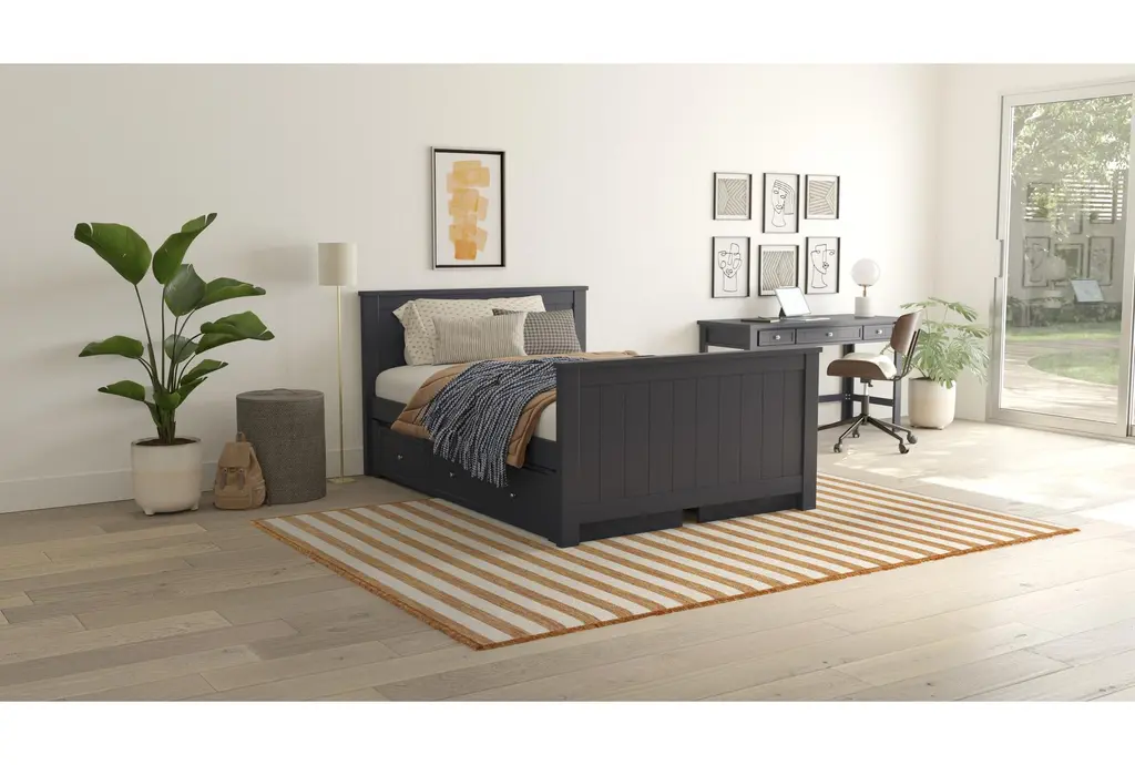 Enhance your child's bedroom with the Luca Blue Twin Wood Panel Bed with Single 3-Drawer Storage Unit. The contemporary design and rich blue color create a stylish and functional addition to any kids' room. Crafted from solid pine and MDF, this twin bed offers durability and ample storage space for a clutter-free environment.