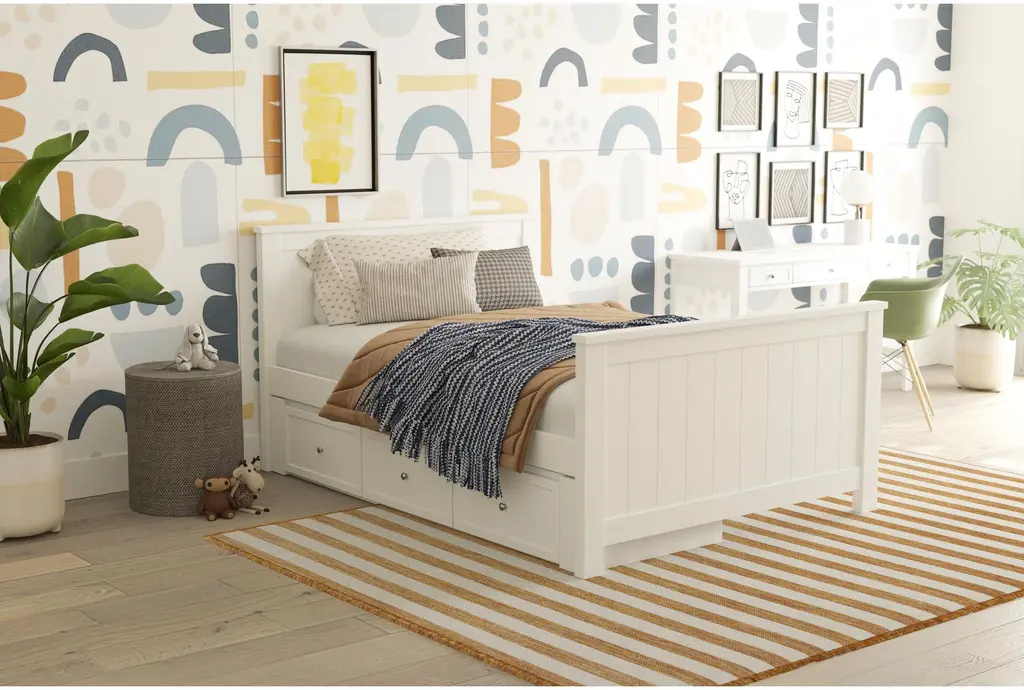 The Luca White Twin Wood Panel Bed combines contemporary style with practical storage solutions. Crafted from solid pine and MDF, this twin bed is perfect for any child's room. The sleek white finish complements a variety of decor styles, making it a versatile addition to your home.
