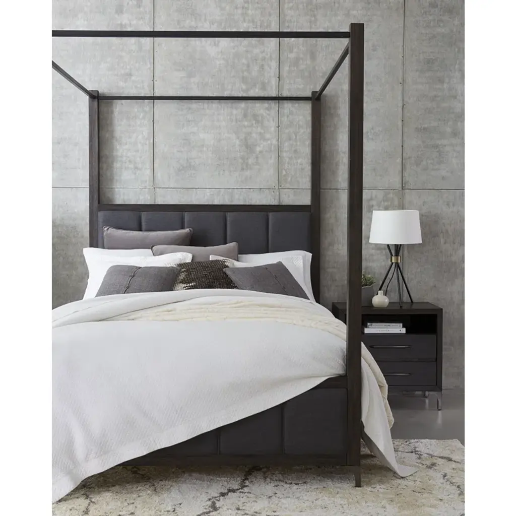 The Lucerne bedroom creates understated modern elegance with subtle details and premium finishes. Constructed from wire brushed Acacia wood, the rich Vintage Coffee finish is set off with thick angular drawer pulls and gently arched legs finished in polished gunmetal. Plush upholstered headboards are accented with welted vertical channeling and covered in a soft Brown Latte fabric.