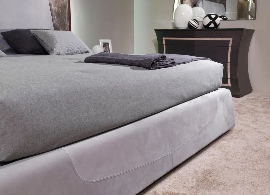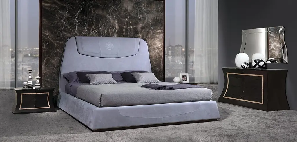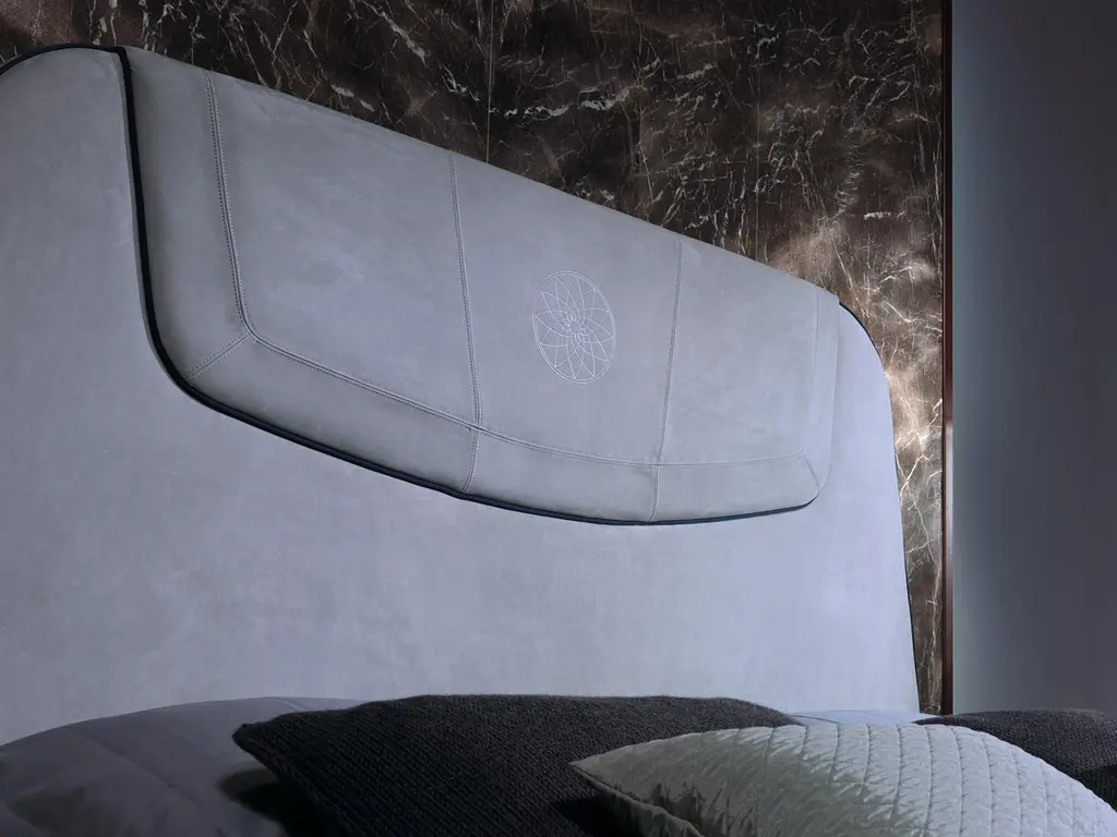 Fully upholstered bed that can be covered in leather, nabuk or fabric. The bed is characterized by an embroidery at the center of the headboard and by a crease along its entire profile. English stitching helps to draw the bed line. Multi-layered wood structure, padded with non-deformable polyurethane foam. Possibility of a container base with two adjustable lifting net or with a fixed standard flat mesh in support. Sycomoro dark stained wood base.