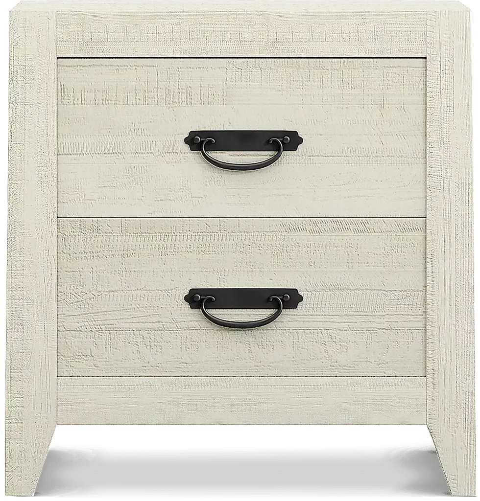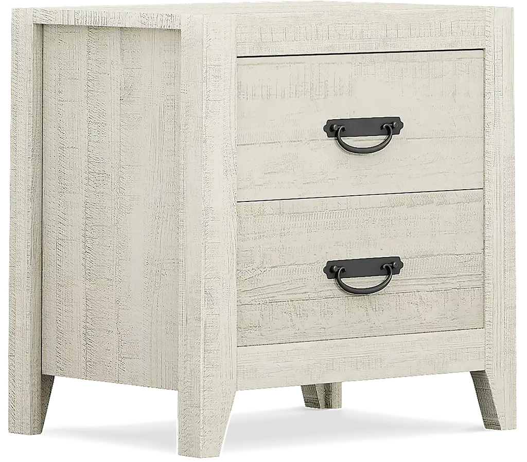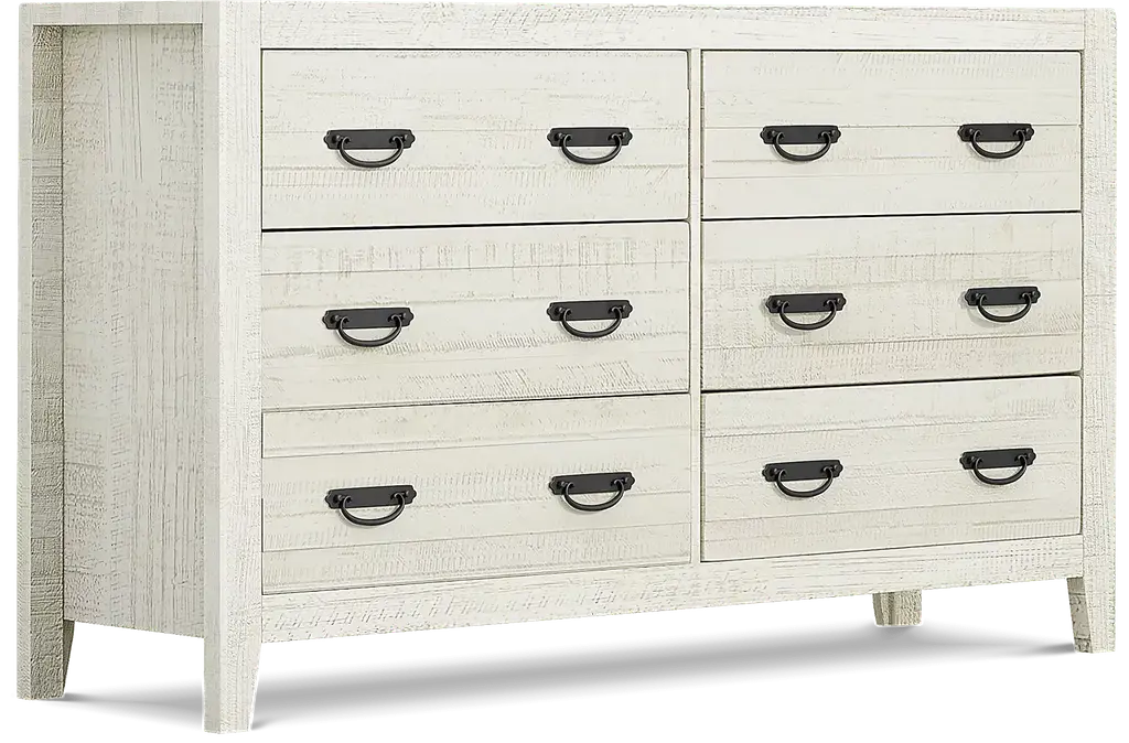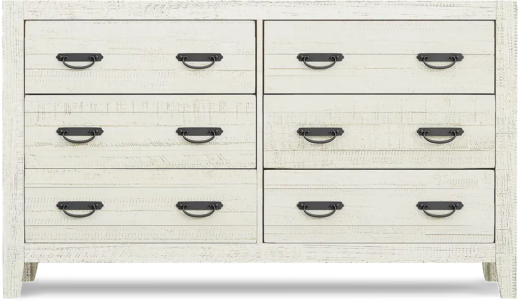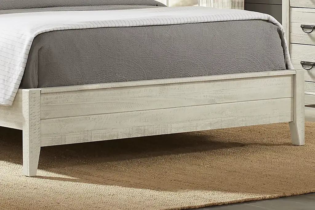 Coastal chic meets classic Arts and Crafts design on the beautiful Palm Grove collection. The bedroom, made of pine solids and pine veneers, features a white finish that's been wire brushed to create a charming rustic look. Weathered plank detailing on the bed's headboard and low footboard contributes to the casual aesthetic, while straight lines and antique brass finished hardware lend classic Mission style details. Mattress and foundation (if required) sold separately.